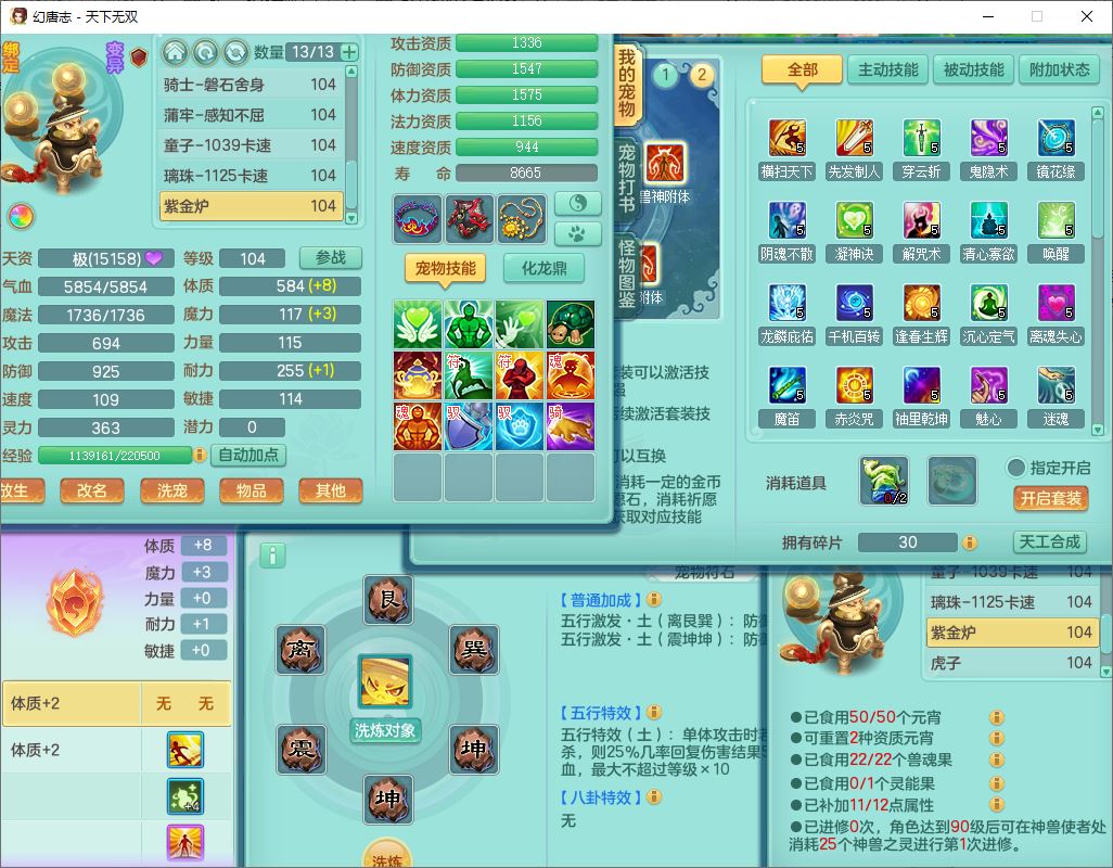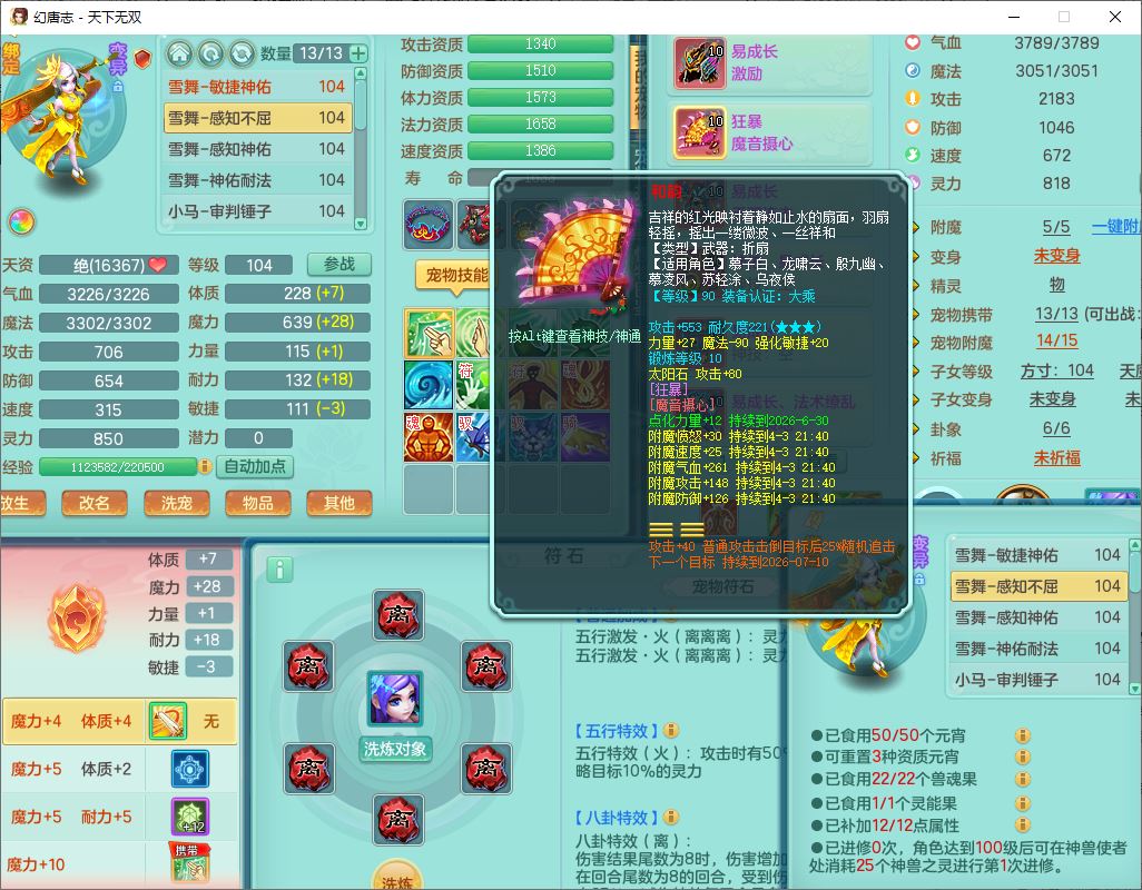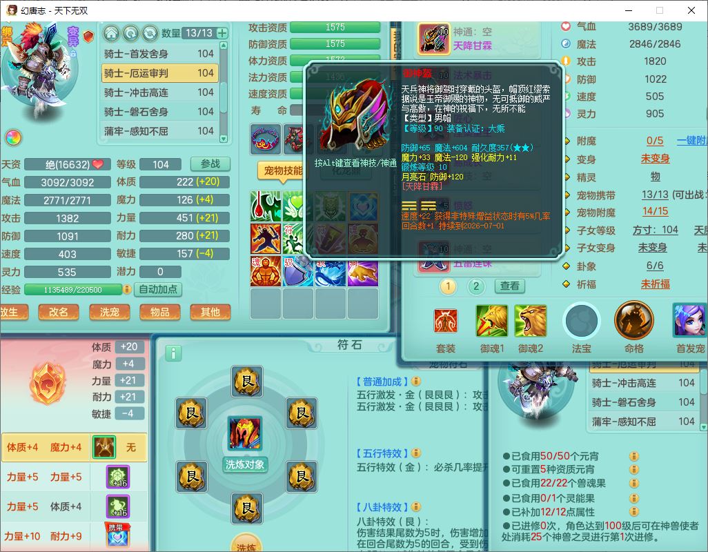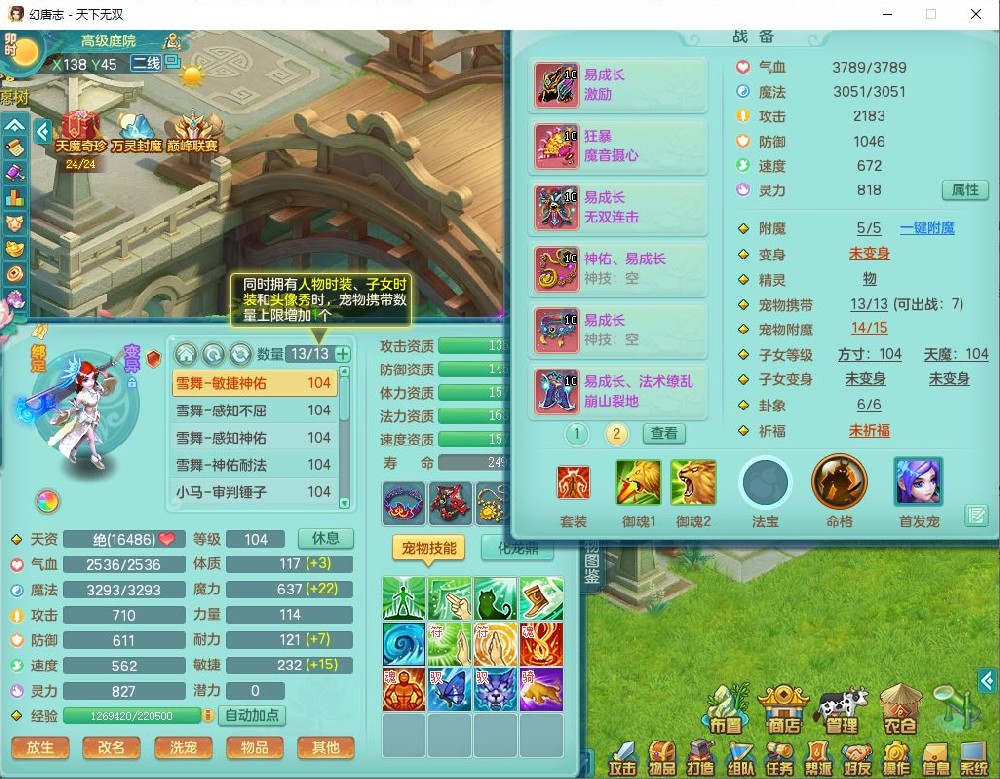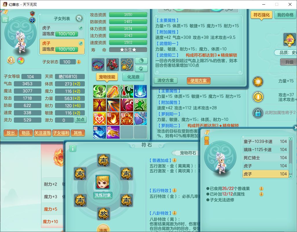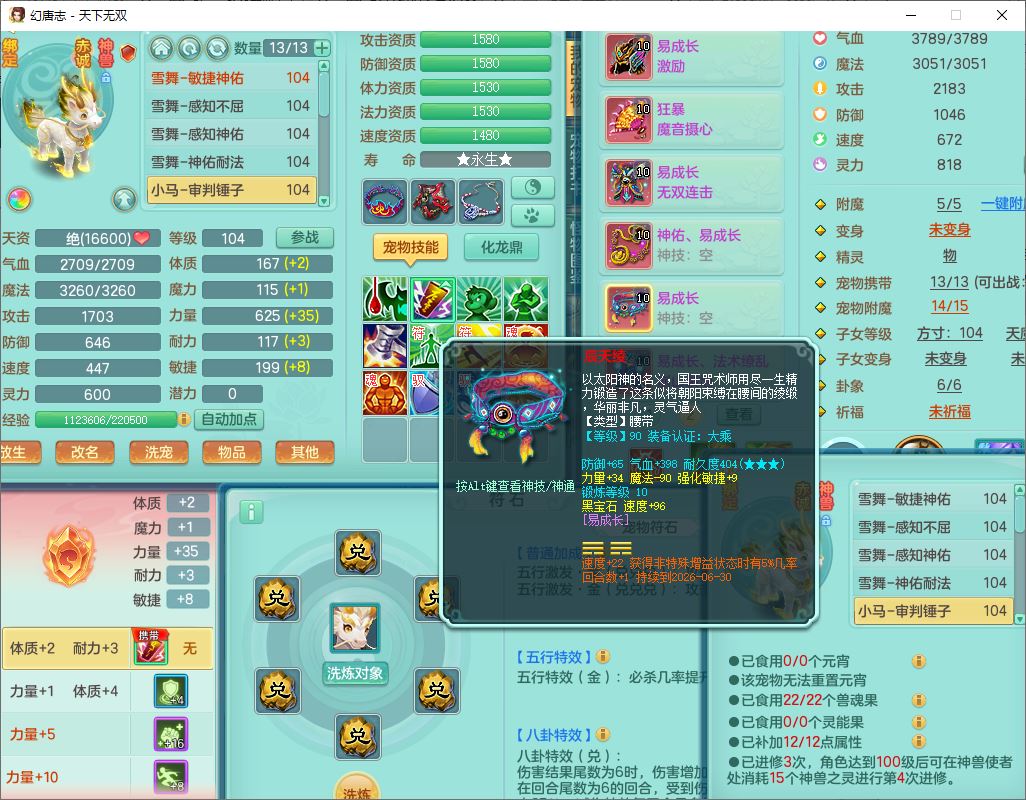 tx10146天下无双99男万兽【准潜龙号,差1只宝宝3条小附加】力敏、体敏、全魔精灵,1内丹龙马4翻江5舍身1童子1金炉,11觉醒8六字2五字9四字24只满果子,12红装备,Y激励帽子,狂暴魔音武器,Y破血衣服,神佑Y项链,Y法缭崩山鞋子,一套法系装备,法爆武器,匠心慈航衣服,162单加Y项链,五雷鞋子,鼎2.5+42+168,3套符石,永久外观、精灵皮肤,20个仙兽灵,48个内丹碎片,3坐骑(1双人飞行),带150奶粉