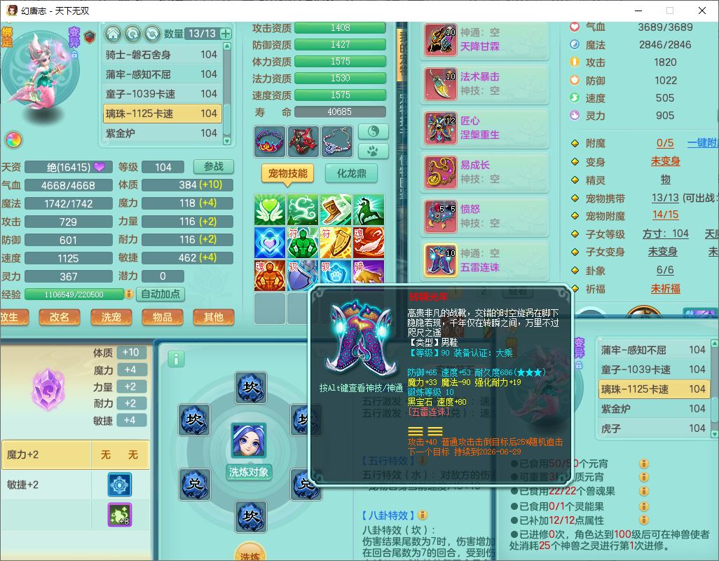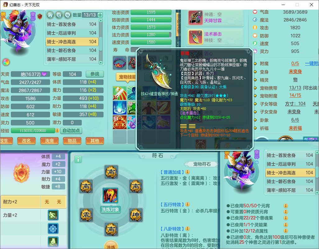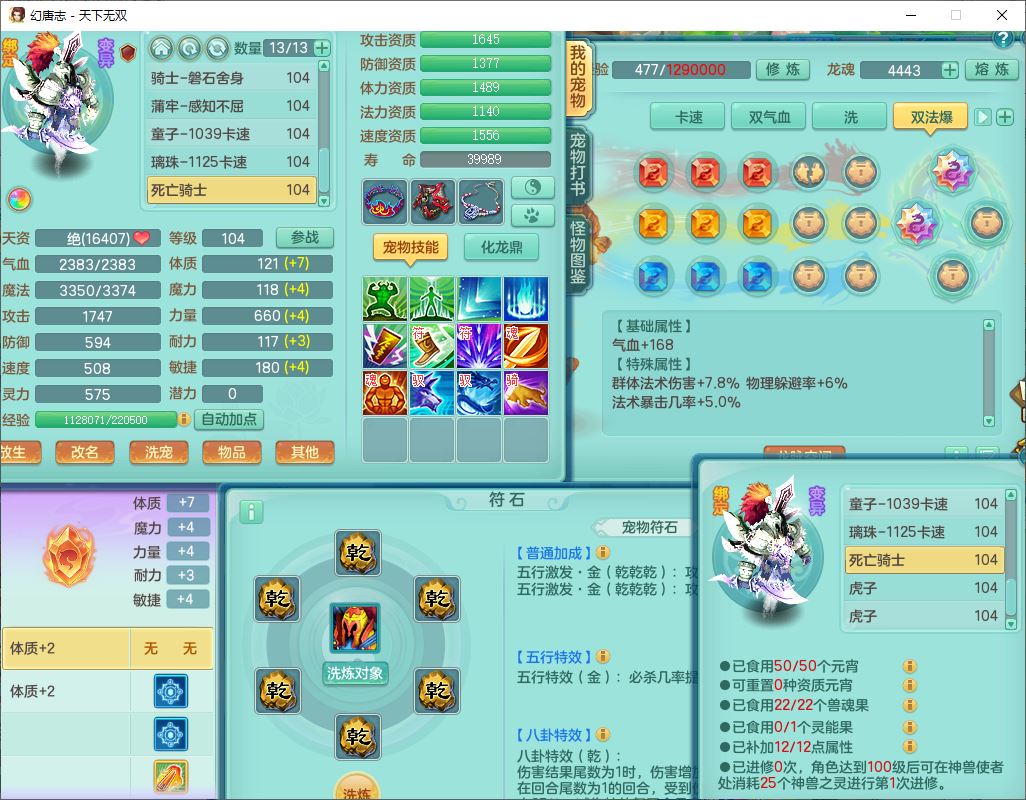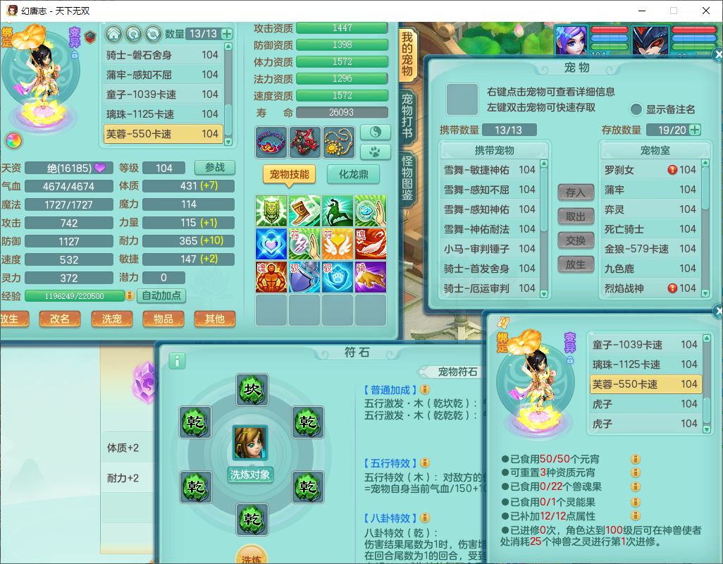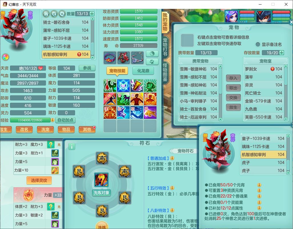 tx10146天下无双99男万兽【准潜龙号,差1只宝宝3条小附加】力敏、体敏、全魔精灵,1内丹龙马4翻江5舍身1童子1金炉,11觉醒8六字2五字9四字24只满果子,12红装备,Y激励帽子,狂暴魔音武器,Y破血衣服,神佑Y项链,Y法缭崩山鞋子,一套法系装备,法爆武器,匠心慈航衣服,162单加Y项链,五雷鞋子,鼎2.5+42+168,3套符石,永久外观、精灵皮肤,20个仙兽灵,48个内丹碎片,3坐骑(1双人飞行),带150奶粉