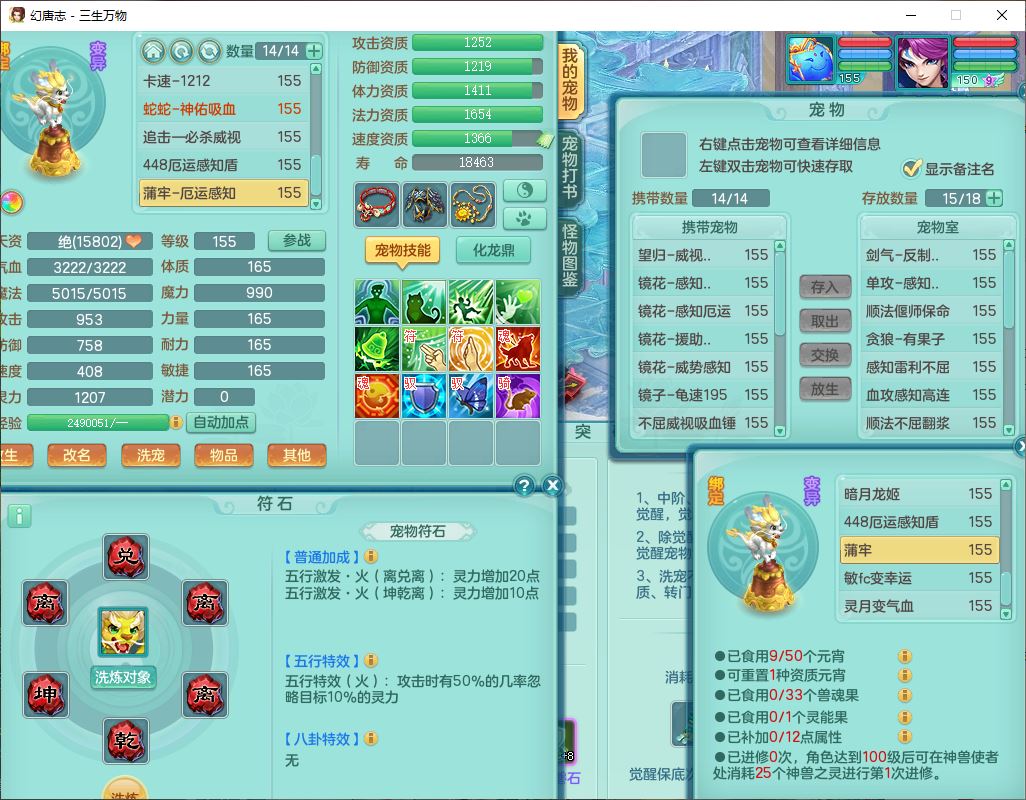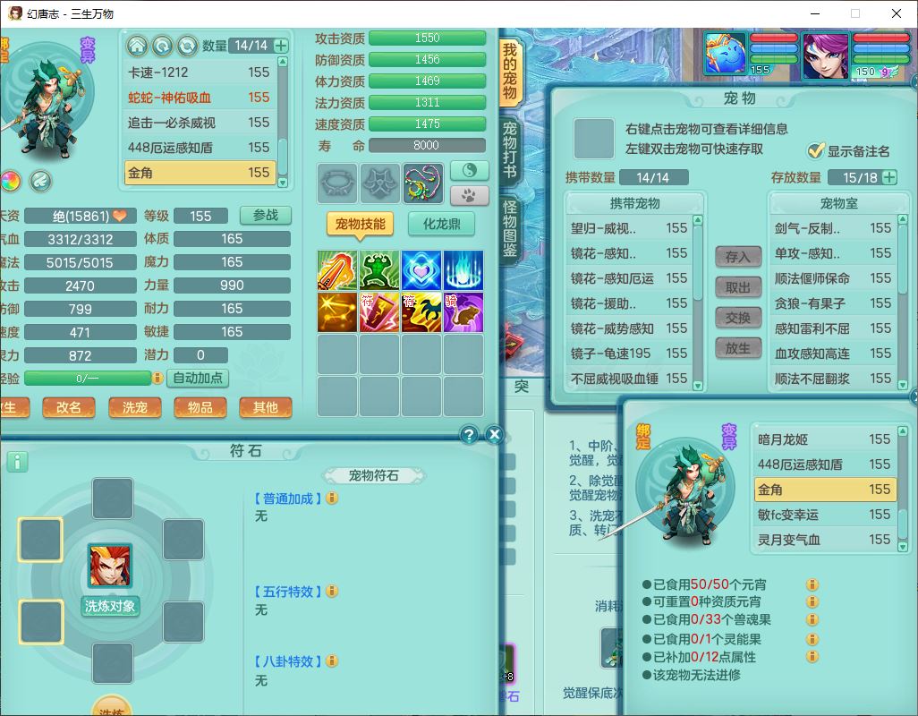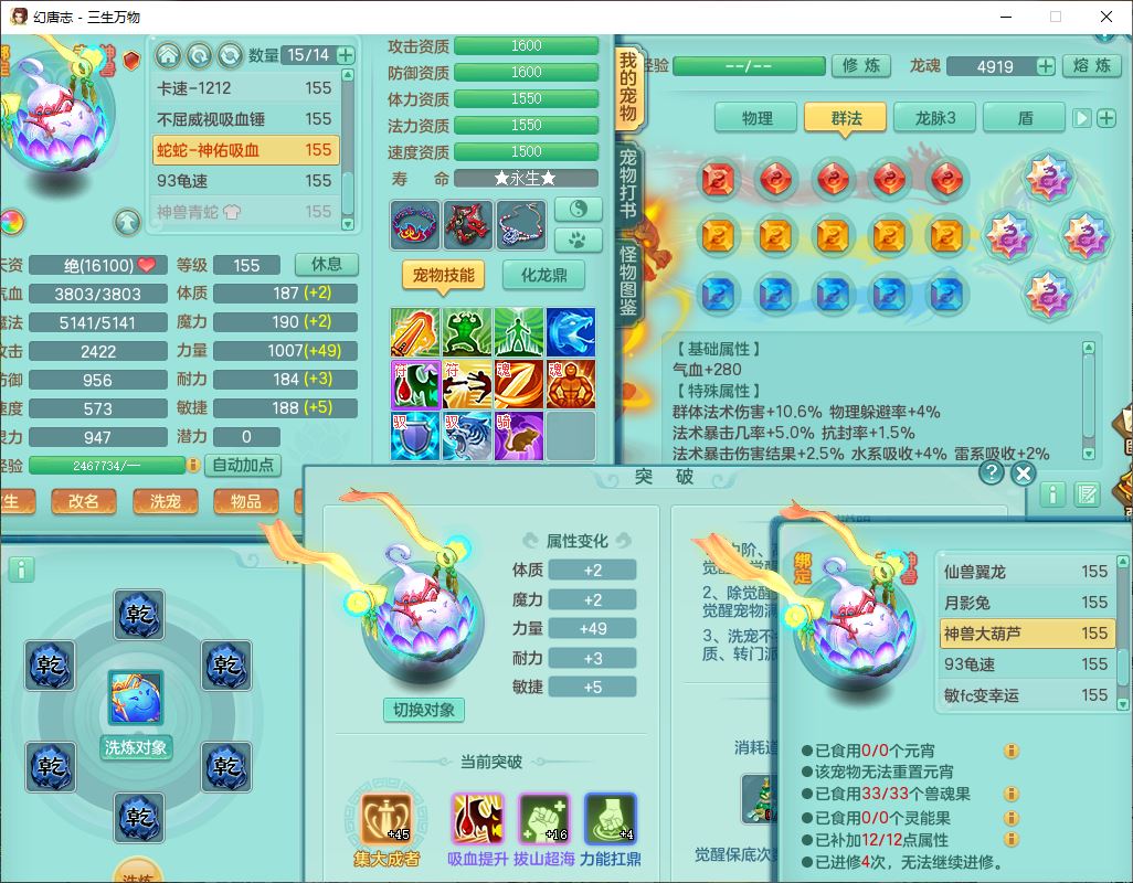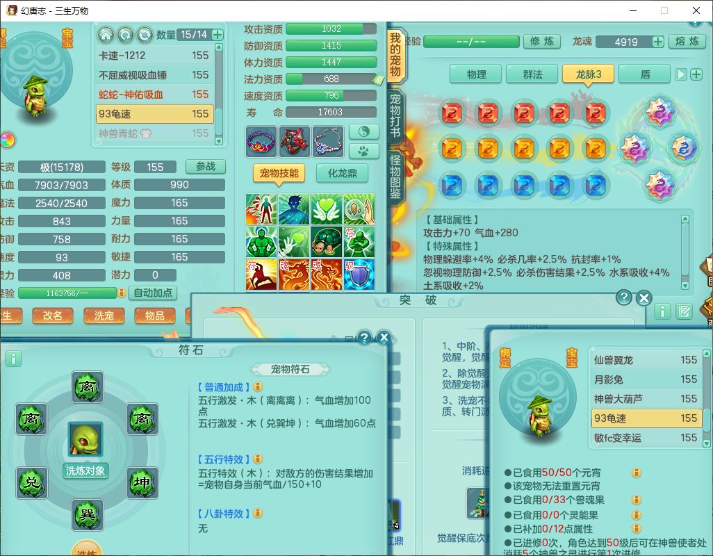 ss10148三生万物159男万兽【暴龙泰坦+马上发财+火焰之力+西瓜冰+潜龙号】精灵歌,1龙(换、无内)2神兽(1青蛇,1无内、带蛇影)1望归5镜花1龙姬,9觉醒3宠皮7六字4四字综合12只满果子,7红装备,必杀破血武器,崩山衣服,有法系装,五雷帽子,260Y项链,法缭鞋子,鼎5.5+70+280,冰晶庭院166房屋174,永久外观、精灵皮肤,103W神武币,1神兽内丹,4坐骑