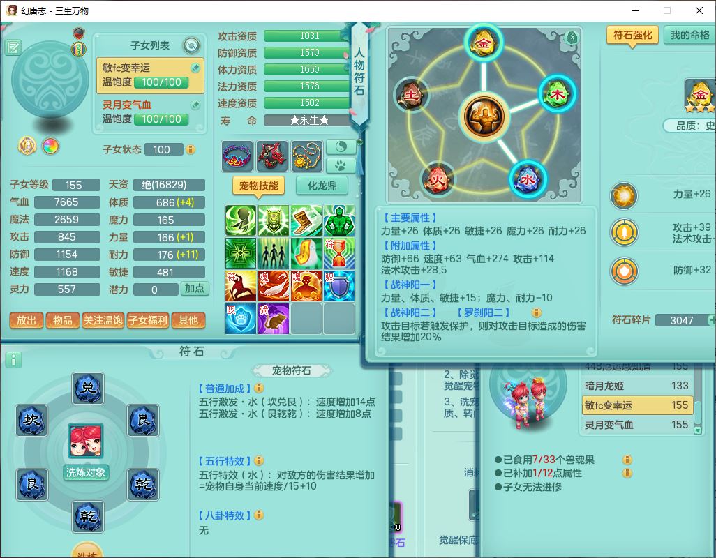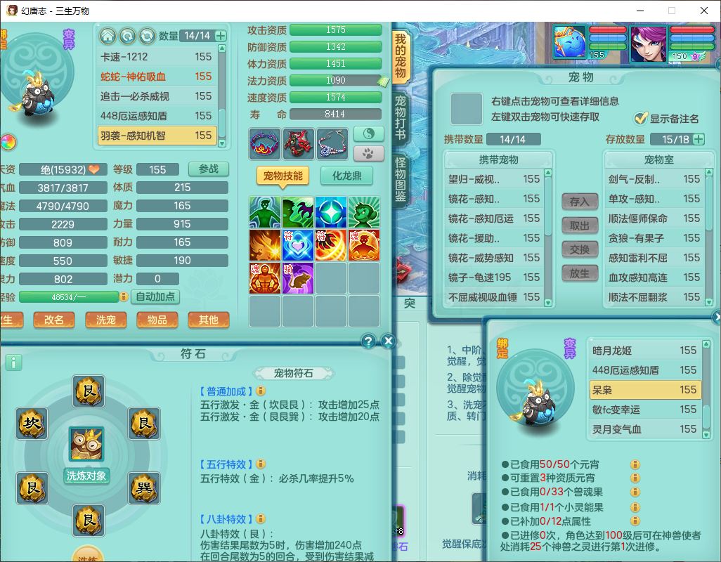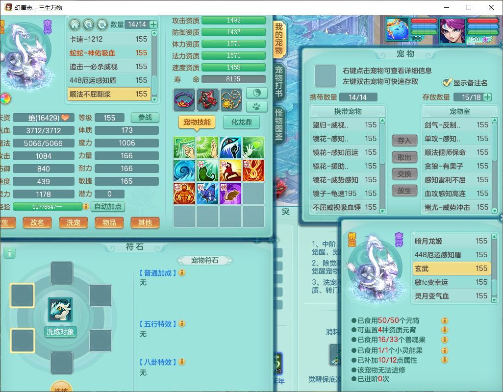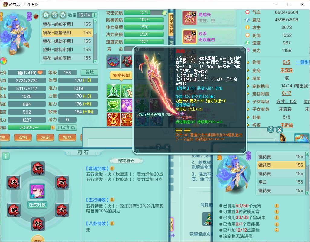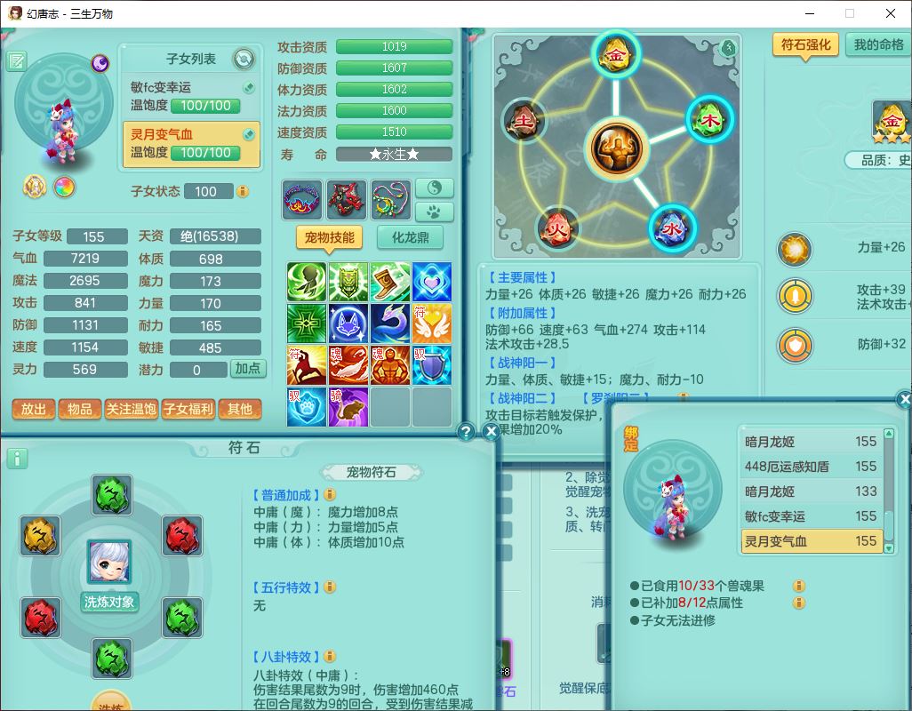 ss10148三生万物159男万兽【暴龙泰坦+马上发财+火焰之力+西瓜冰+潜龙号】精灵歌,1龙(换、无内)2神兽(1青蛇,1无内、带蛇影)1望归5镜花1龙姬,9觉醒3宠皮7六字4四字综合12只满果子,7红装备,必杀破血武器,崩山衣服,有法系装,五雷帽子,260Y项链,法缭鞋子,鼎5.5+70+280,冰晶庭院166房屋174,永久外观、精灵皮肤,103W神武币,1神兽内丹,4坐骑