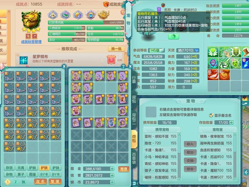 cf10164超凡入圣159男无量精灵歌,3龙(1龙没内),2内胆神(1蛇1马),【10只觉醒,已潜龙】,4位靓号不含4,4宠皮,4只六技能镜花灵,1只6技能龙姬,1特殊(祈雨),愤怒单加51腰带,回春武器,有物理装备,易成长崩山单加头,918易成长单加武器,易成长破血衣服,迅捷四海单加鞋子,5.5基础鼎+70攻+280血,13永久格子,7个纯六字,2个五字,综合23只满果子,背包40神兽内丹碎片,宠排在榜,修炼在榜,4个坐骑,暴龙泰坦+西瓜冰武器皮肤+火焰之力,带187天月卡