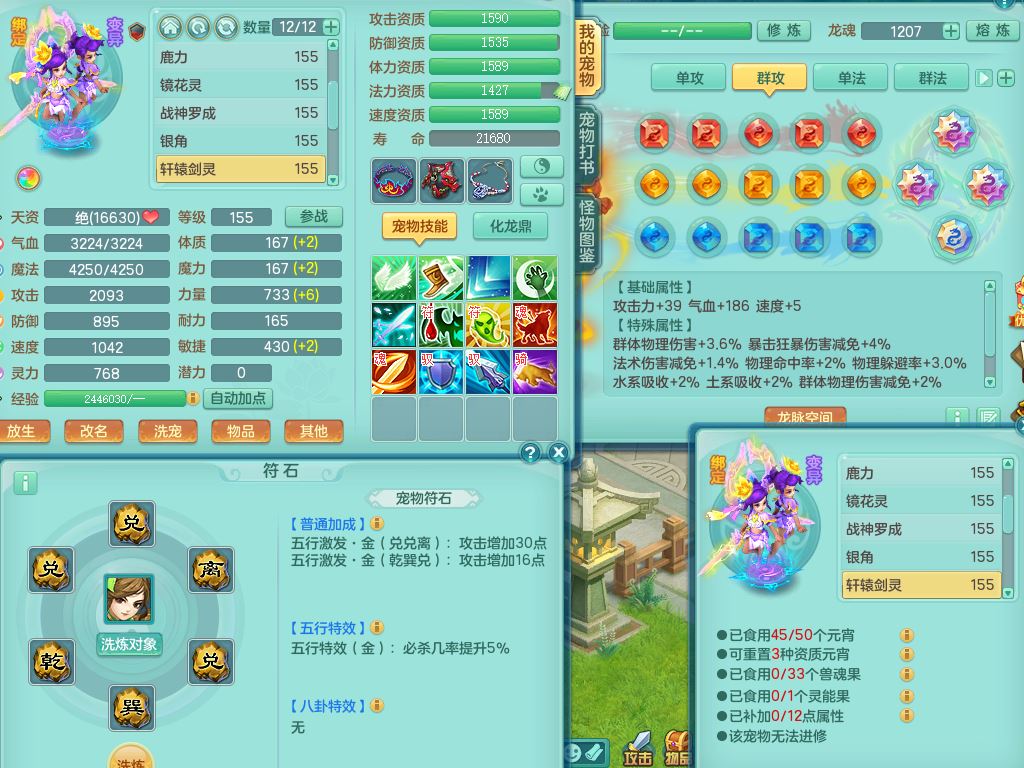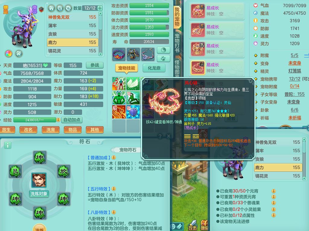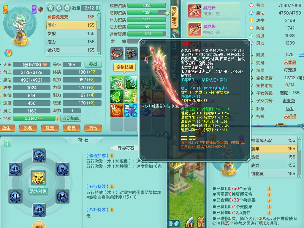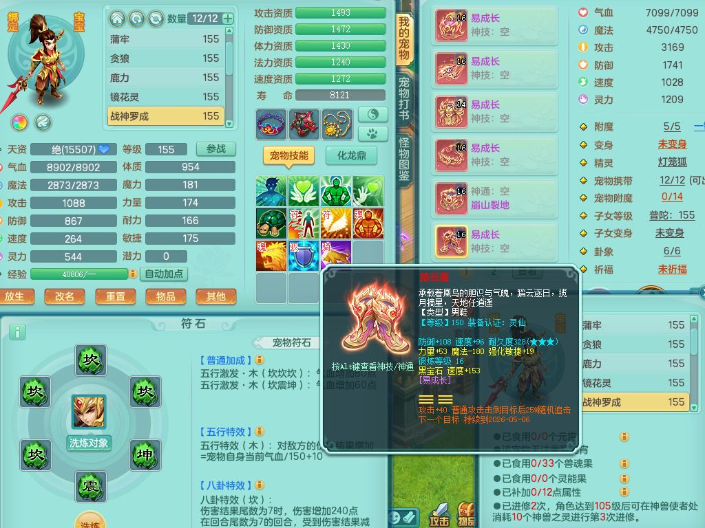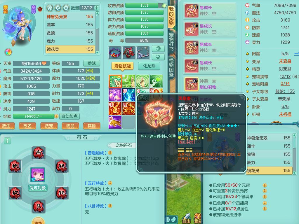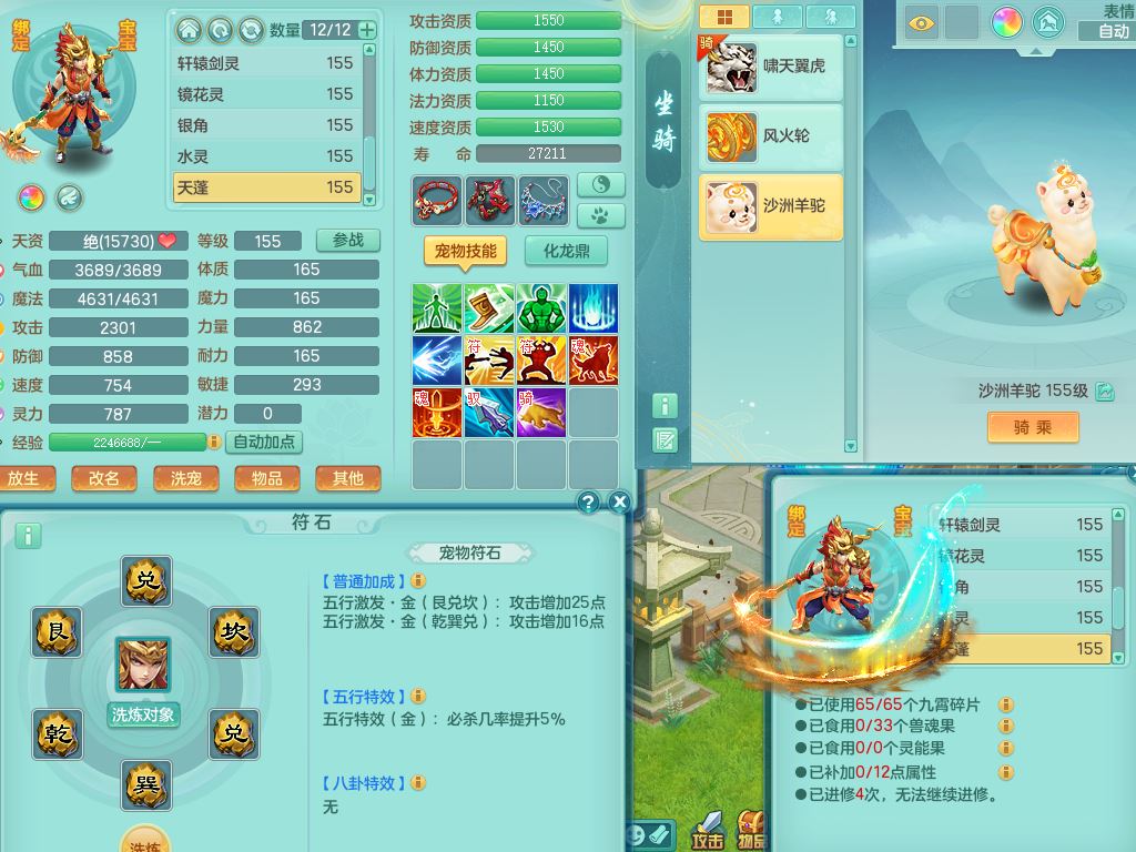 tx10157天下无双159男万兽精灵歌,1神兽(无内)特殊以战兽决,4个4字,全身单加,崩山腰带,其余全高属性单加Y,鼎4.5,永久头饰精灵皮肤,666W神武币,24内丹碎片,飞行双人坐骑
