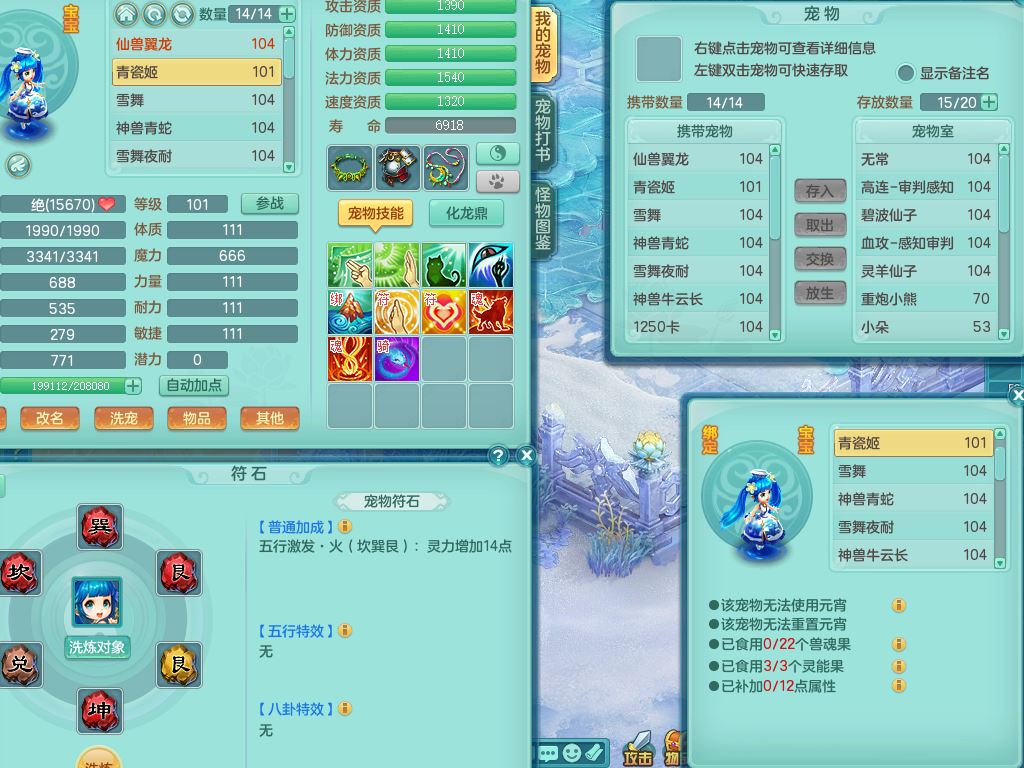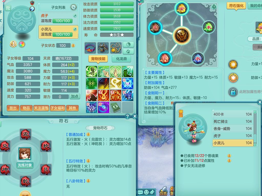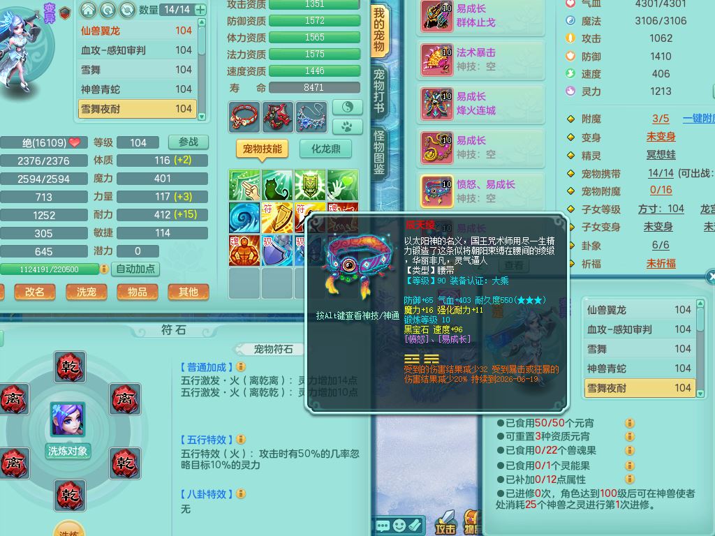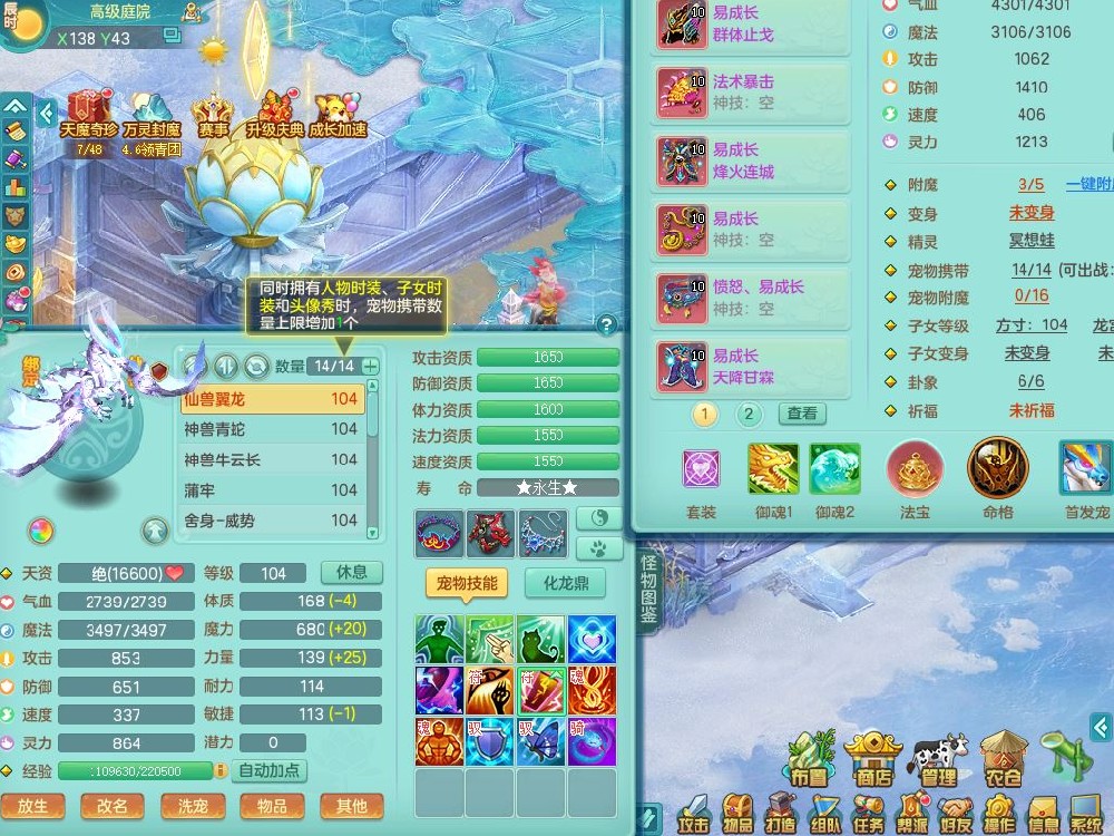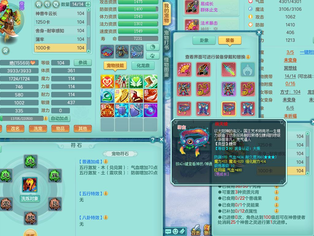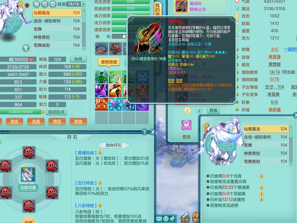 zn10174周年相伴99男龙宫全魔精灵,1龙2内(青蛇)4翻江3舍身1建木1童子2宠皮,2四字,10红装备,Y群体止戈帽子,Y烽火衣服,愤怒Y腰带,Y四海鞋子,躲避崩山衣服,坚毅慈航项链,匠心烽火鞋子,鼎1.5,11天月卡,冰晶庭院,永久外观饰物、精灵皮肤,1双人飞行坐骑