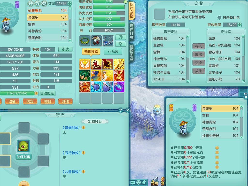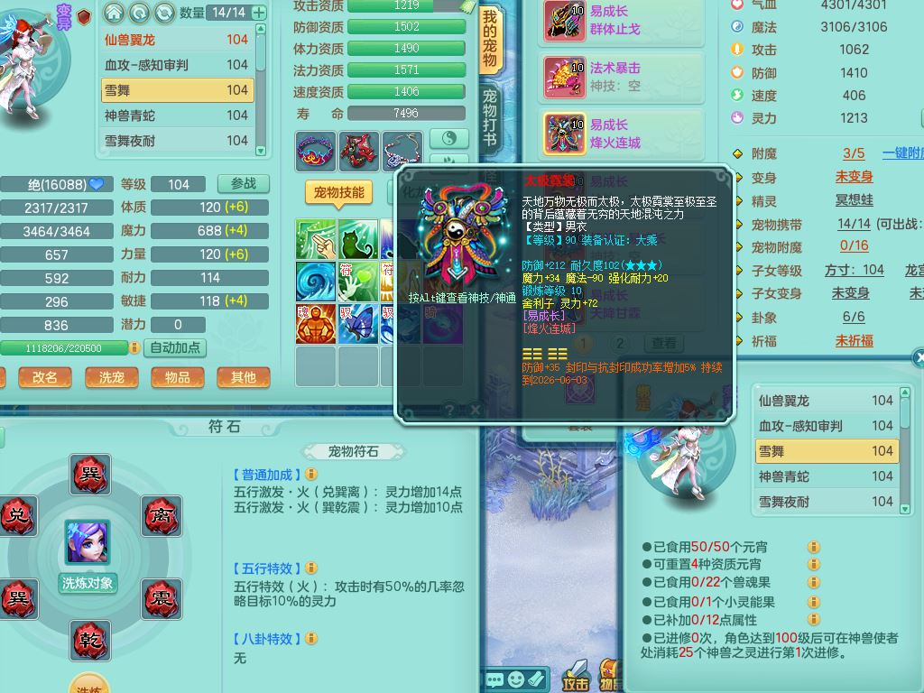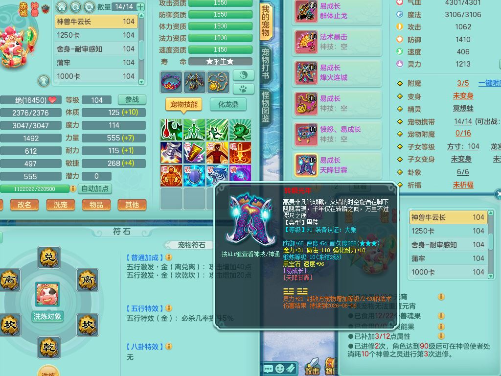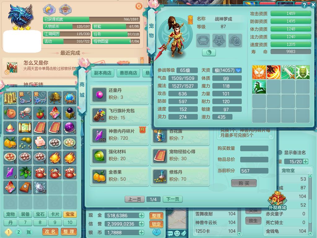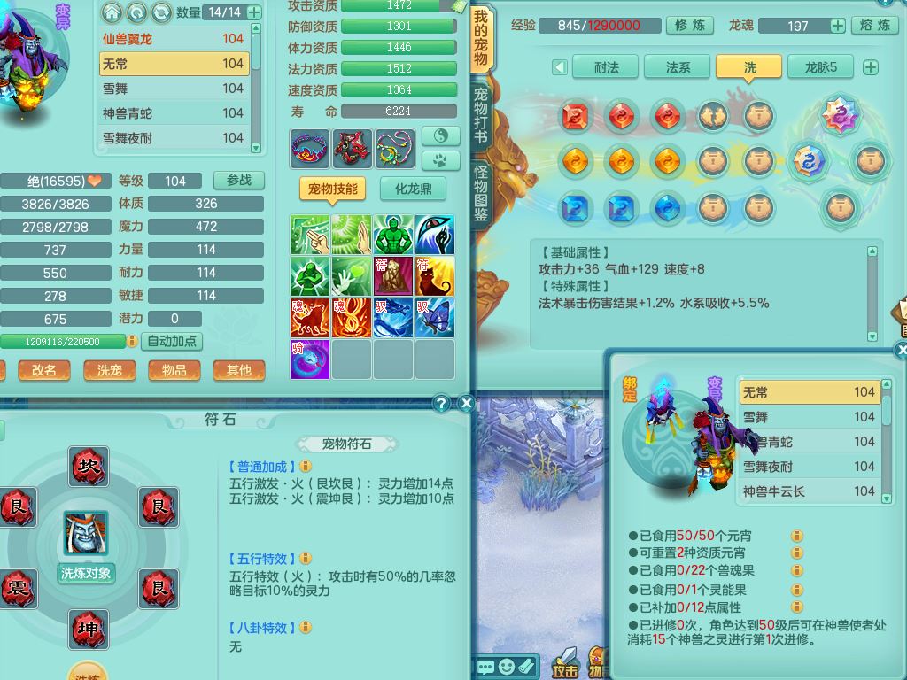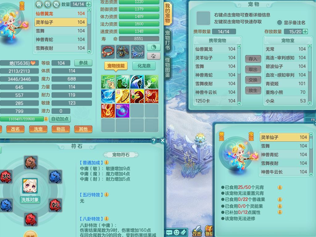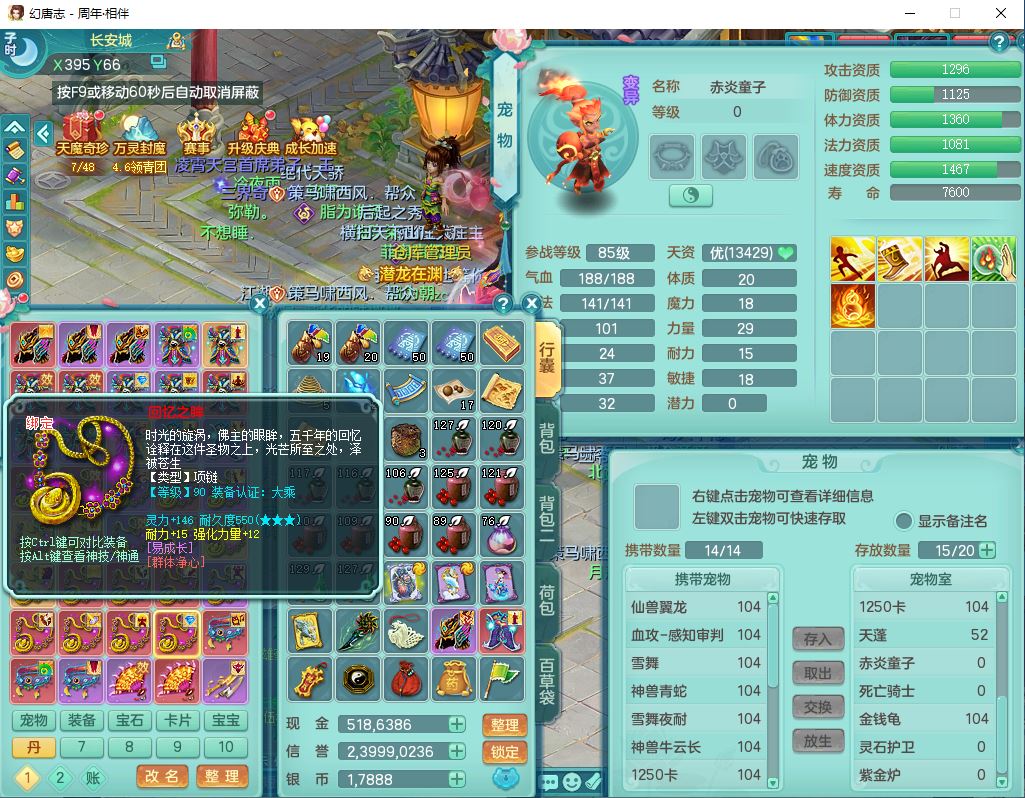 zn10174周年相伴99男龙宫全魔精灵,1龙2内(青蛇)4翻江3舍身1建木1童子2宠皮,2四字,10红装备,Y群体止戈帽子,Y烽火衣服,愤怒Y腰带,Y四海鞋子,躲避崩山衣服,坚毅慈航项链,匠心烽火鞋子,鼎1.5,11天月卡,冰晶庭院,永久外观饰物、精灵皮肤,1双人飞行坐骑