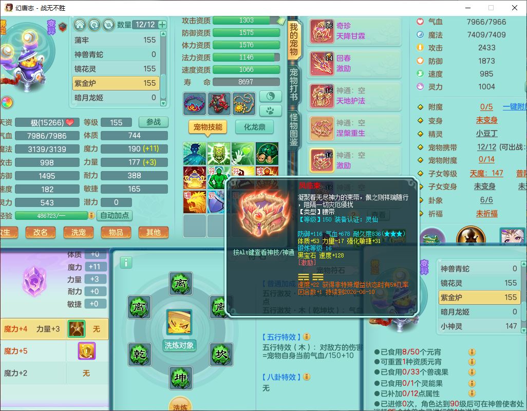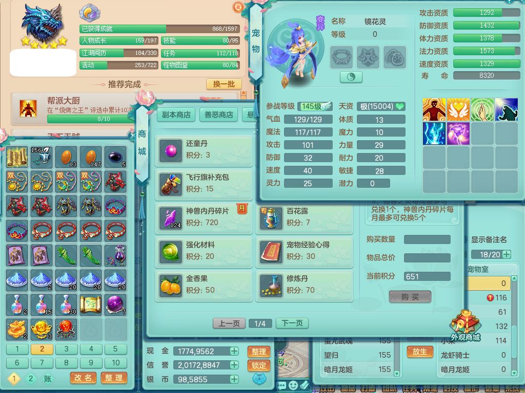 zw10184战无不胜159男五庄20J小精灵,1青蛇(无内)1望归3镜花1神石1龙姬1金炉,1五字7四字,装备齐全,必杀止戈武器,以战鞋子,一套8红辅助装,回春激励武器,鼎4.5,2套符石,1双人坐骑