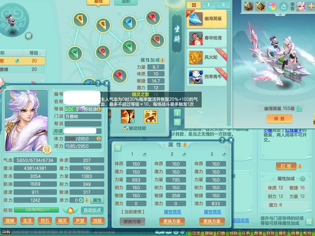 lt10171龙腾九州159男万兽精灵歌,1龙(无内)1内丹青蛇(破境)2特殊(登云/虎虎兽决)3镜花灵1龙姬,11只满果子3觉醒,全身单加,917必杀武器,坚毅四海项链,破甲鞋,鼎5.5,永久外观,12坐骑(1双人)