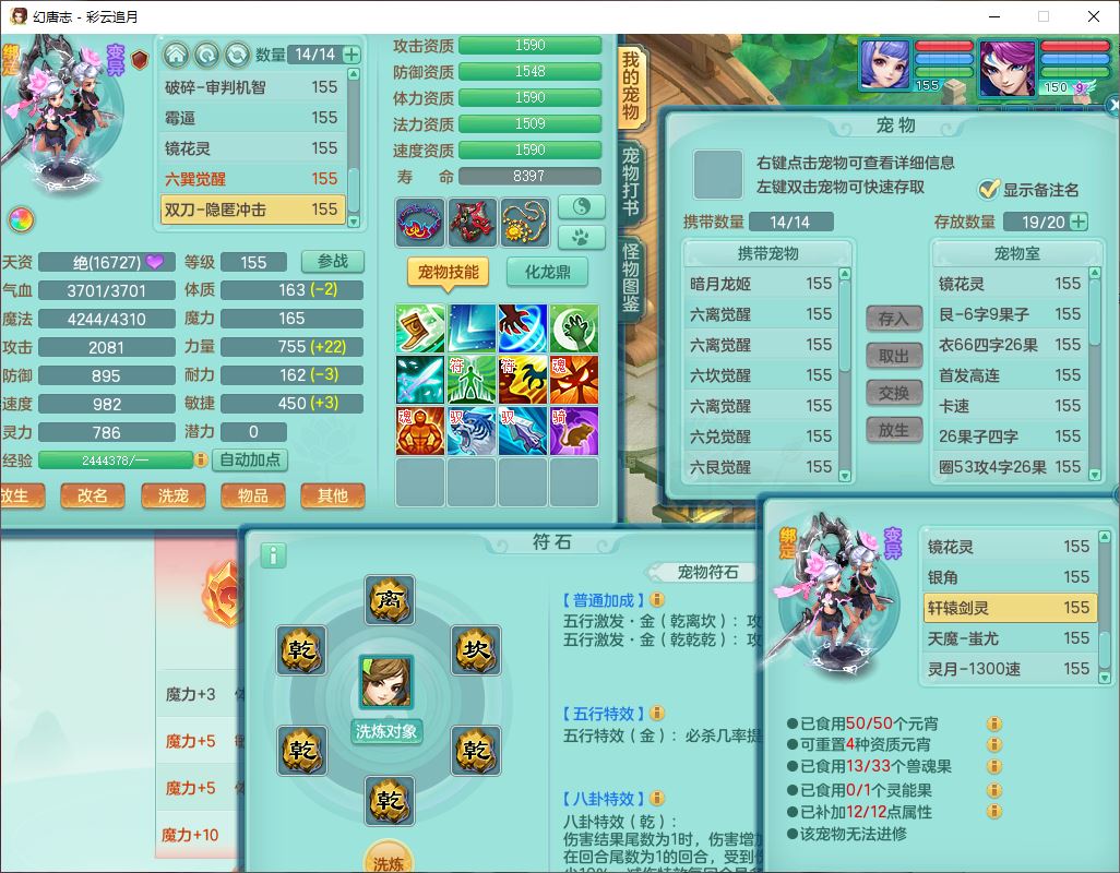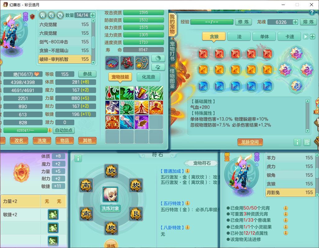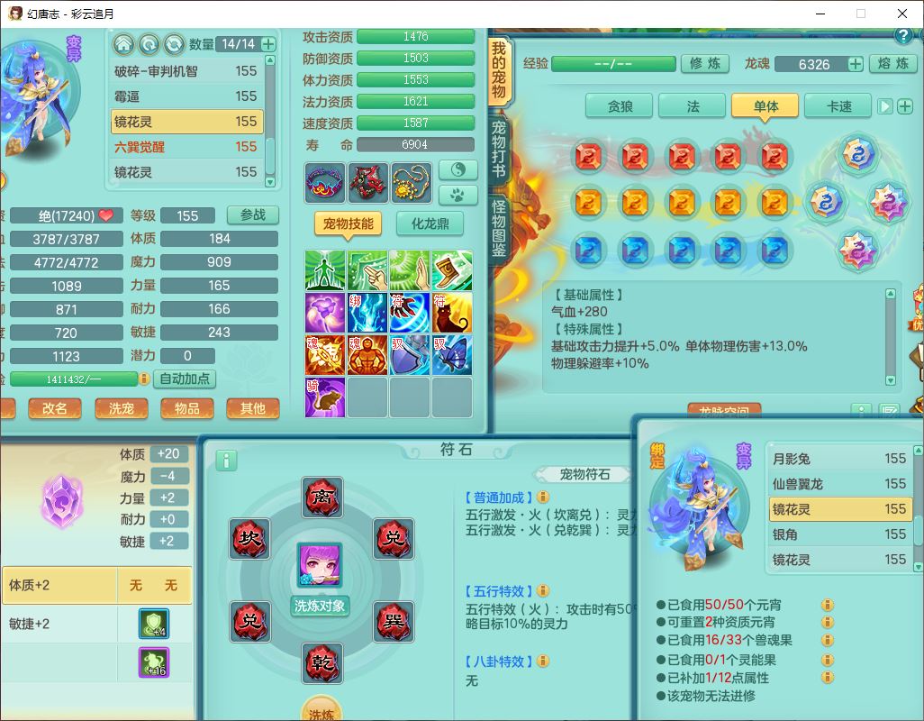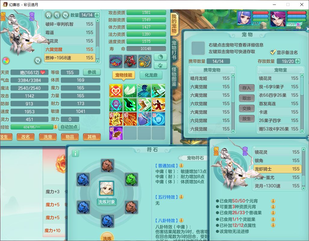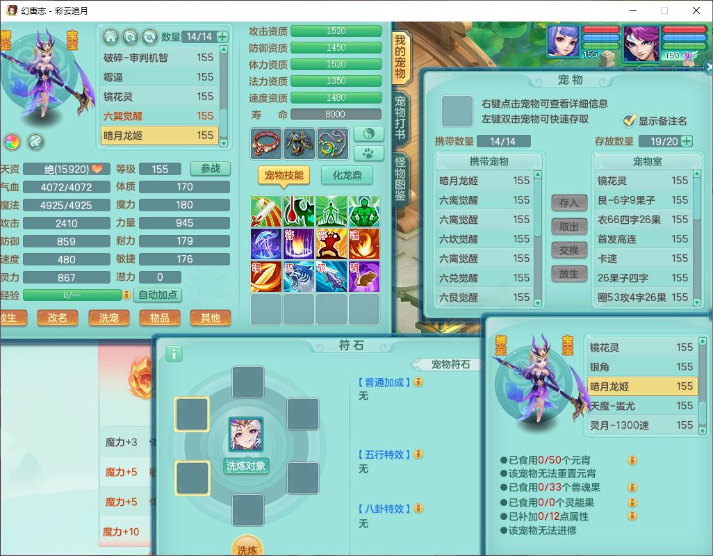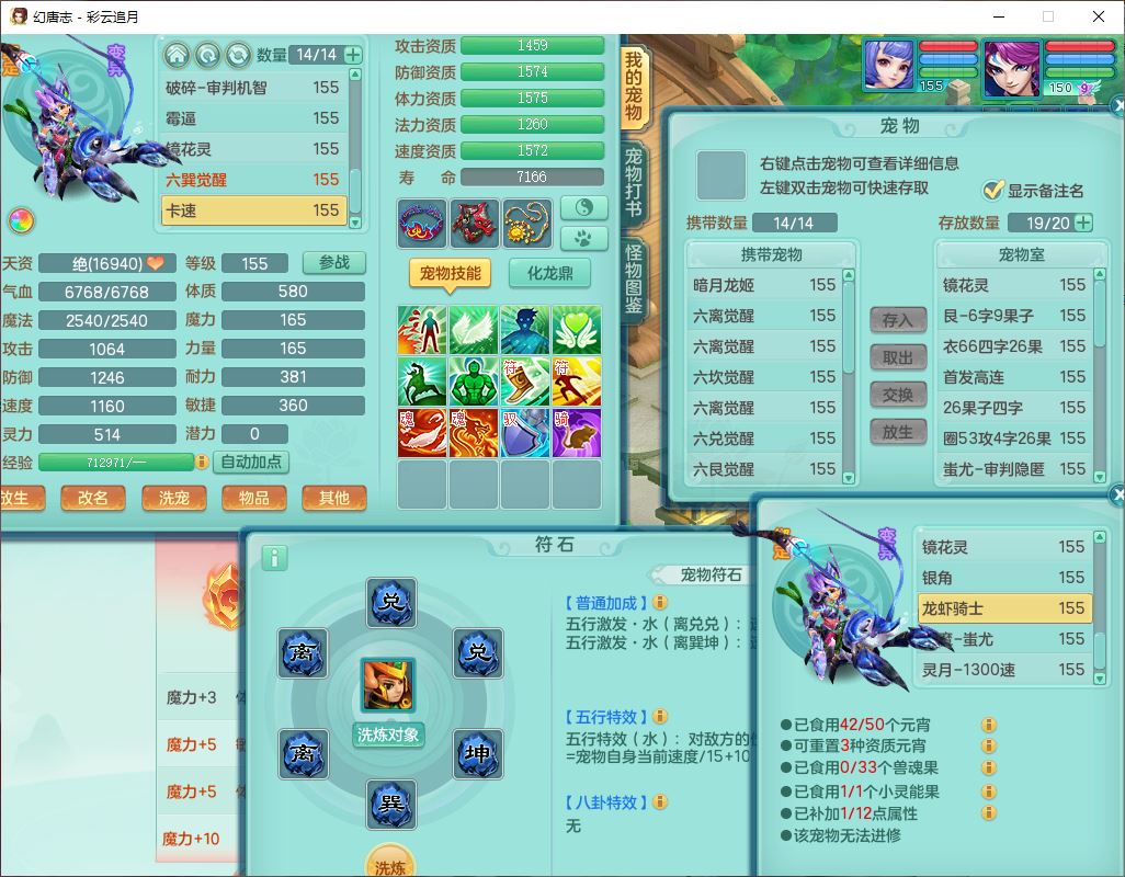 cy10238彩云追月159男万兽【潜龙号】精灵怒*2,1龙(无内)1内丹青蛇1龙姬1望归3镜花,8觉醒1宠皮7六字1五字9四字综合14只满果子,9红装备,932单加Y冥王武器,Y群体疾速腰带,法爆心神武器,鼎5.0+70+280,法爆8.7,2套符石,11个内丹碎片,1双人飞行坐骑;带159成品男五庄准精灵歌,1镜花1特殊(剑胆)8红装备,370多w神武币;带3个150奶粉