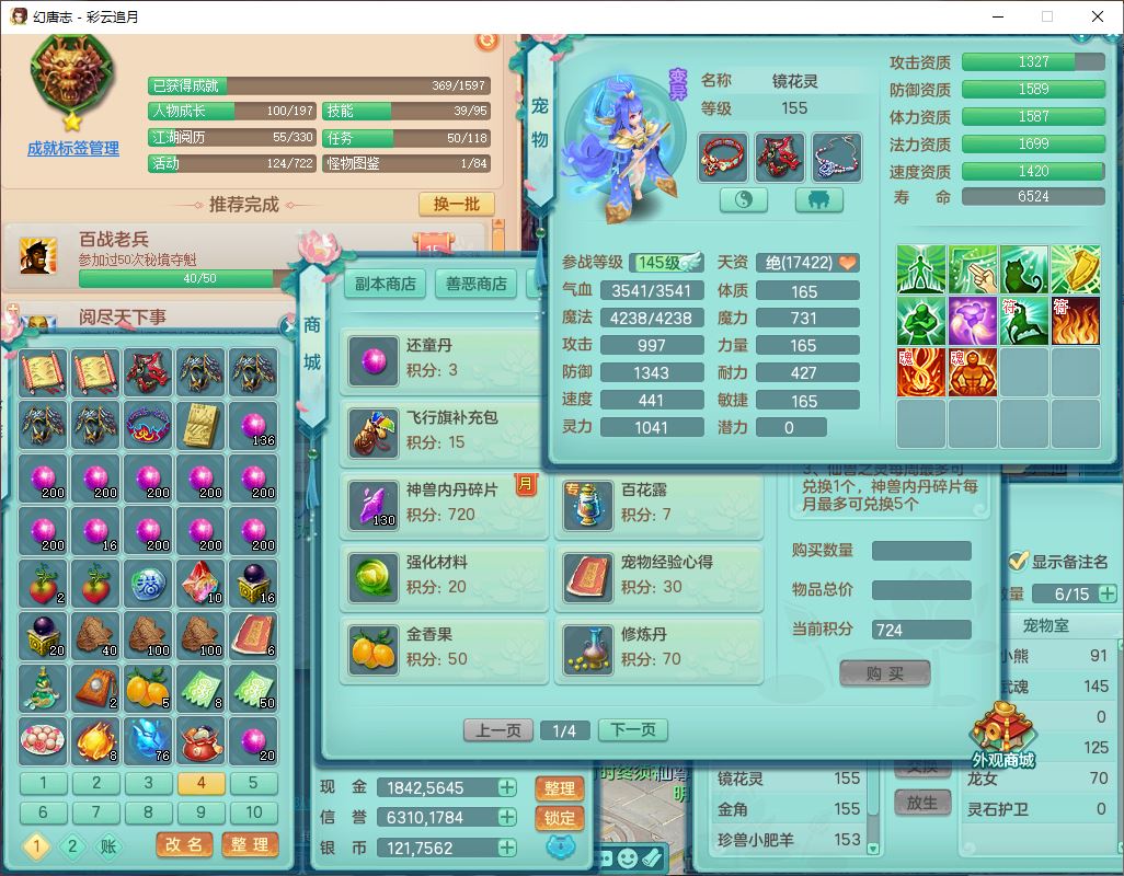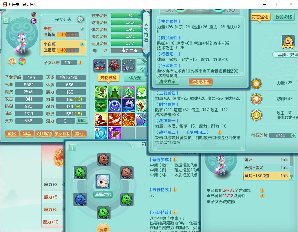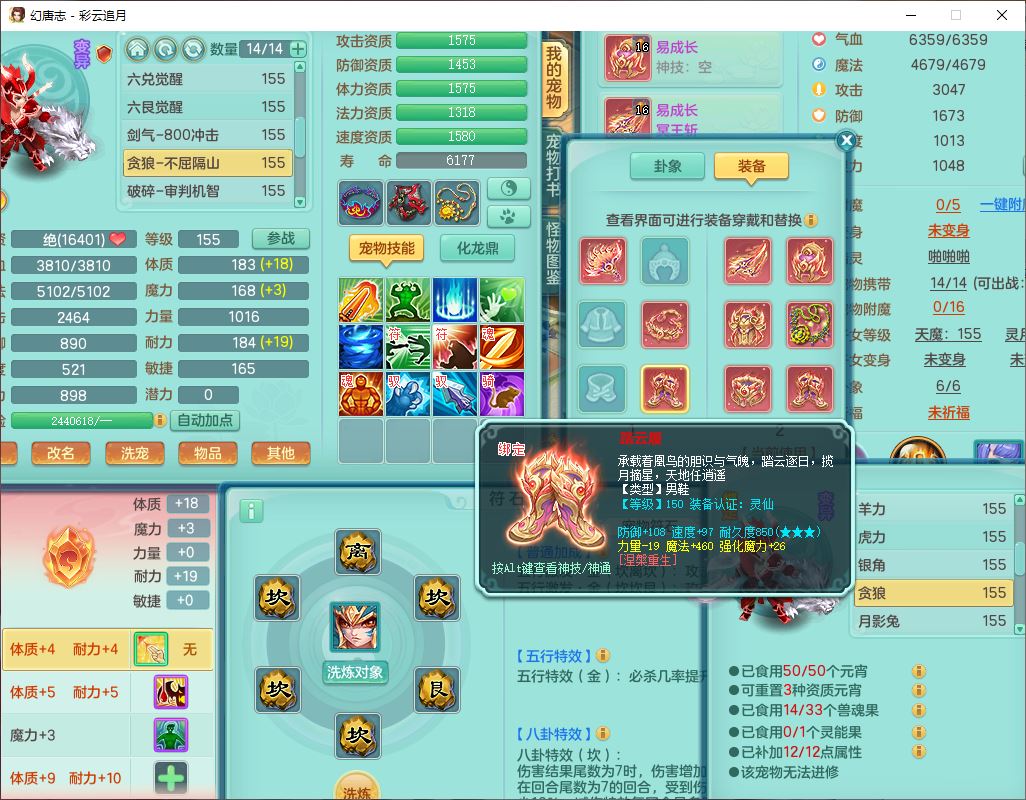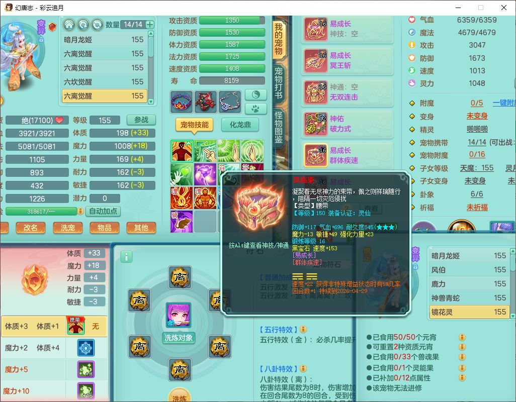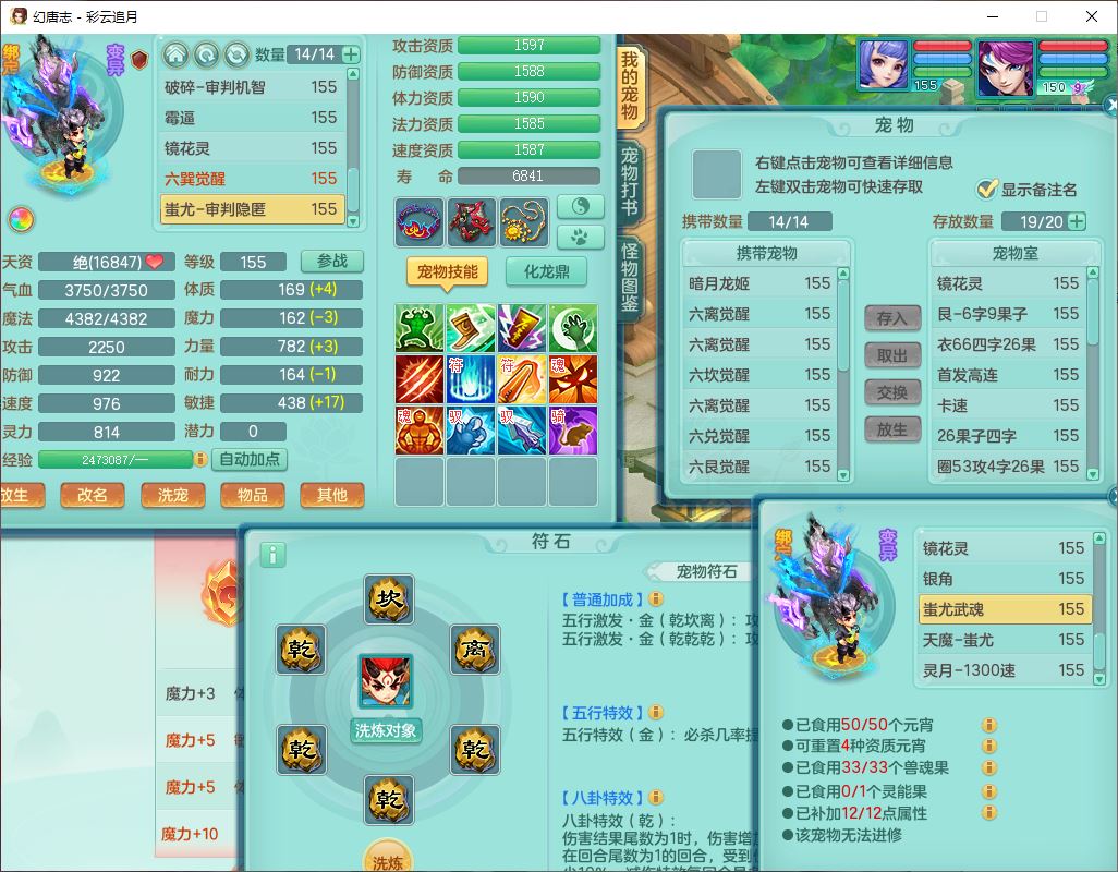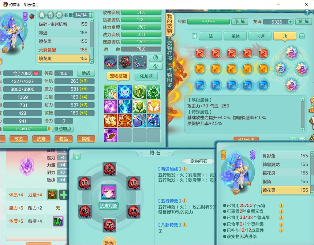 cy10238彩云追月159男万兽【潜龙号】精灵怒*2,1龙(无内)1内丹青蛇1龙姬1望归3镜花,8觉醒1宠皮7六字1五字9四字综合14只满果子,9红装备,932单加Y冥王武器,Y群体疾速腰带,法爆心神武器,鼎5.0+70+280,法爆8.7,2套符石,11个内丹碎片,1双人飞行坐骑;带159成品男五庄准精灵歌,1镜花1特殊(剑胆)8红装备,370多w神武币;带3个150奶粉