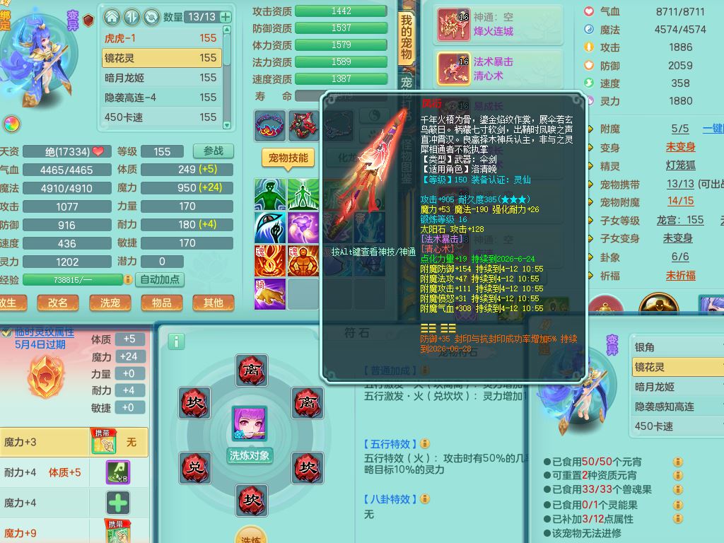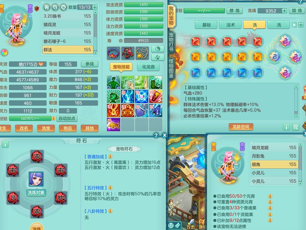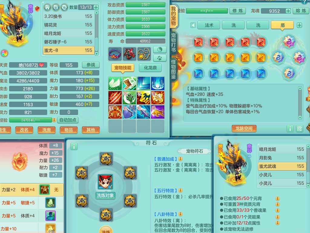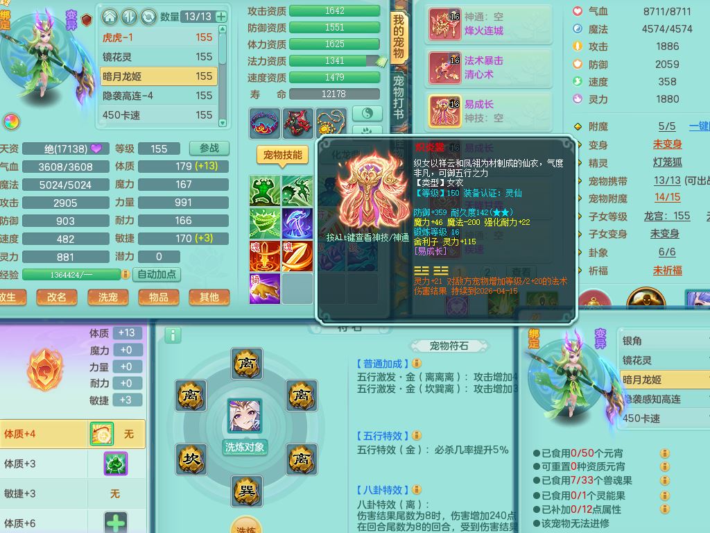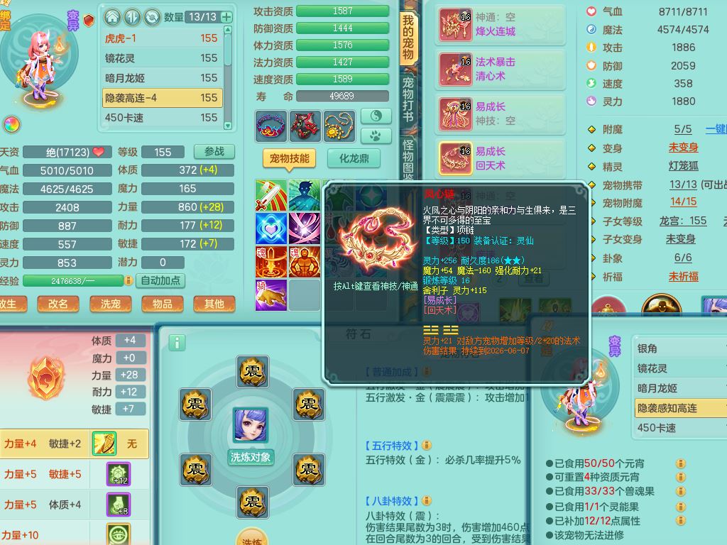 jt10250九天揽月159女魔王【潜龙号】精灵歌,1龙(无内)4特殊(虎虎/影袭/兽决焚心/荒古)2镜花灵1龙姬,13只满果子8觉醒7个纯6字,全身单加,法爆水清武器,256Y双红项链,鼎5.0+70+280,17天月卡,永久头饰精灵皮肤,34内丹碎片,飞行烛龙坐骑,带3个150奶粉