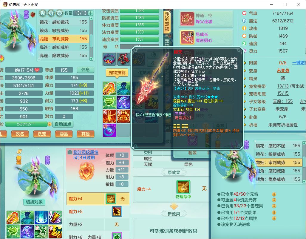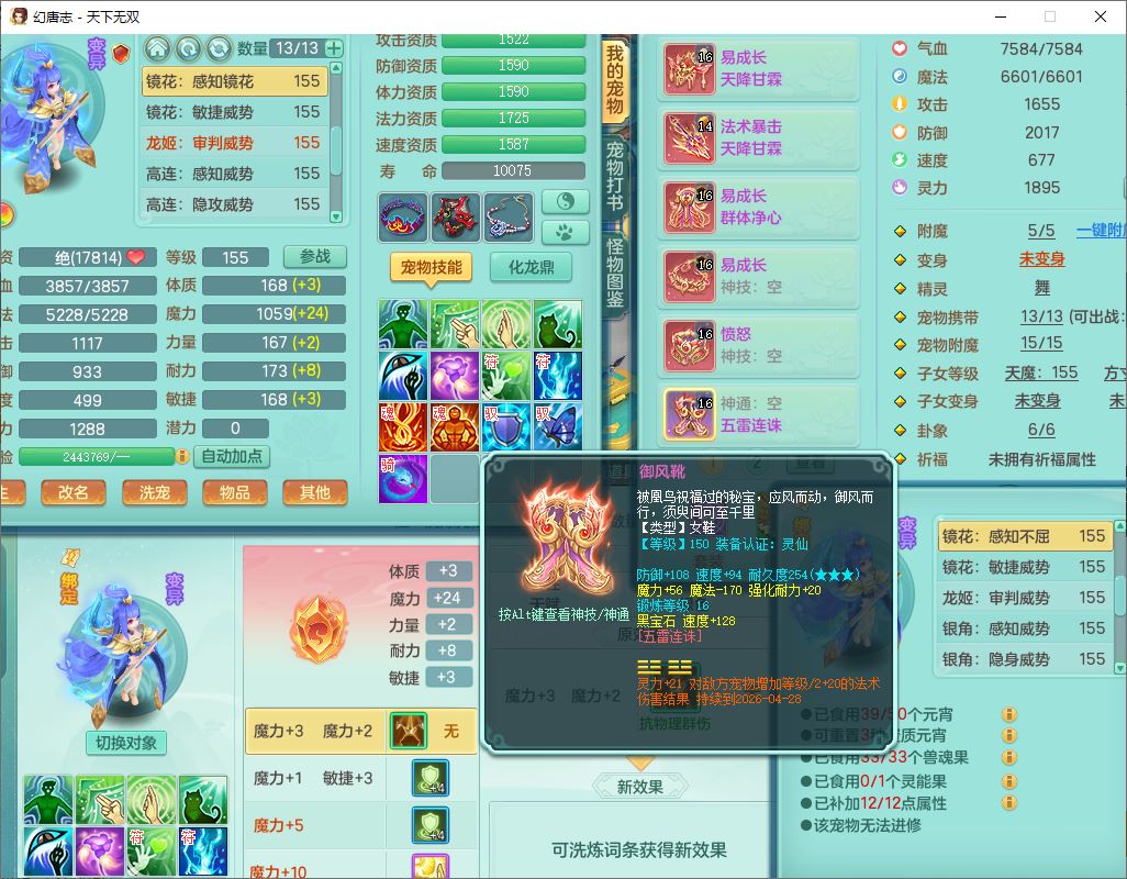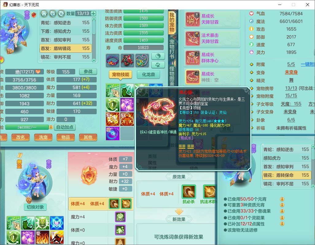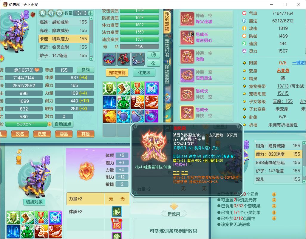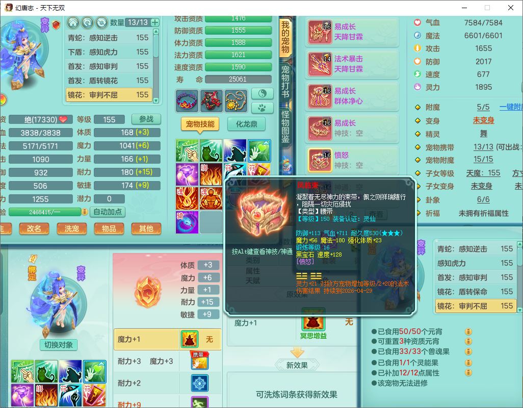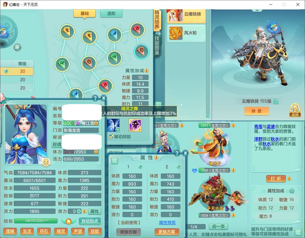 tx10264天下无双159女龙宫精灵舞,1内丹青蛇1望归6镜花1龙姬1金炉2特殊(墨守,烈焰兽决)1七技能风卷妖鬼,5觉醒4六字综合10只满果子,9红装备,Y四海帽子,法爆四海武器,Y晶清衣服,愤怒腰带,五雷鞋子,Y魔音武器,鼎4.5+70,142天月卡,永久外观、精灵皮肤,1双人坐骑