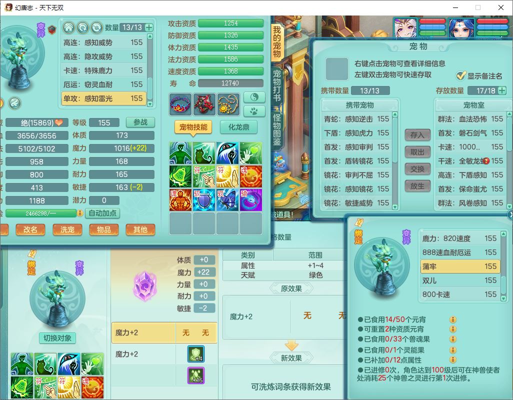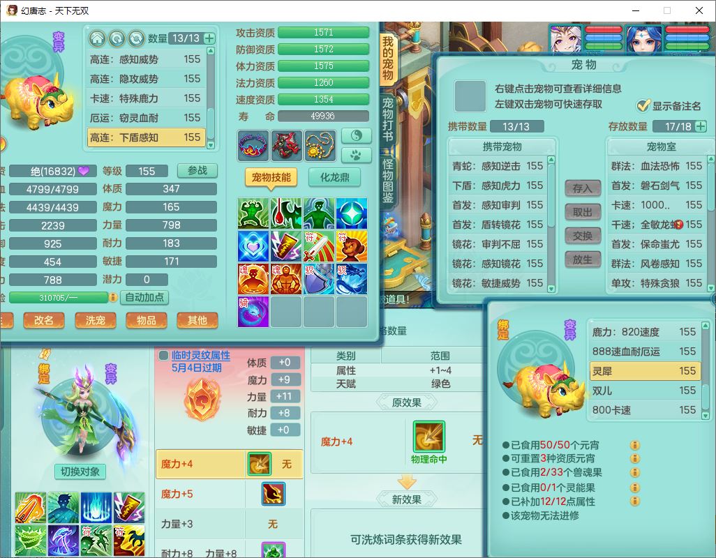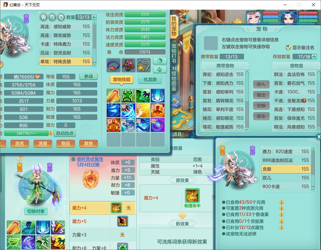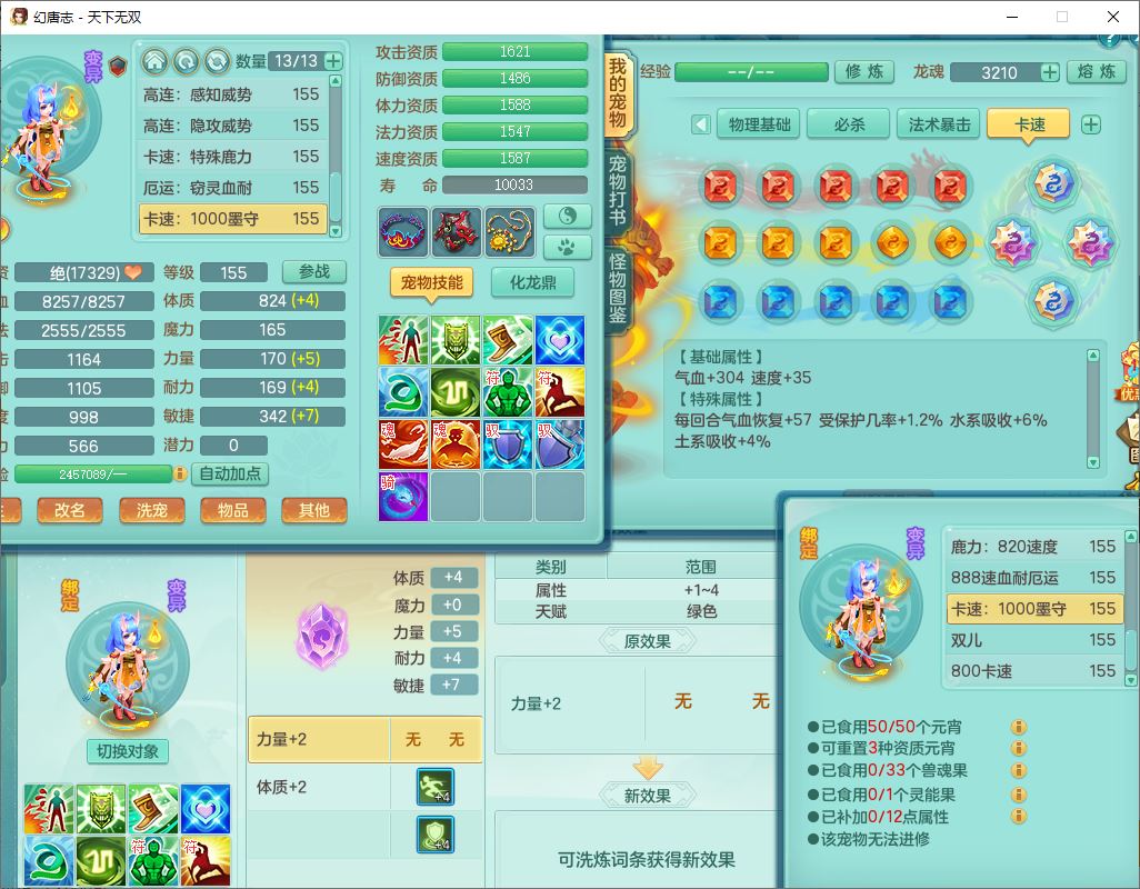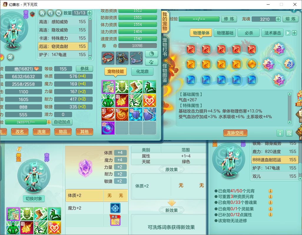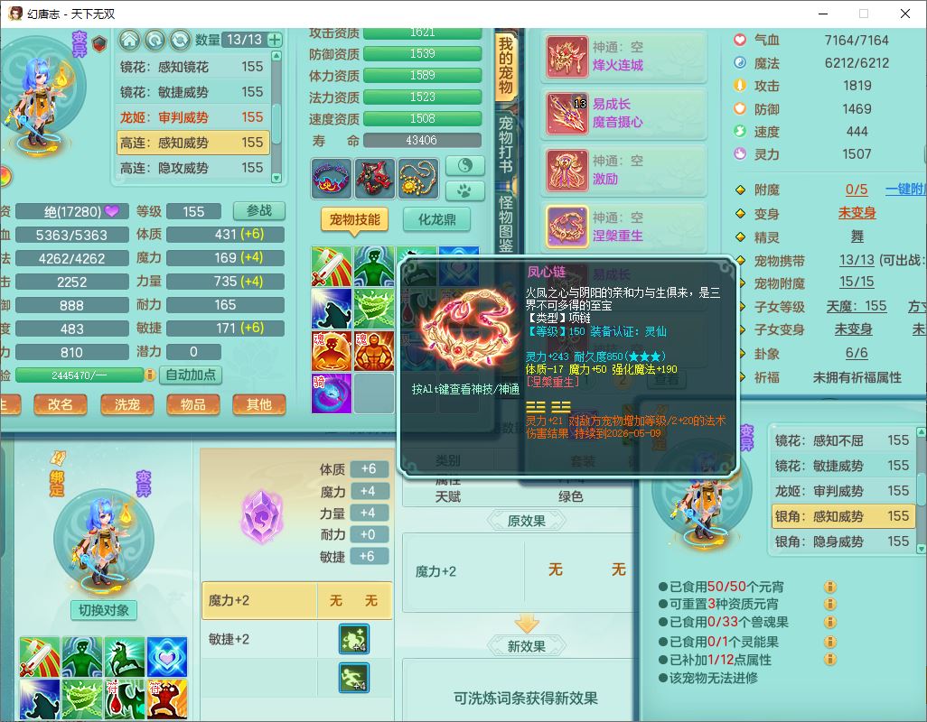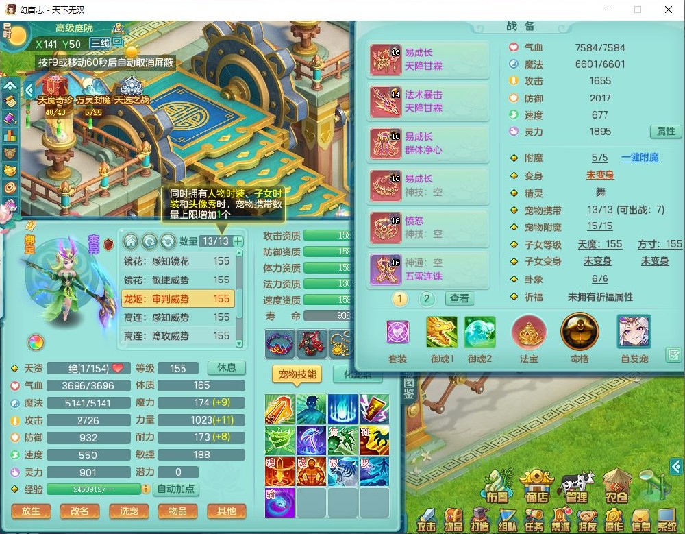 tx10264天下无双159女龙宫精灵舞,1内丹青蛇1望归6镜花1龙姬1金炉2特殊(墨守,烈焰兽决)1七技能风卷妖鬼,5觉醒4六字综合10只满果子,9红装备,Y四海帽子,法爆四海武器,Y晶清衣服,愤怒腰带,五雷鞋子,Y魔音武器,鼎4.5+70,142天月卡,永久外观、精灵皮肤,1双人坐骑