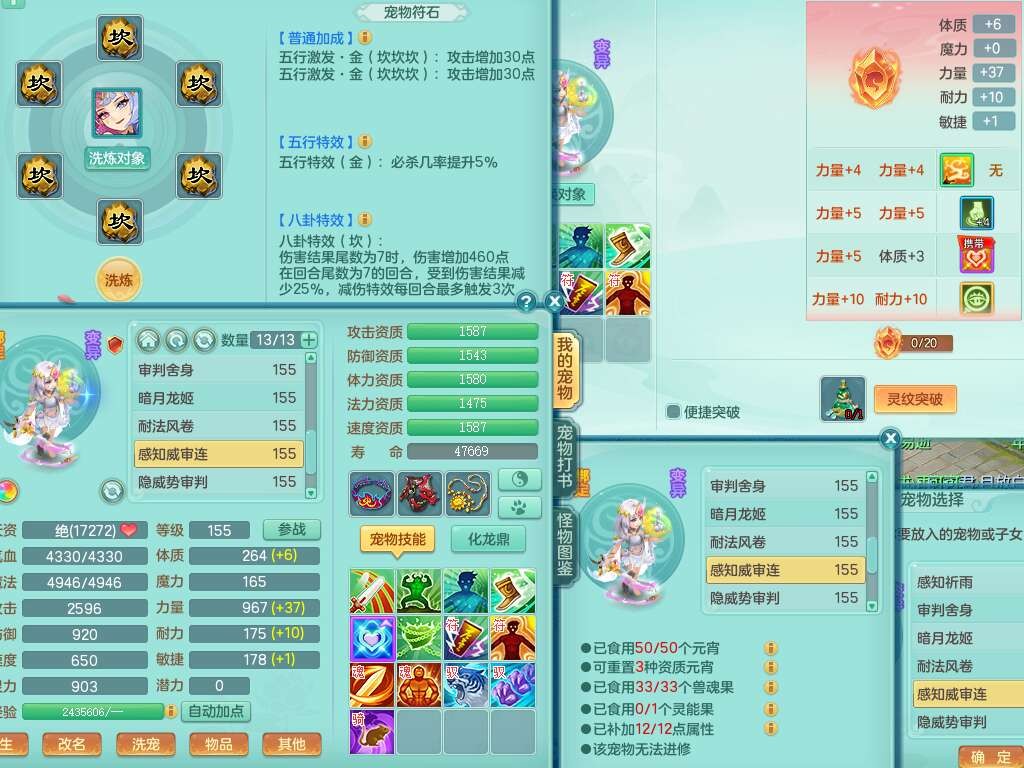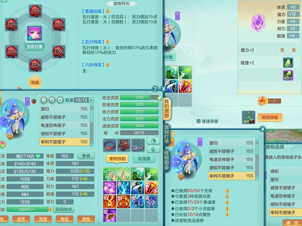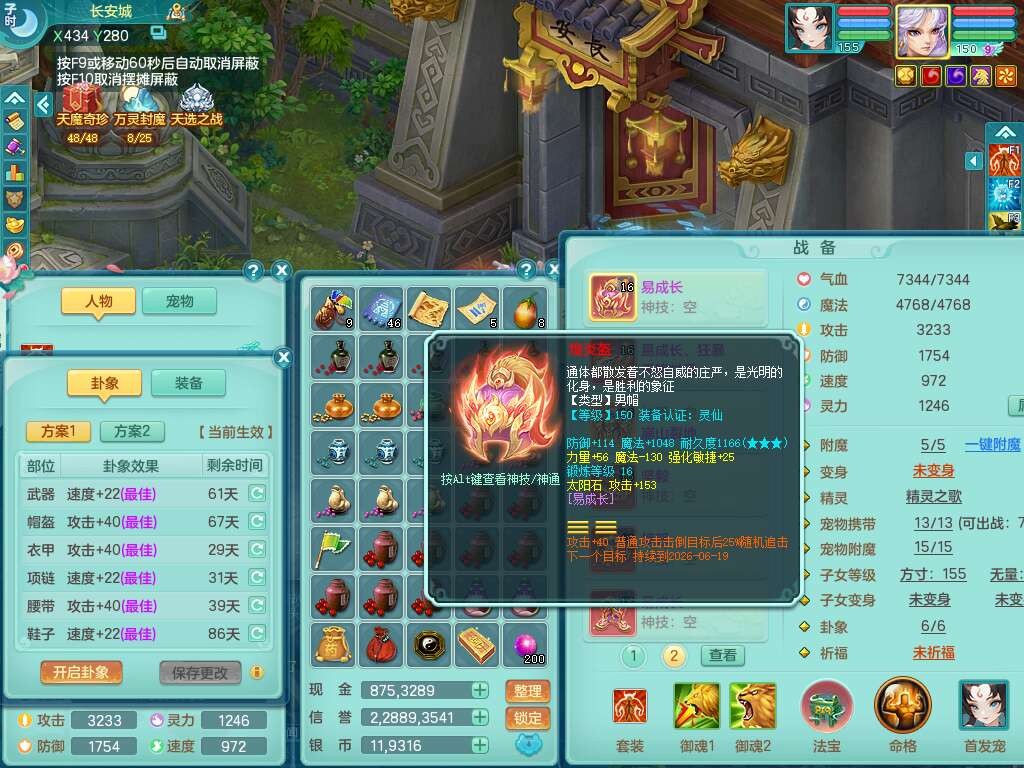 a22175七窍玲珑159男万兽,精灵歌,1内胆神,【9只觉醒,已潜龙】,3宠皮,4特殊(禁锢,夺命,祈雨,舍身),4只6技能镜花灵,2只6技能龙姬,三红狂暴易成长四海武器,易成长单加56头,崩山单加51衣服,坚毅链子,愤怒单加55腰带,易成长单加57鞋子,5.5基础鼎+70攻,280血,物理躲避10%,13个纯六字,18只满果子,宠排在榜,修炼在榜,3只坐骑,神驹马上发财+火焰之力,仓库23神兽内丹碎片,28仙兽蛋,月卡还有133天。