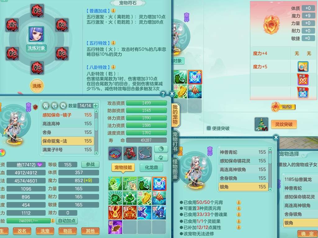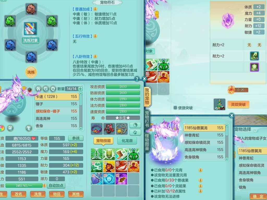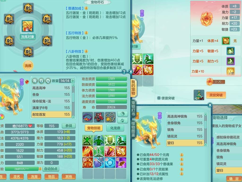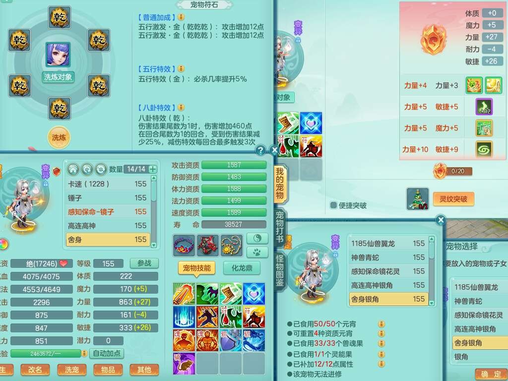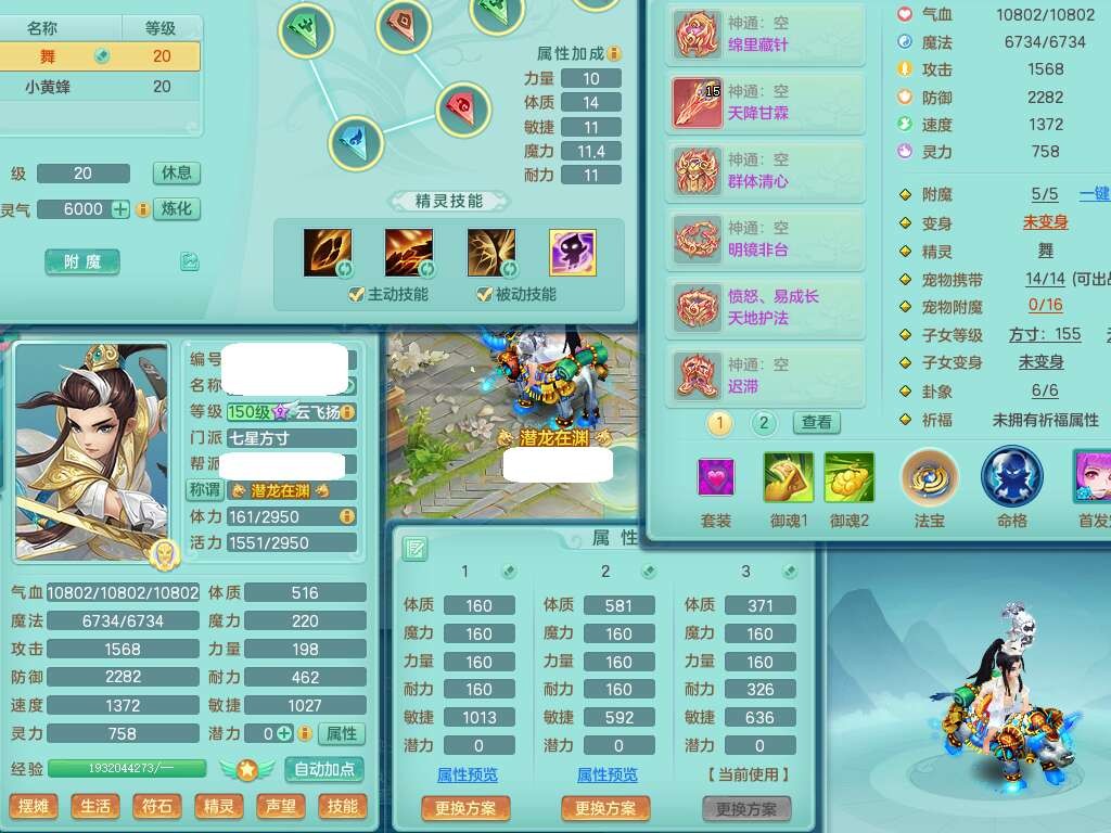 J22163扬名立万159男方寸,精灵舞,1龙没内,1内胆神,【8只觉醒,已潜龙】,3特殊(舍身,守护,烈焰),4只6技能镜花灵,1只6技能龙姬,2只九技能炼妖,三红愤怒易罗汉腰带,6特,5.5基础鼎+70攻,280血,物理躲避10%,7个纯六字,3个5字,20只满果子,宠排在榜,修炼在榜,火焰之力,带5964金币,百万银币,月卡还有21天。