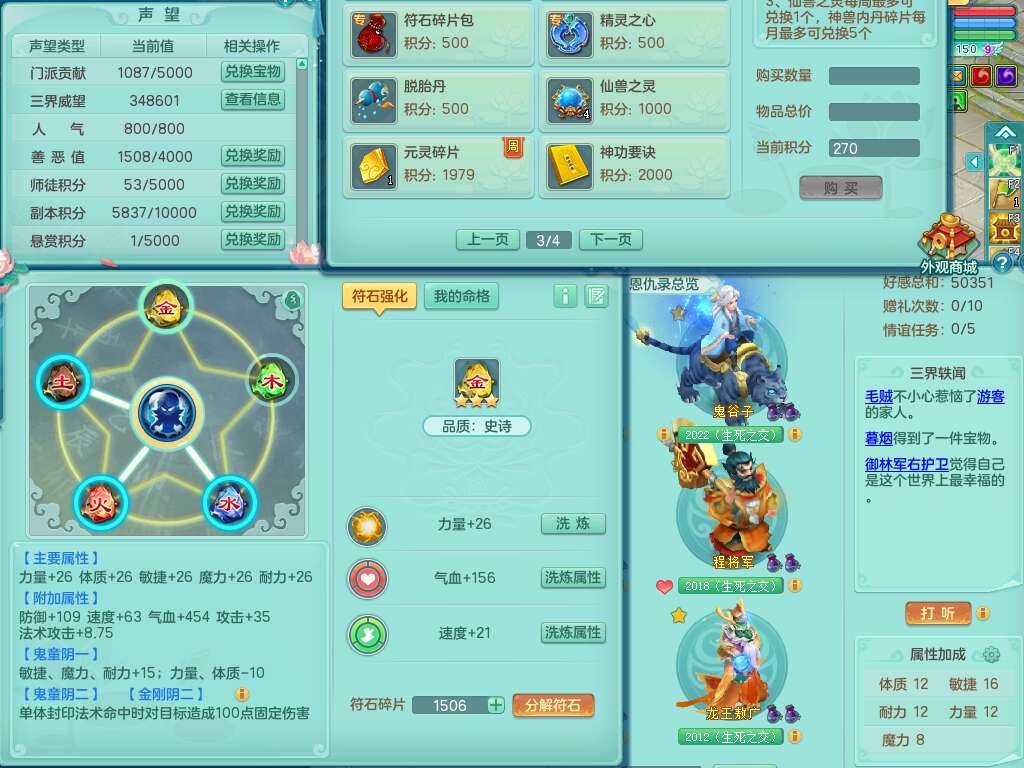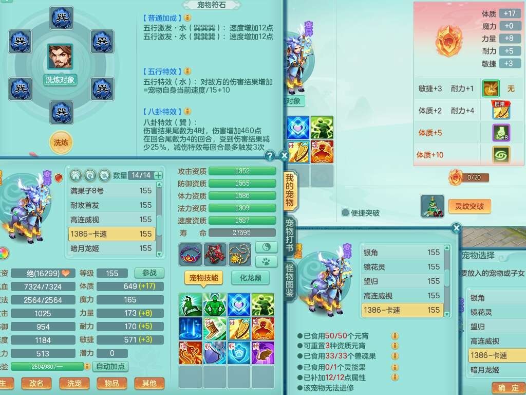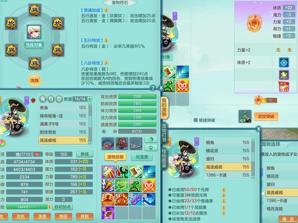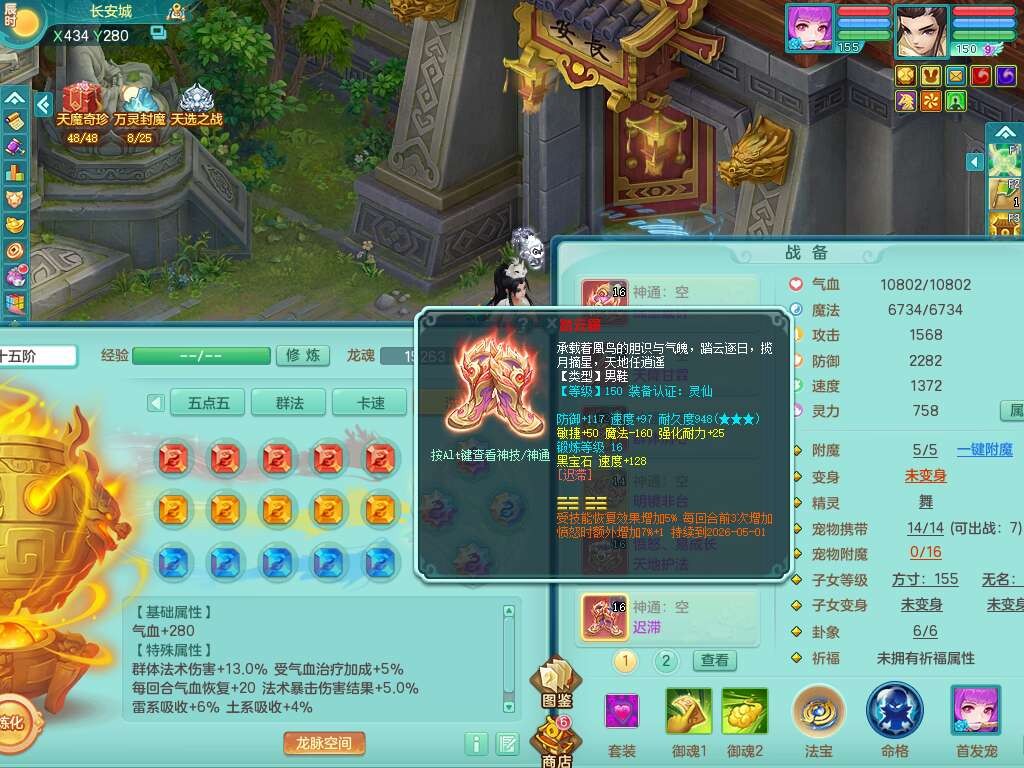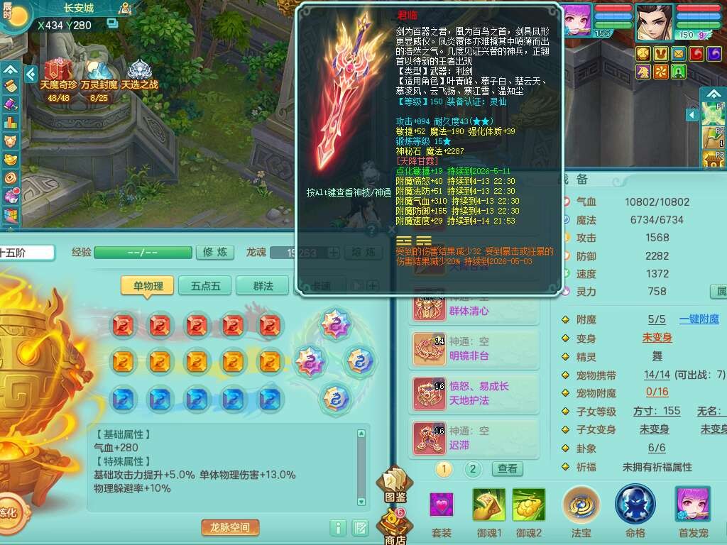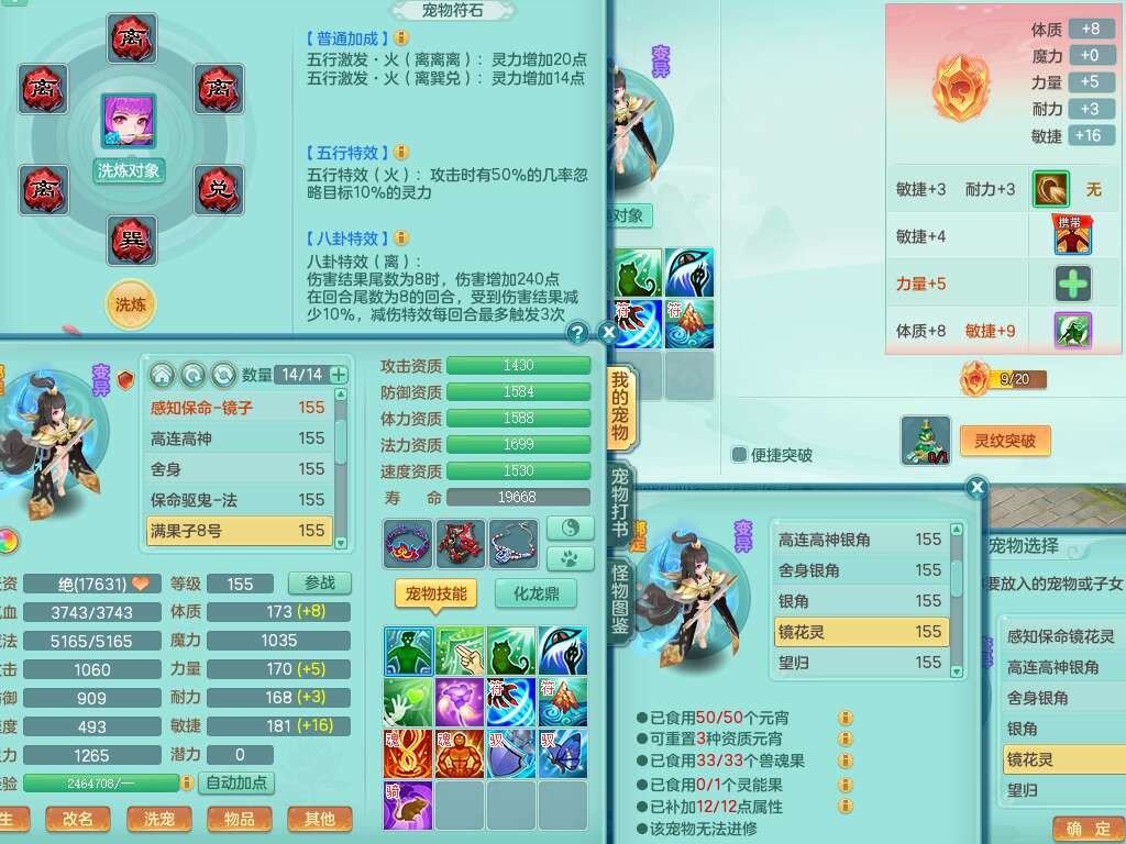J22163扬名立万159男方寸,精灵舞,1龙没内,1内胆神,【8只觉醒,已潜龙】,3特殊(舍身,守护,烈焰),4只6技能镜花灵,1只6技能龙姬,2只九技能炼妖,三红愤怒易罗汉腰带,6特,5.5基础鼎+70攻,280血,物理躲避10%,7个纯六字,3个5字,20只满果子,宠排在榜,修炼在榜,火焰之力,带5964金币,百万银币,月卡还有21天。