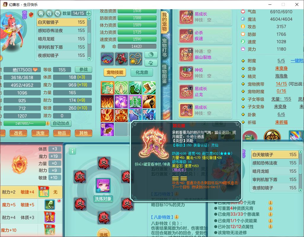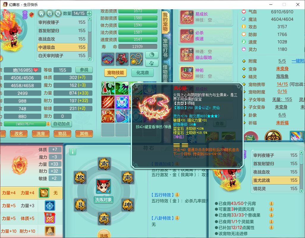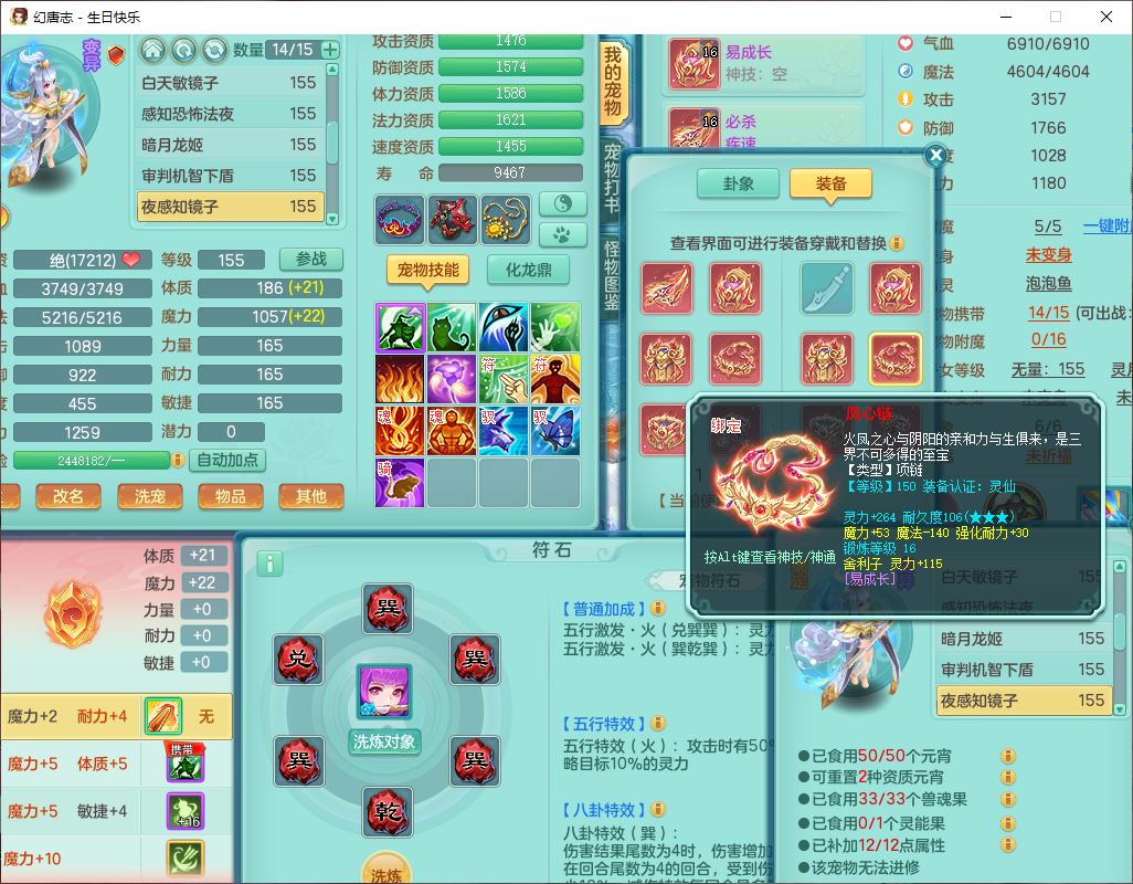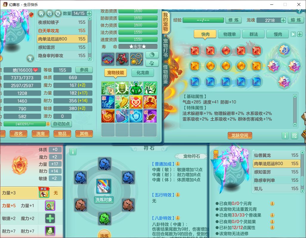 4364生日快乐159男万兽【西瓜冰】精灵舞,2龙(1换,1破境)1内1龙姬3镜花6特殊(羽袭、雷利,兽决焚心、战争、破碎、剑胆),14觉醒1宠皮1六字1五字11四字18只满果子,8红装备,923必杀疾速武器,崩山衣服,神佑项链,Y止戈腰带,有法系装,Y唤魂衣服,264单加Y项链,鼎5.5+70,2套符石,冰晶庭院173房屋154,永久外观、精灵皮肤,9个内丹碎片,1双人飞行坐骑