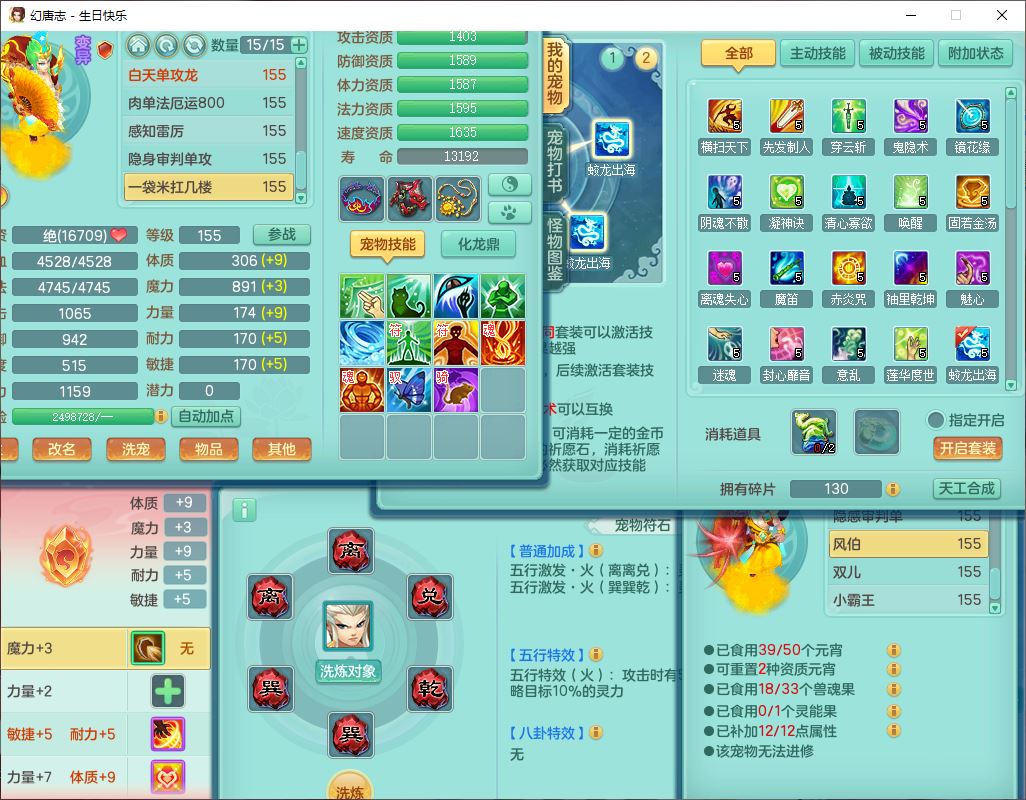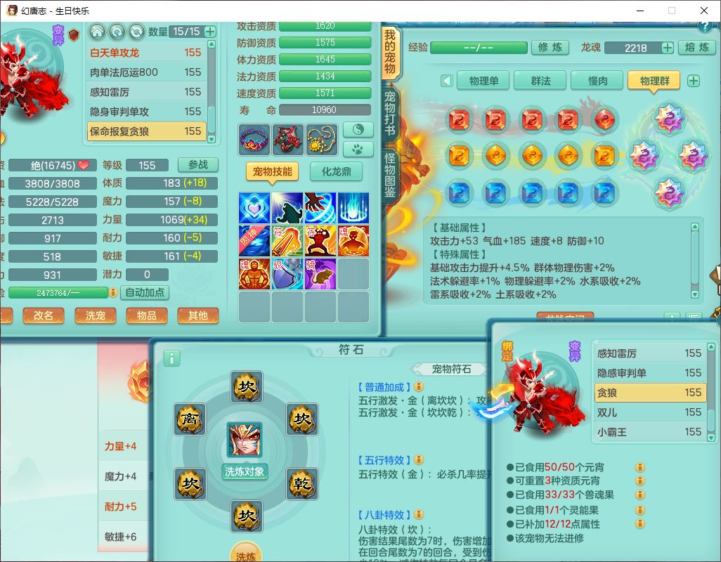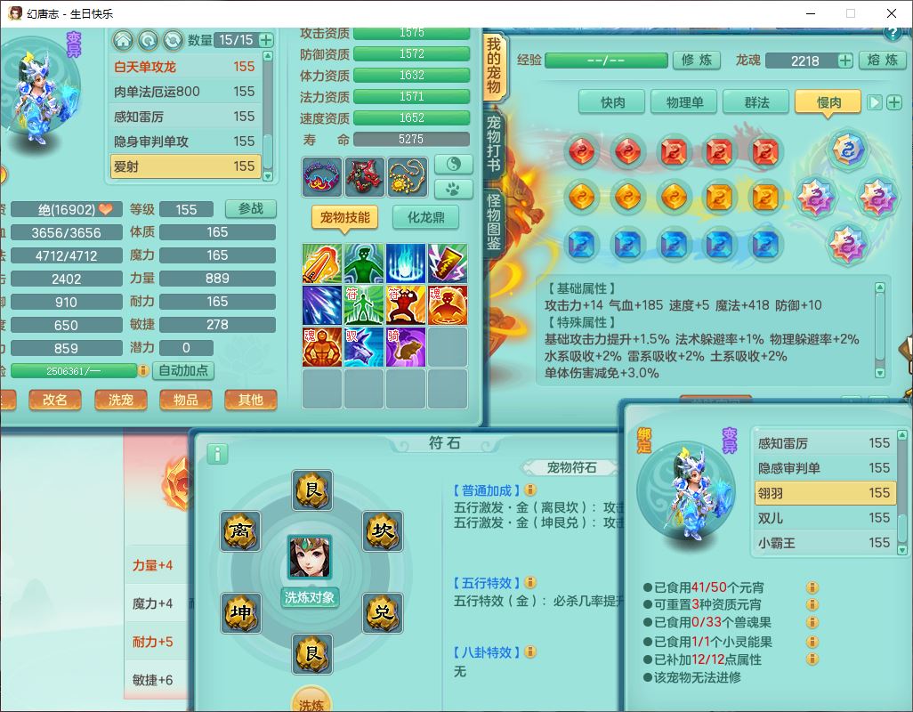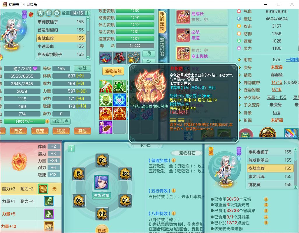 4364生日快乐159男万兽【西瓜冰】精灵舞,2龙(1换,1破境)1内1龙姬3镜花6特殊(羽袭、雷利,兽决焚心、战争、破碎、剑胆),14觉醒1宠皮1六字1五字11四字18只满果子,8红装备,923必杀疾速武器,崩山衣服,神佑项链,Y止戈腰带,有法系装,Y唤魂衣服,264单加Y项链,鼎5.5+70,2套符石,冰晶庭院173房屋154,永久外观、精灵皮肤,9个内丹碎片,1双人飞行坐骑