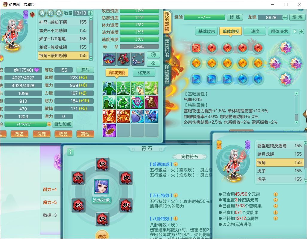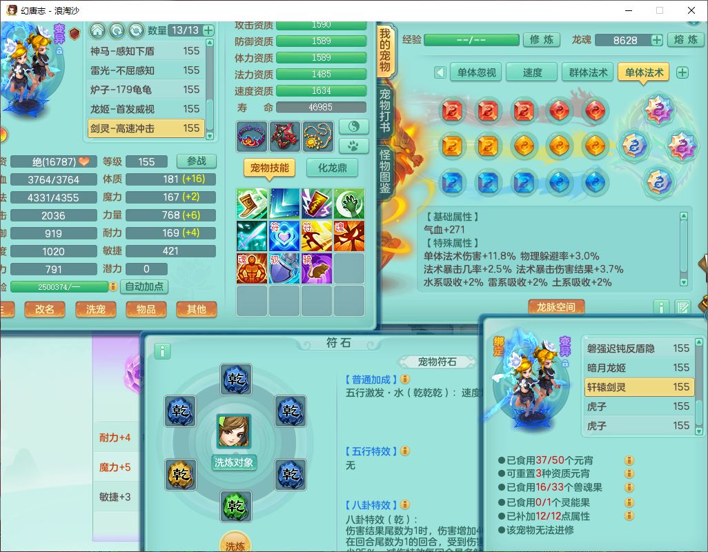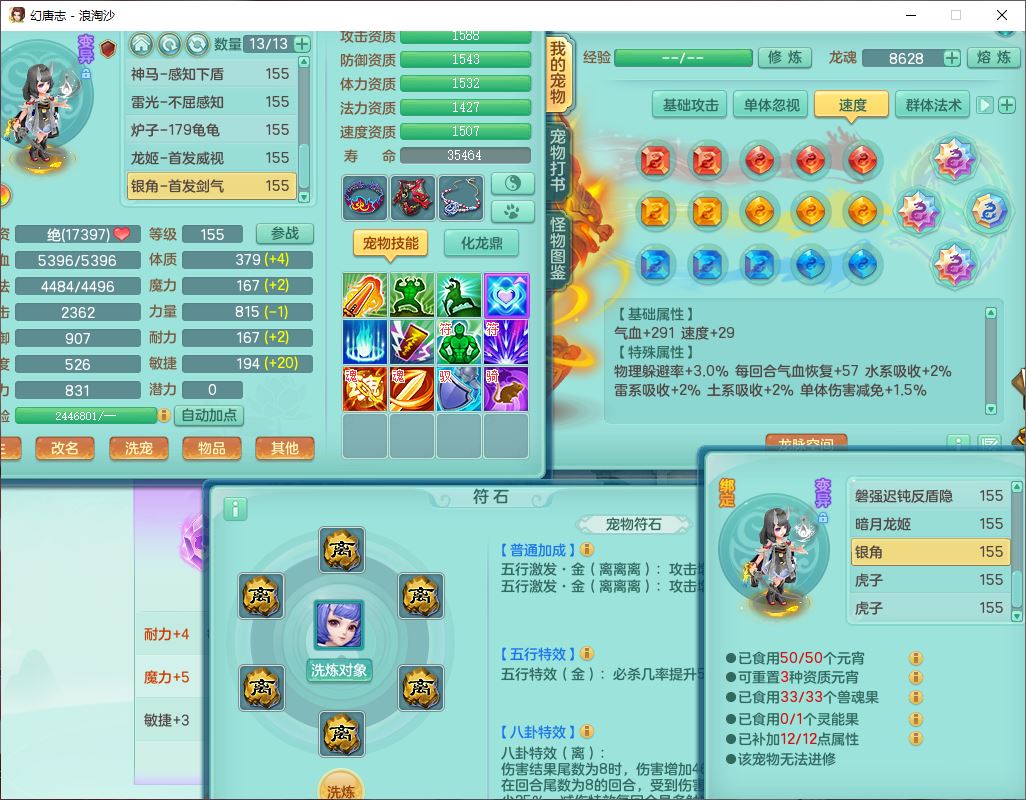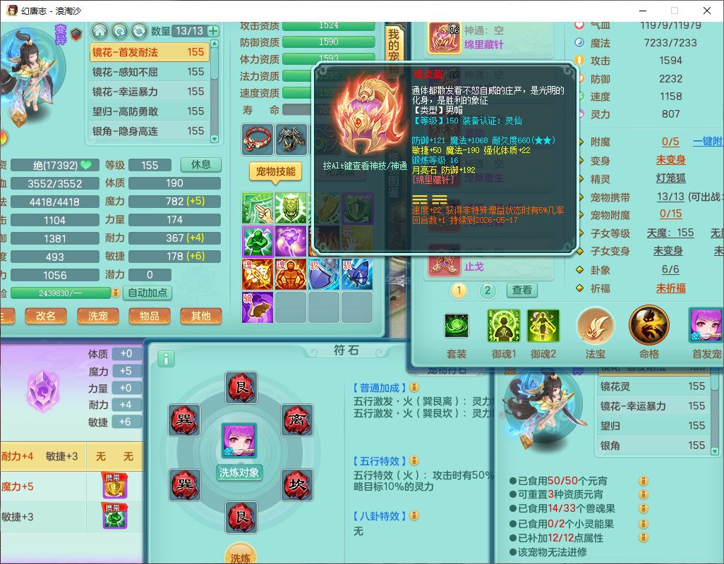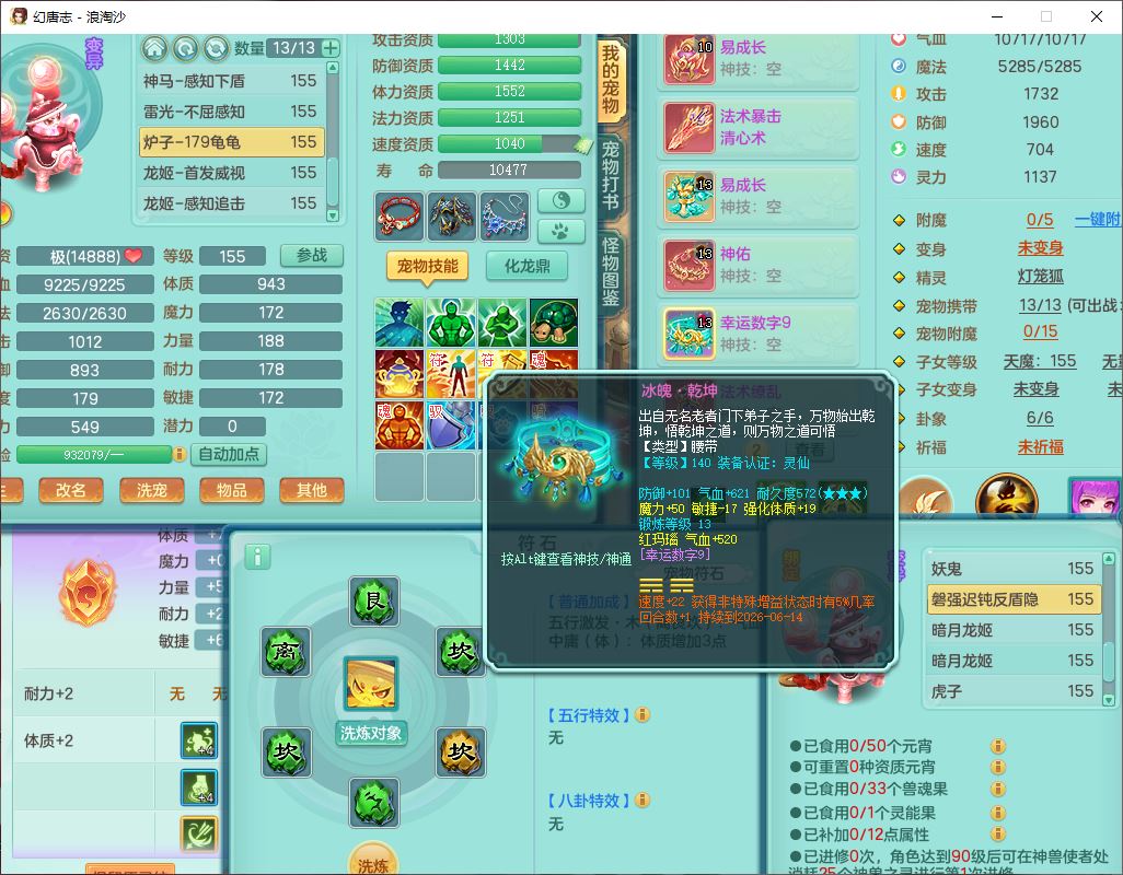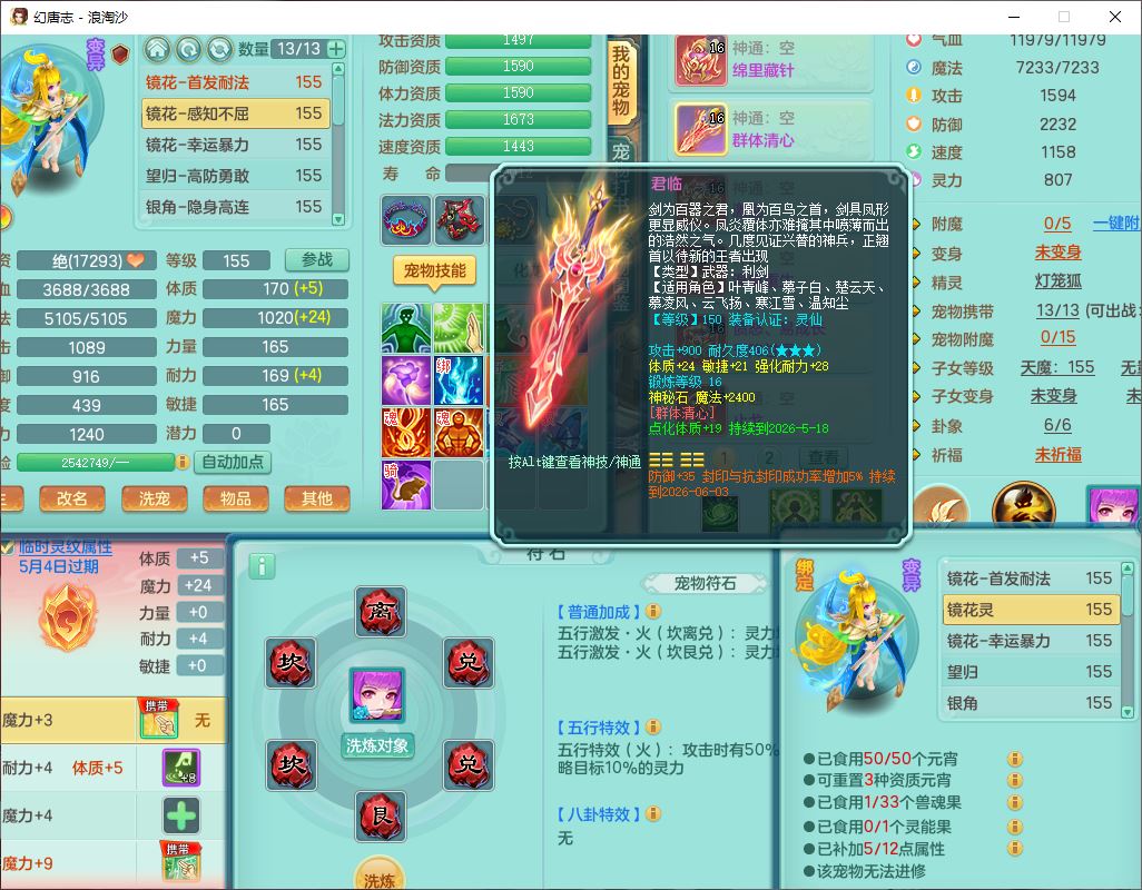 80746浪淘沙159男无量精灵舞,1内丹小马1望归3镜花灵1八技能金钱龟1七技能雷光妖鬼1金炉2龙姬,2觉醒2六字1五字4四字综合6只满果子,8红装备,单加笑里帽子,玉清武器,单加激励衣服, 单加慈航项链,愤怒Y四海腰带,单加止戈鞋子,一套7红装备,法爆水清武器,神佑项链,单加幸运腰带,单加法术缭乱鞋子,鼎4.0,永久头饰、背饰、精灵皮肤,50个仙兽灵,1双人坐骑,带152女万兽