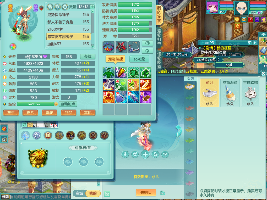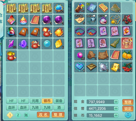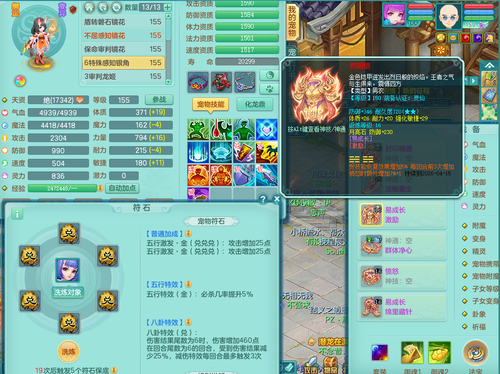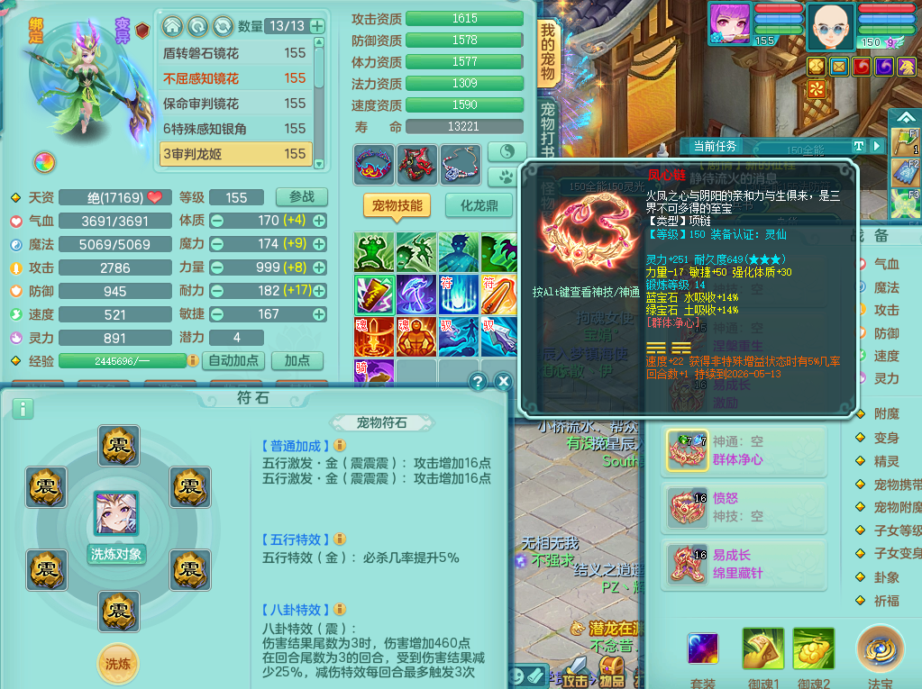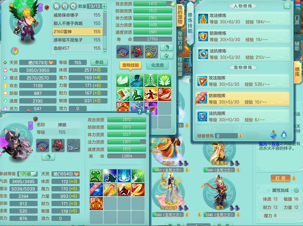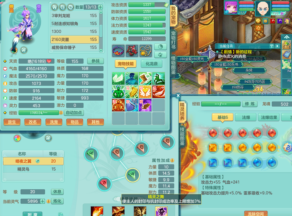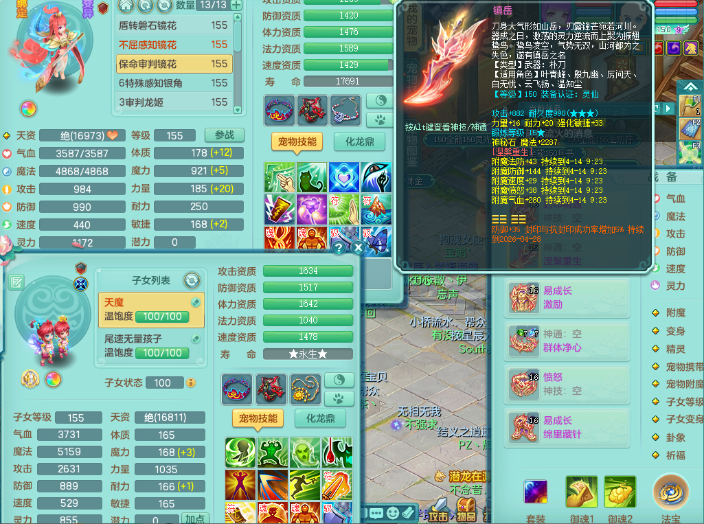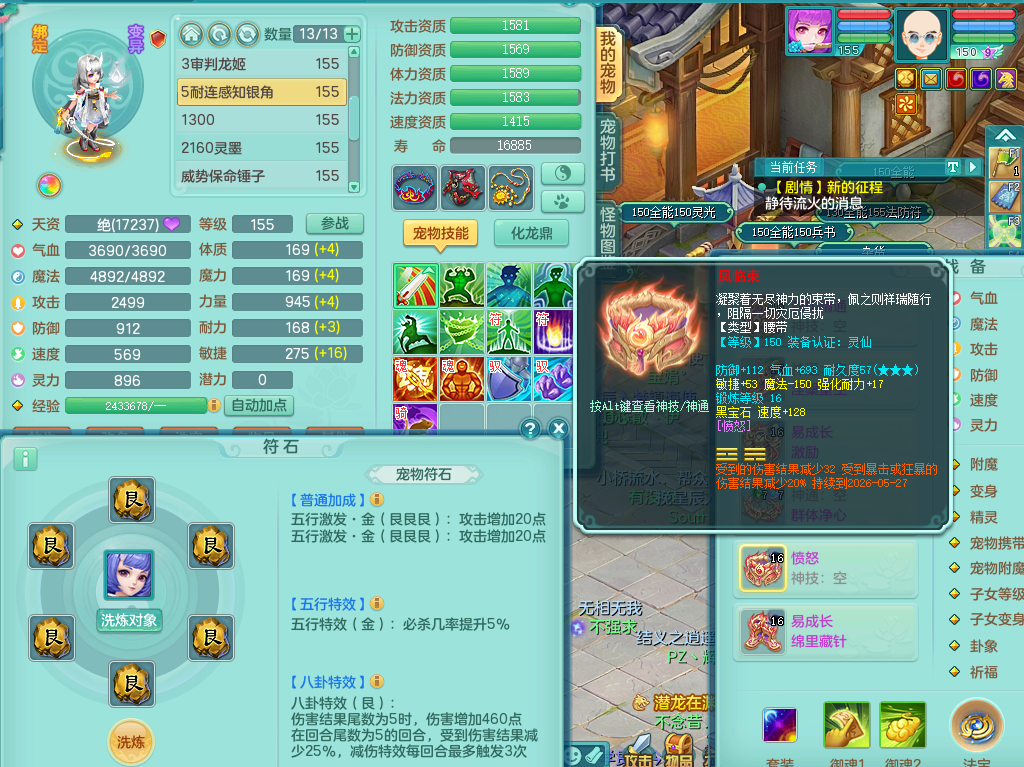 95014,三生万物159方寸,4觉醒,3六字,3镜子1红心龙姬,1内丹神(存)1特殊逆龙击,基础5.0,精灵舞,2只坐骑有双人飞行老虎,单加44封印头,易激励衣服,易笑里鞋子,仓库33个内丹神碎片,冰晶庭院,永久头饰背饰脸饰