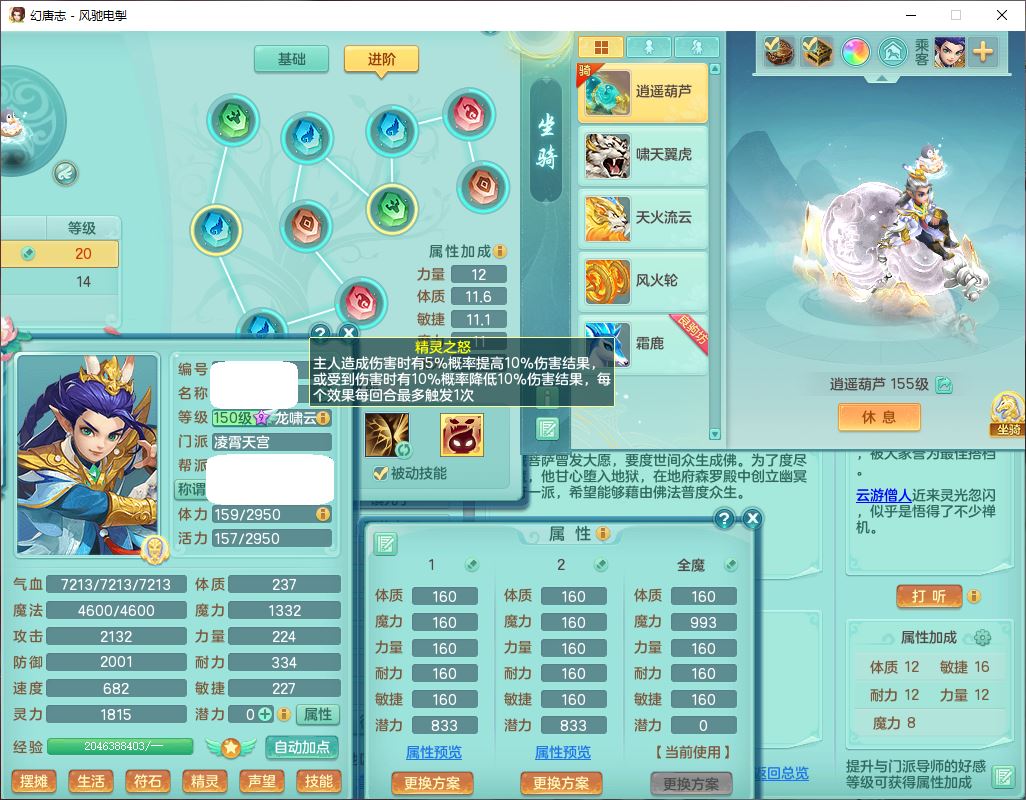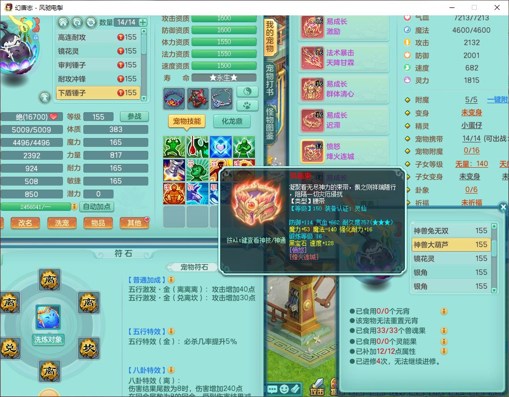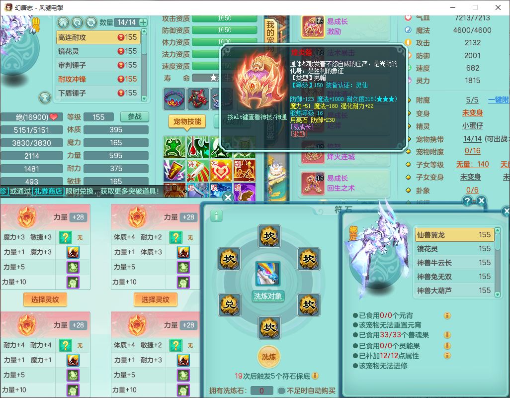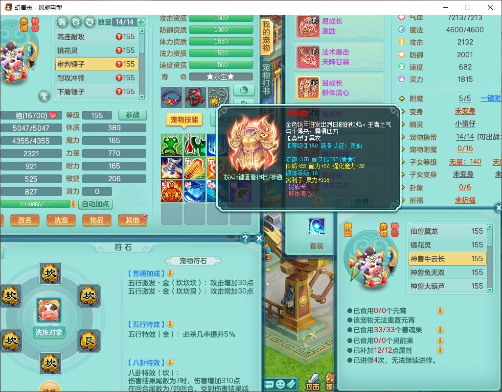 23469风驰电掣159男天宫精灵怒,1龙3内2镜花特殊(翻江、剑胆、以战)3宠皮,2觉醒9五字12四字综合18只满果子,12红装备,Y激励帽子,法爆四海武器,Y玉清衣服,Y迟滞项链,愤怒烽火腰带,Y回生鞋子,鼎4.5+70,庭院167,永久外观饰物、精灵皮肤,403W神武币,65个仙兽灵,3双人坐骑(2飞行)