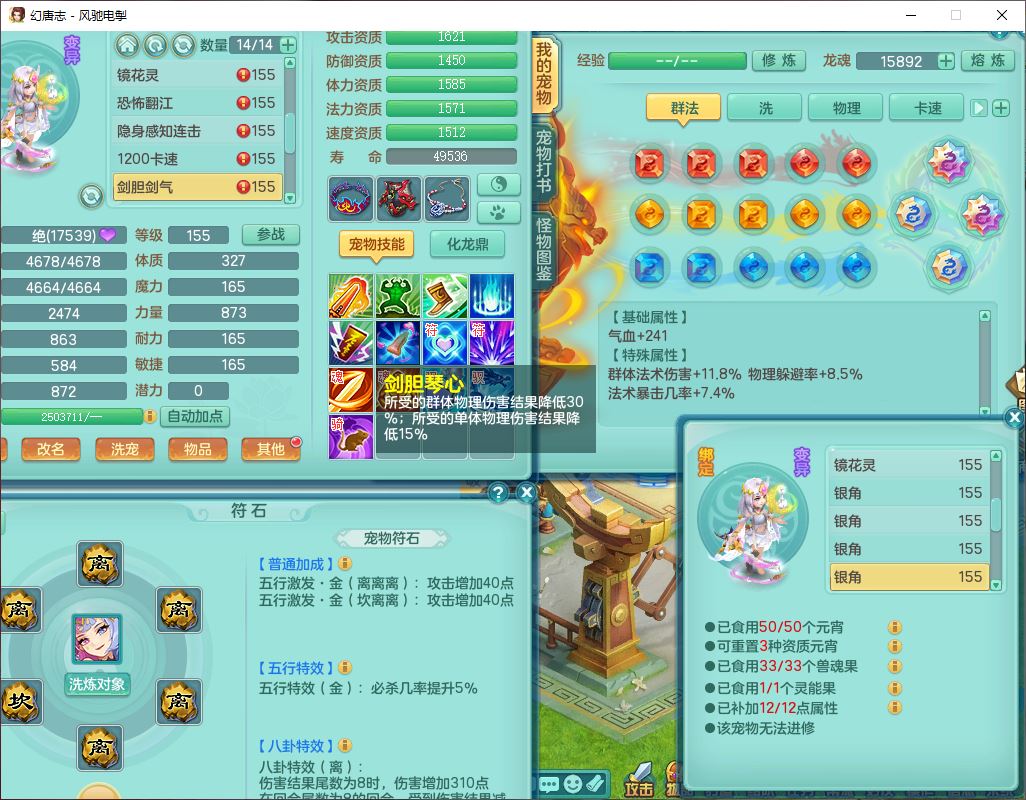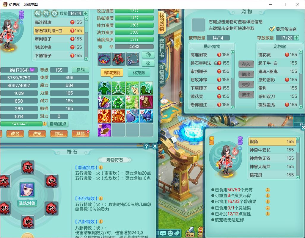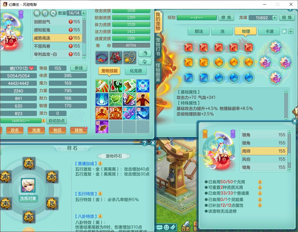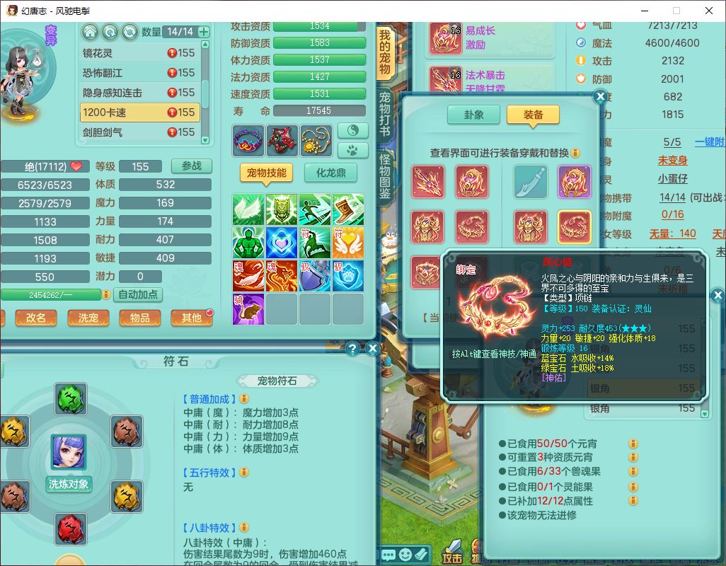 23469风驰电掣159男天宫精灵怒,1龙3内2镜花特殊(翻江、剑胆、以战)3宠皮,2觉醒9五字12四字综合18只满果子,12红装备,Y激励帽子,法爆四海武器,Y玉清衣服,Y迟滞项链,愤怒烽火腰带,Y回生鞋子,鼎4.5+70,庭院167,永久外观饰物、精灵皮肤,403W神武币,65个仙兽灵,3双人坐骑(2飞行)