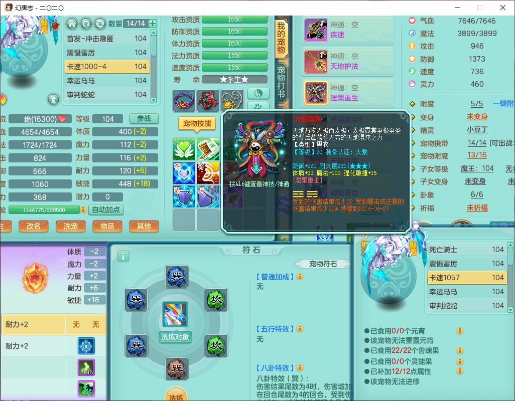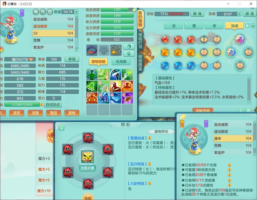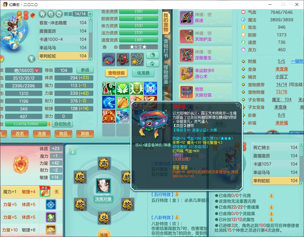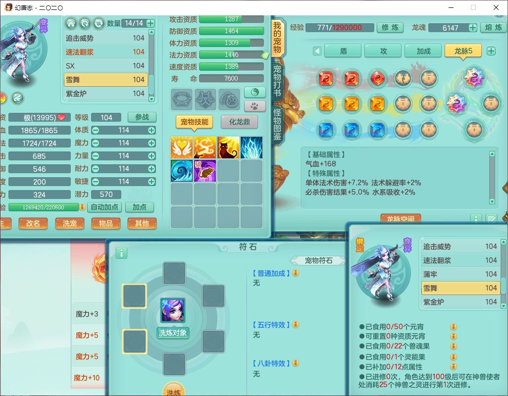 4357,2020区99男普陀【潜龙号】体敏耐、全魔双系精灵,2龙(1换、无内)3内(1龙马1青蛇)3翻江2舍身1金炉,8觉醒1宠皮7六字3四字15只满果子,全单加8红装备,幸运水清项链,愤怒四海腰带,崩山鞋子,有法系装备,法缭魔音鞋子,Y法缭鞋子,鼎2.5+42+168,3套符石,97天月卡,永久外观、精灵皮肤,33个内丹碎片,1双人飞行坐骑
