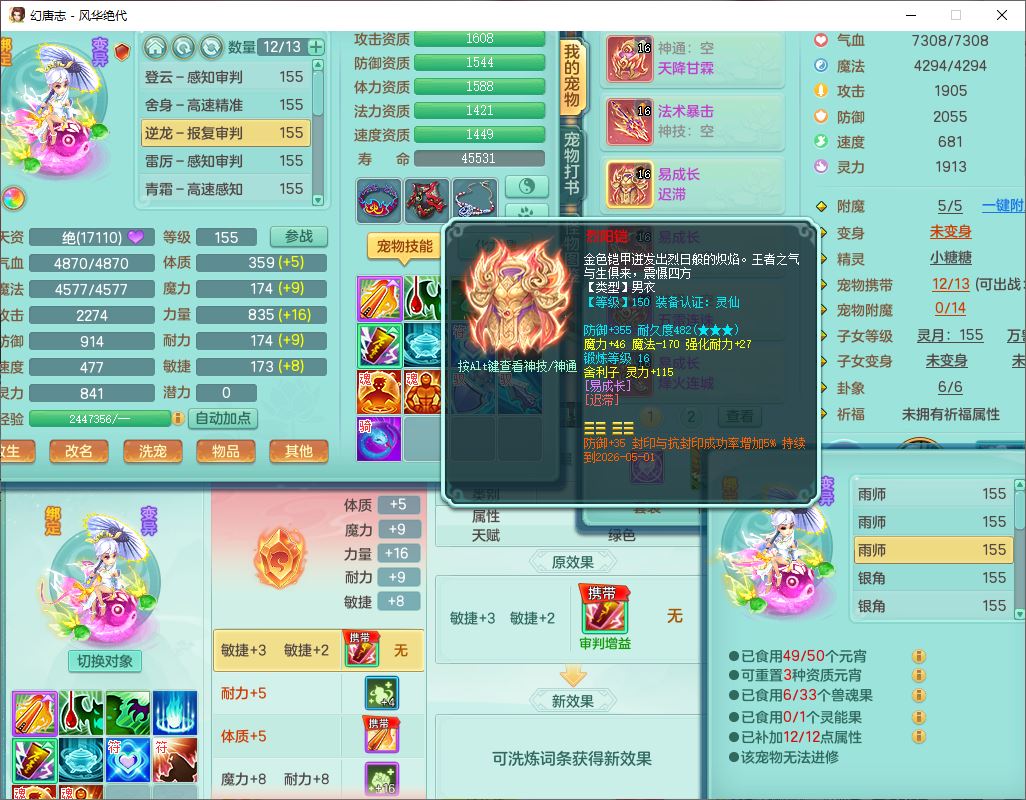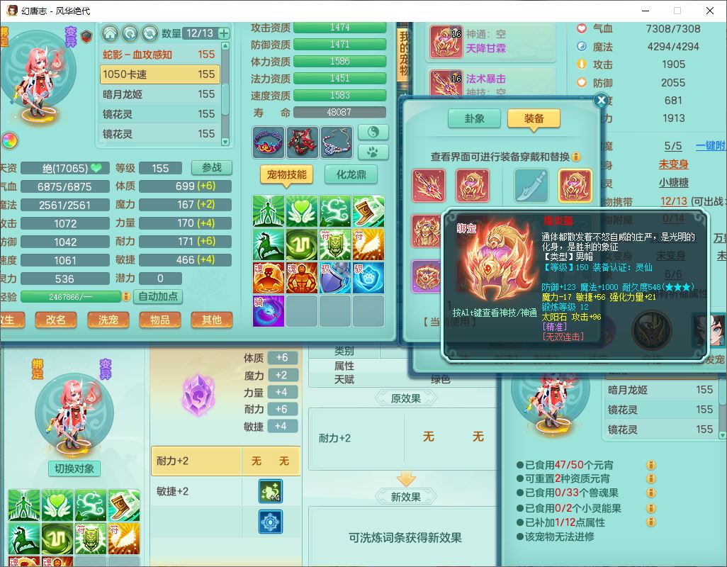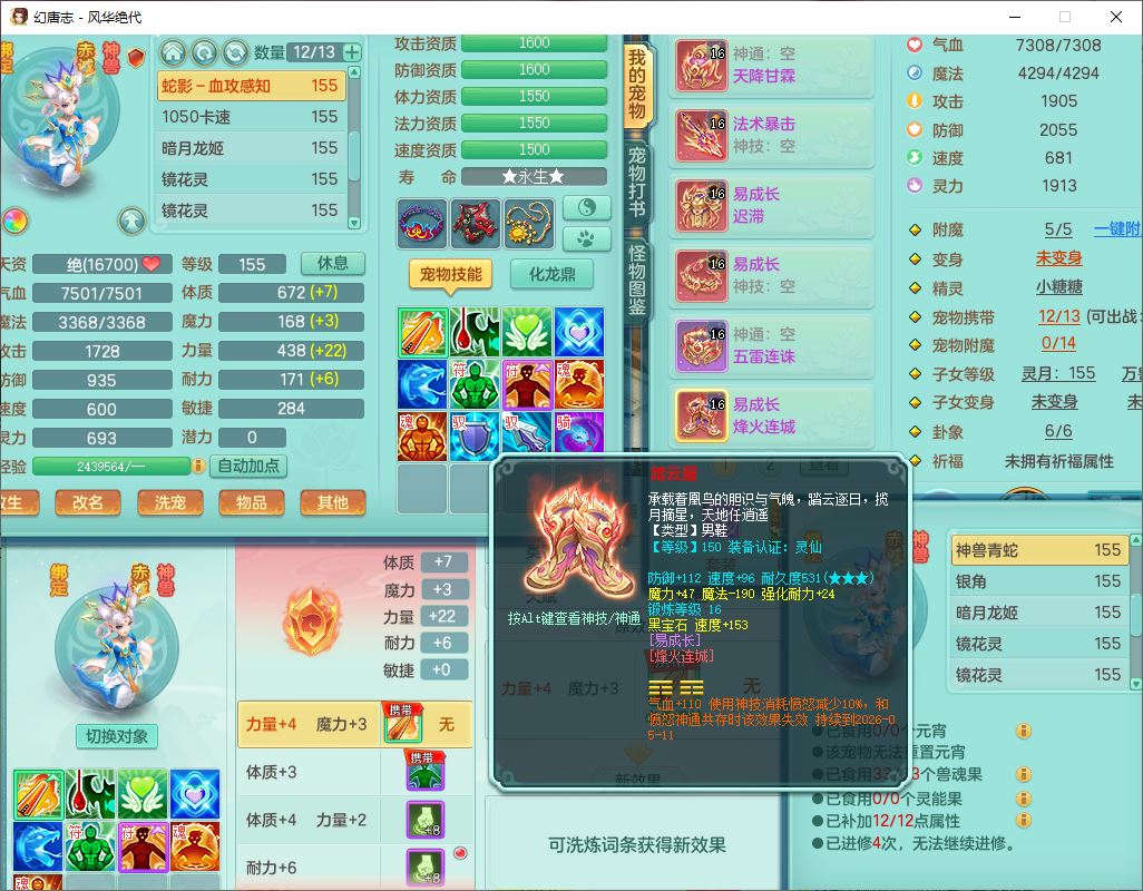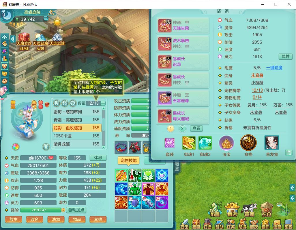 4356风华绝代159男龙宫精灵歌,1内丹青蛇7特殊(登云、舍身、逆龙、雷利、青霜、墨守,荒古兽决)2镜花,6觉醒,8红全单加装备,法爆武器,Y迟滞衣服,276Y项链,五雷腰带,Y烽火鞋子,精准破血帽子,鼎5.0,84天月卡,24个内丹碎片,1双人飞行坐骑