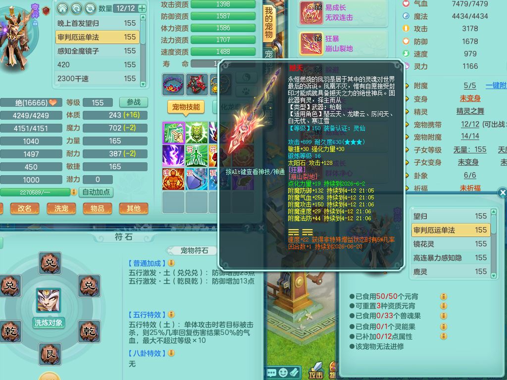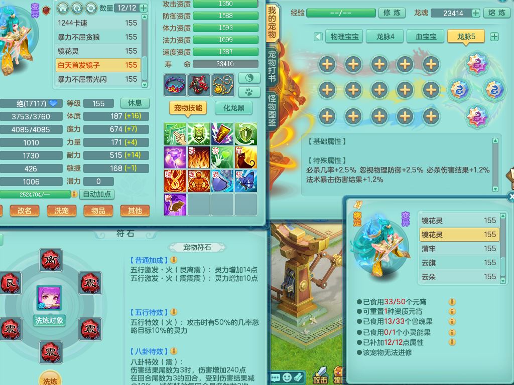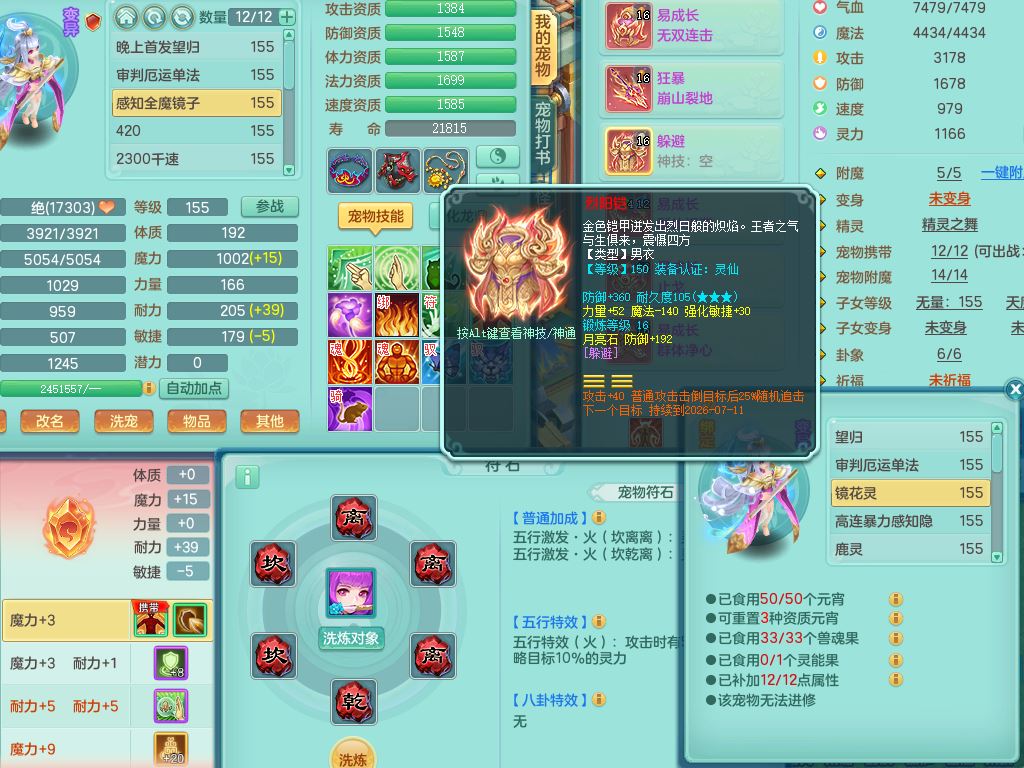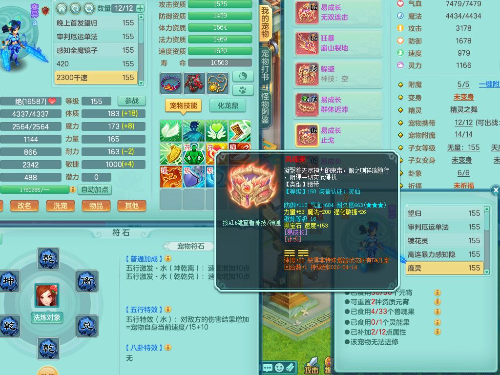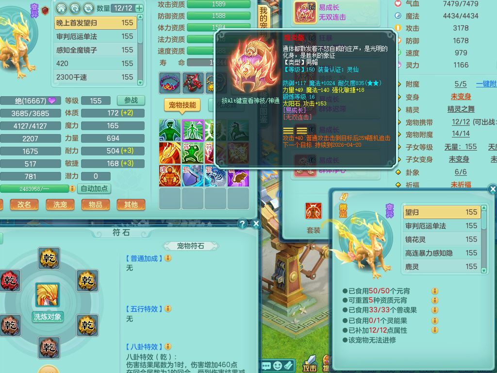 52682三生万物159男万兽精灵舞,1内(青蛇)1望归3镜花灵,3觉醒4四字综合7只满果子,11红装备,Y破血帽子,狂暴崩山武器,Y群体迟滞项链,Y止戈腰带,Y晶清鞋子,鼎4.5,47天月卡,永久外观饰物、精灵皮肤,201W神武币,1飞行双人坐骑