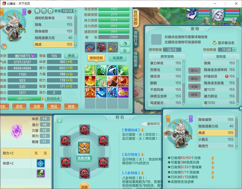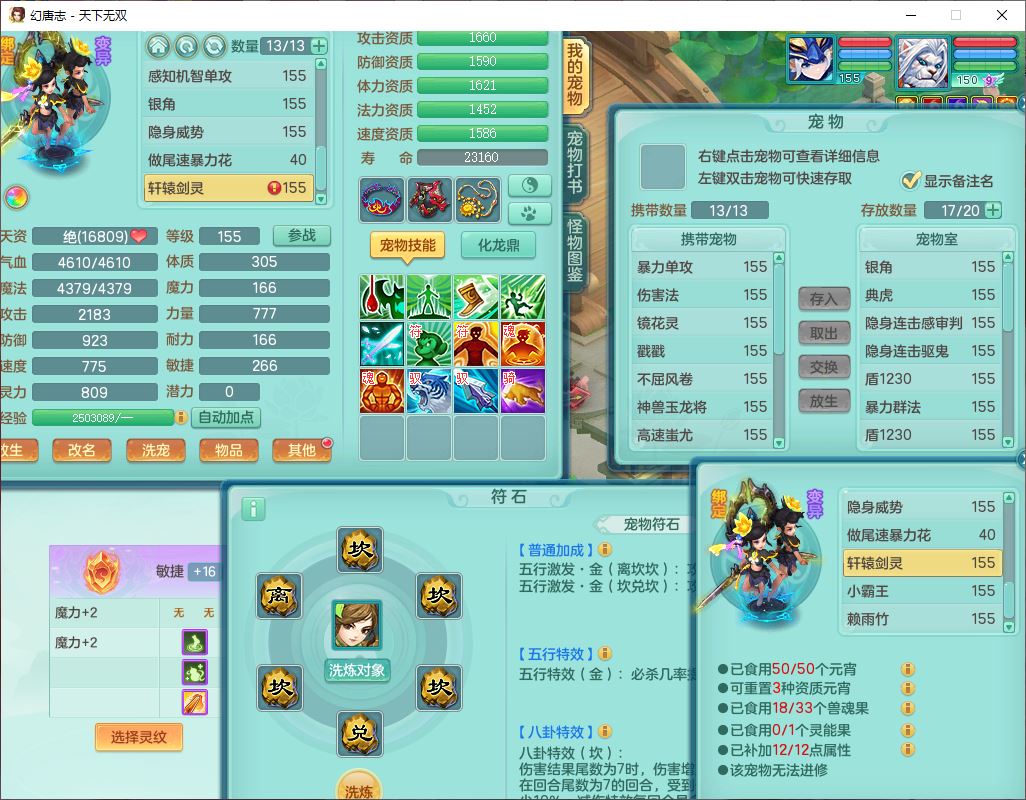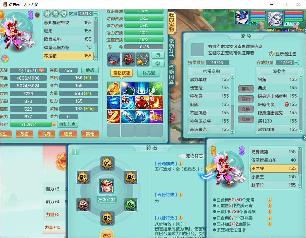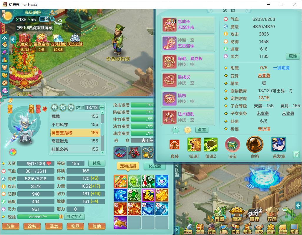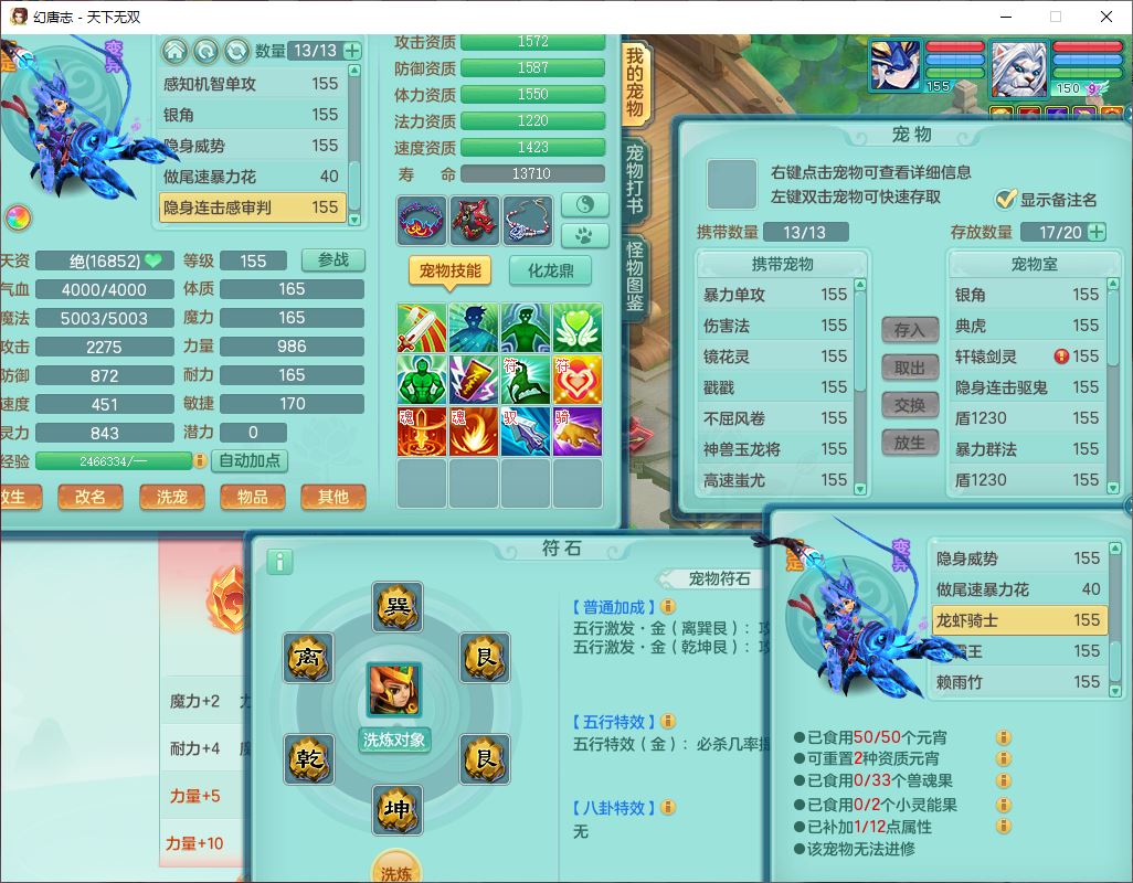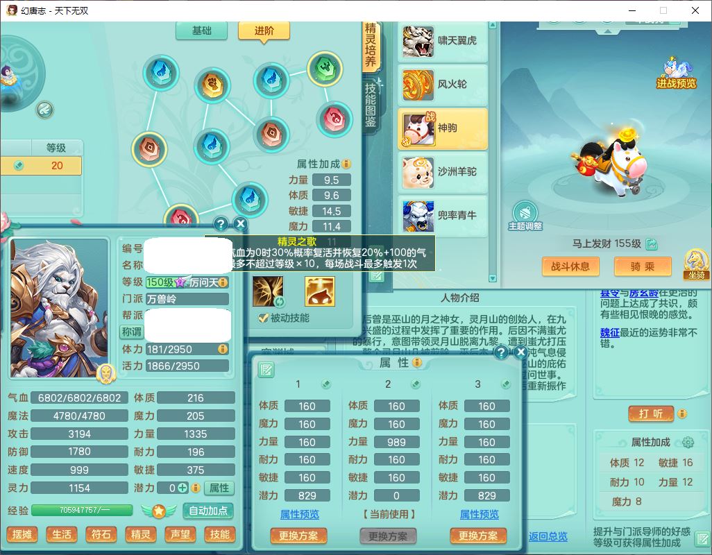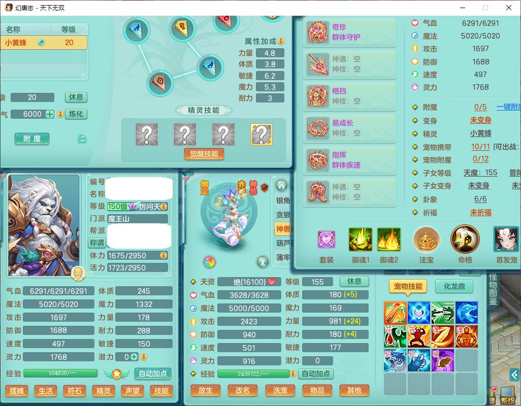 tx10323天下无双159男万兽【马上发财+火焰之力】精灵歌,1内(带蛇影,破境)3镜花(1胚子)4特殊(勇猛、风卷、影袭,兽决破碎)1龙姬,3觉醒1六字12四字,8红装备,Y破血帽子,单加Y武器,坚毅移魂项链,Y破魔鞋子,可搭一套8红法系装,五雷武器,法爆武器,躲避Y衣服,愤怒腰带,法缭鞋子,鼎4.5+70,84天月卡,24个内丹碎片,仓库多护符存货,1双人飞行坐骑,带154奶粉魔王,带双重可换绑