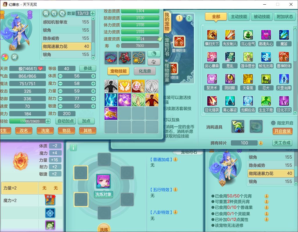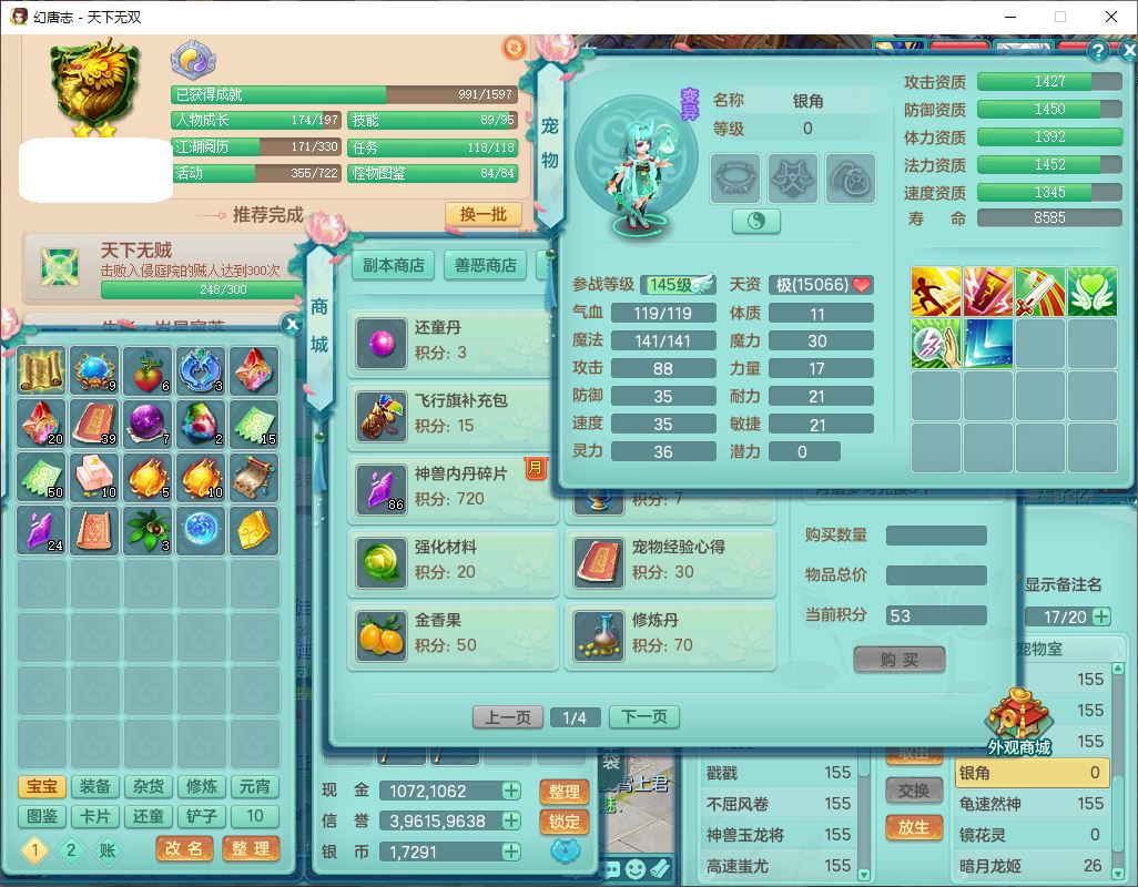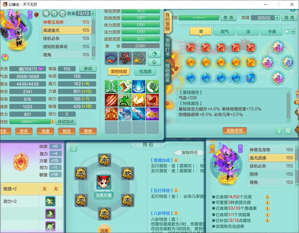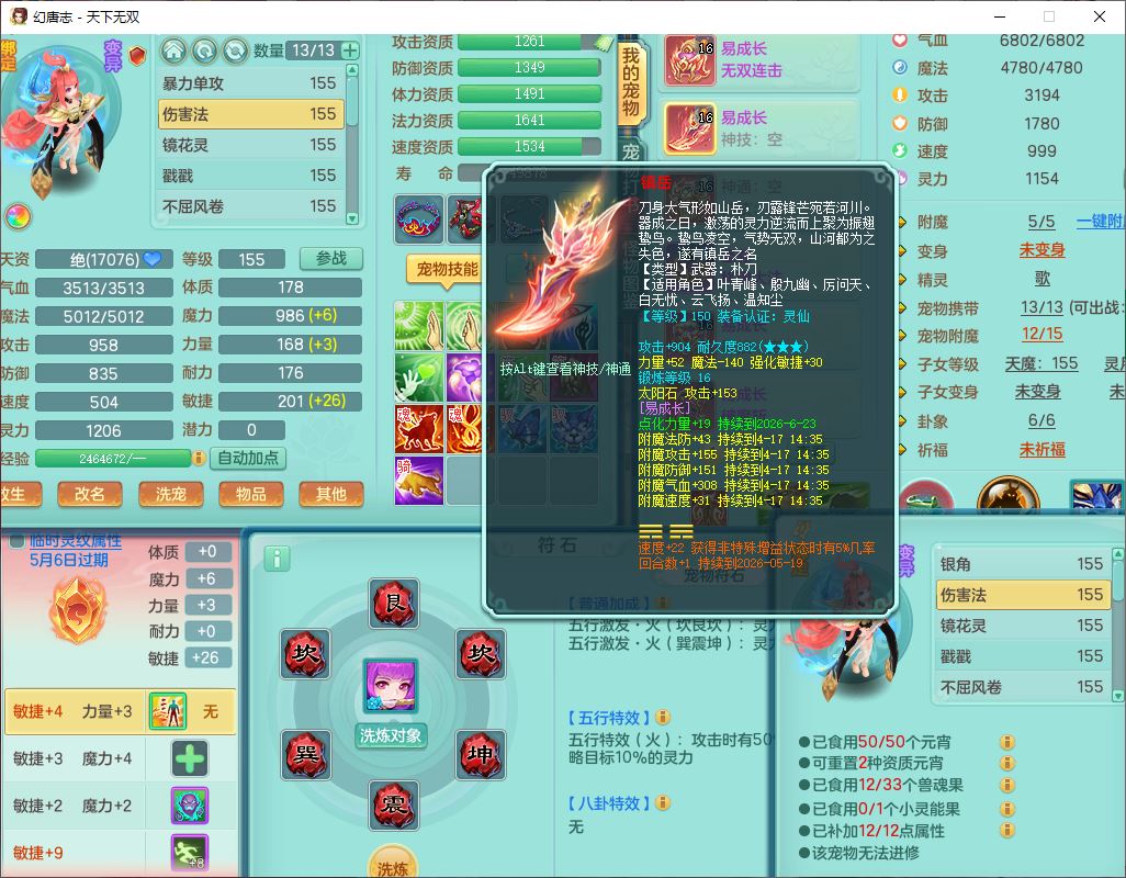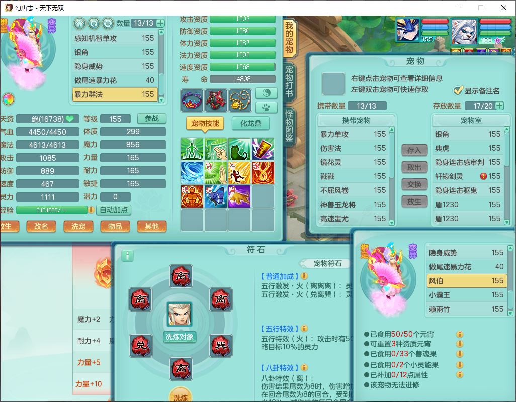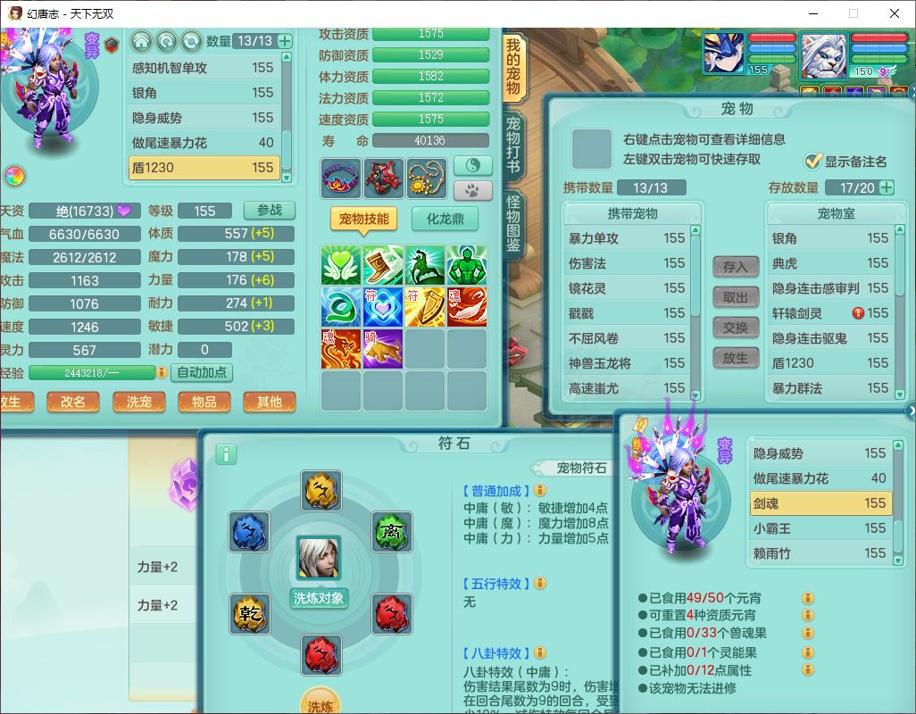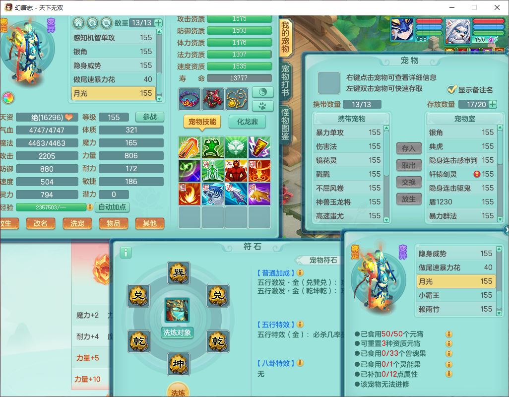 tx10323天下无双159男万兽【马上发财+火焰之力】精灵歌,1内(带蛇影,破境)3镜花(1胚子)4特殊(勇猛、风卷、影袭,兽决破碎)1龙姬,3觉醒1六字12四字,8红装备,Y破血帽子,单加Y武器,坚毅移魂项链,Y破魔鞋子,可搭一套8红法系装,五雷武器,法爆武器,躲避Y衣服,愤怒腰带,法缭鞋子,鼎4.5+70,84天月卡,24个内丹碎片,仓库多护符存货,1双人飞行坐骑,带154奶粉魔王,带双重可换绑