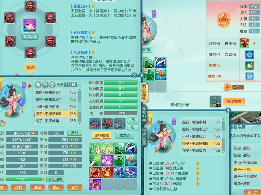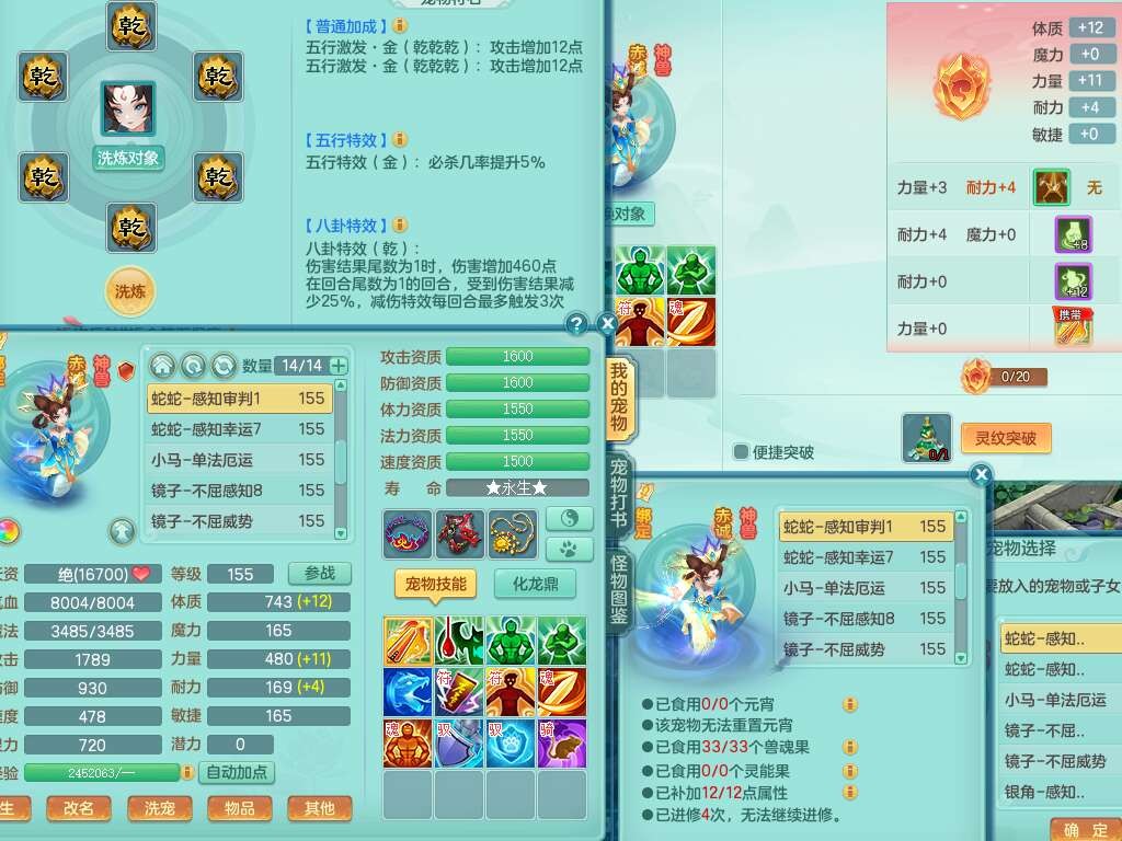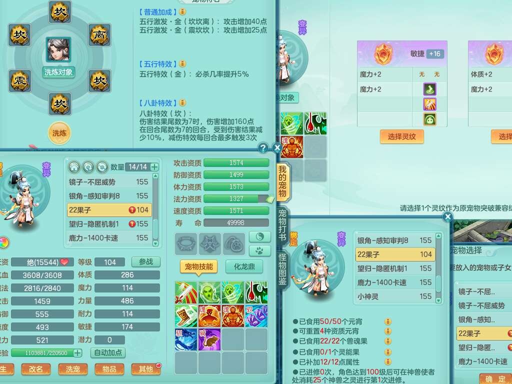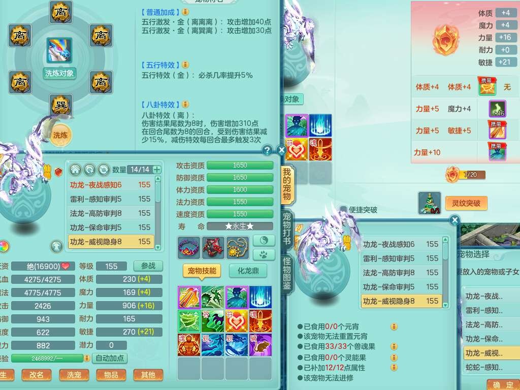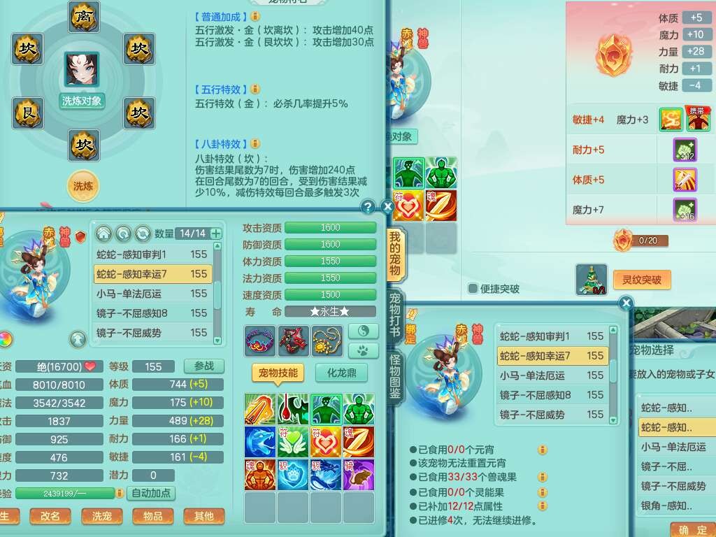 S22243浪淘沙159女魔王,精灵舞,5龙3内胆神,1破镜,9觉醒,4宠皮,4只六技能镜花灵,易成长单加54头,五雷单加56武器,易成长烽火单加50衣服,愤怒慈航单加57腰带,法缭单加51鞋子,5.0基础鼎+70攻+280血,3个纯六字,4个五字,16只满果子,宠排在榜,2只双人坐骑,带50天月卡。带4个153奶粉