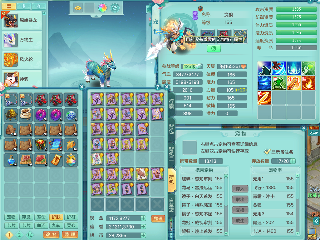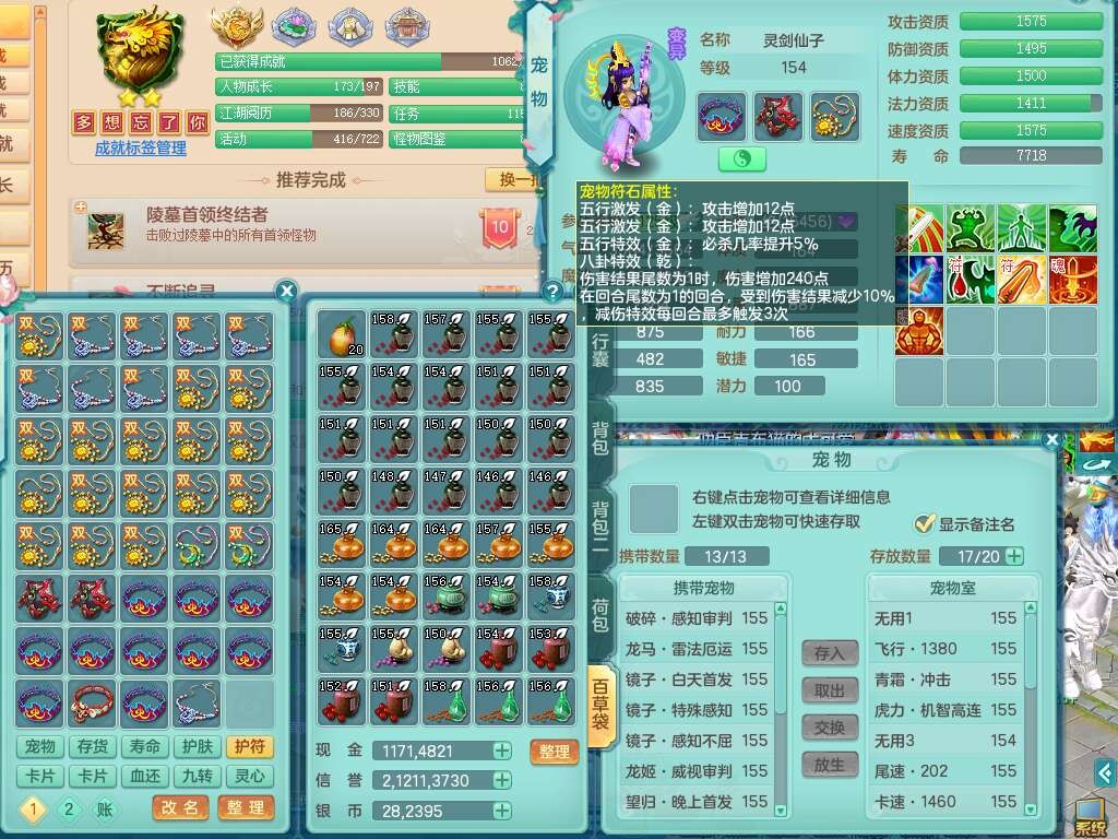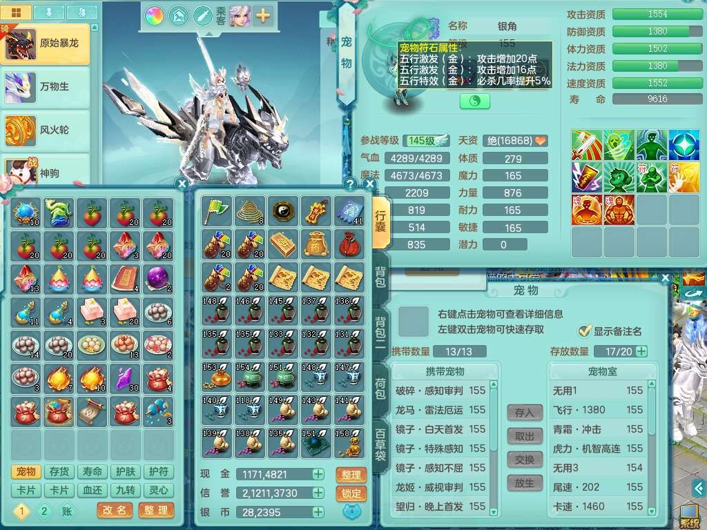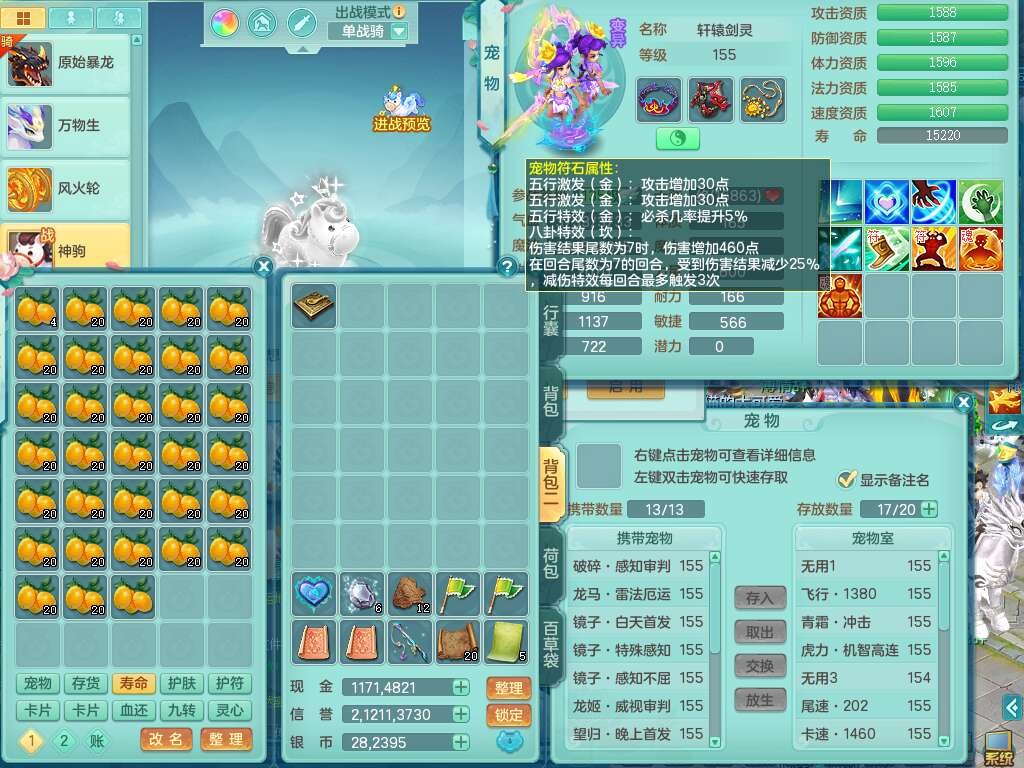 a22252超凡入圣男159男万兽,精灵舞,2内胆神,1破镜,【10觉醒,已潜龙】,8位靓号不含4(AAAABBCC),7宠皮,1特殊(祈雨),3只六技能镜花灵,2只六技能龙姬,易成长单加头,934必杀魔音摄心单加武器,神佑四海链子,愤怒易成长单加腰带,易成长崩山单加54鞋子,5.5基础鼎+70攻+280血,10个纯六字,2个五字,17只满果子,仓库还有101个果子,有30个神兽内丹碎片,2只双人坐骑,暴龙泰坦+逍客+神驹心想事成+火焰之力武器+西瓜冰武器,带11169金币,61天月卡。
