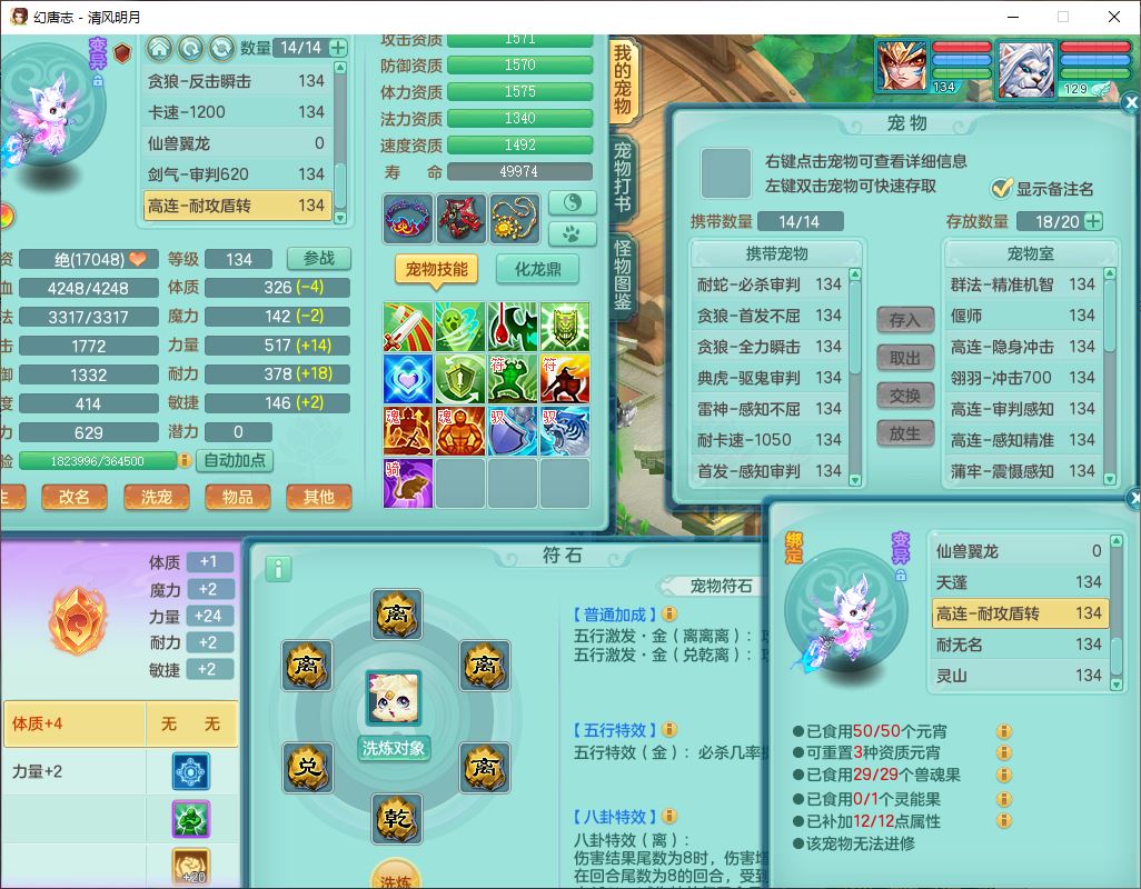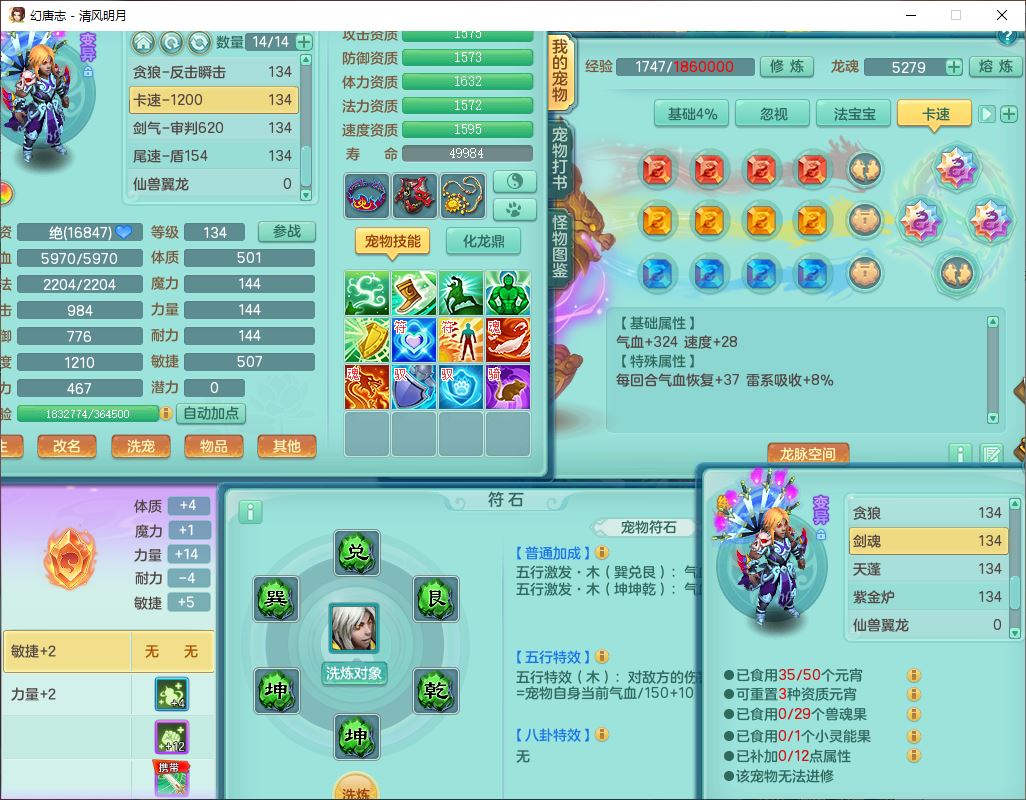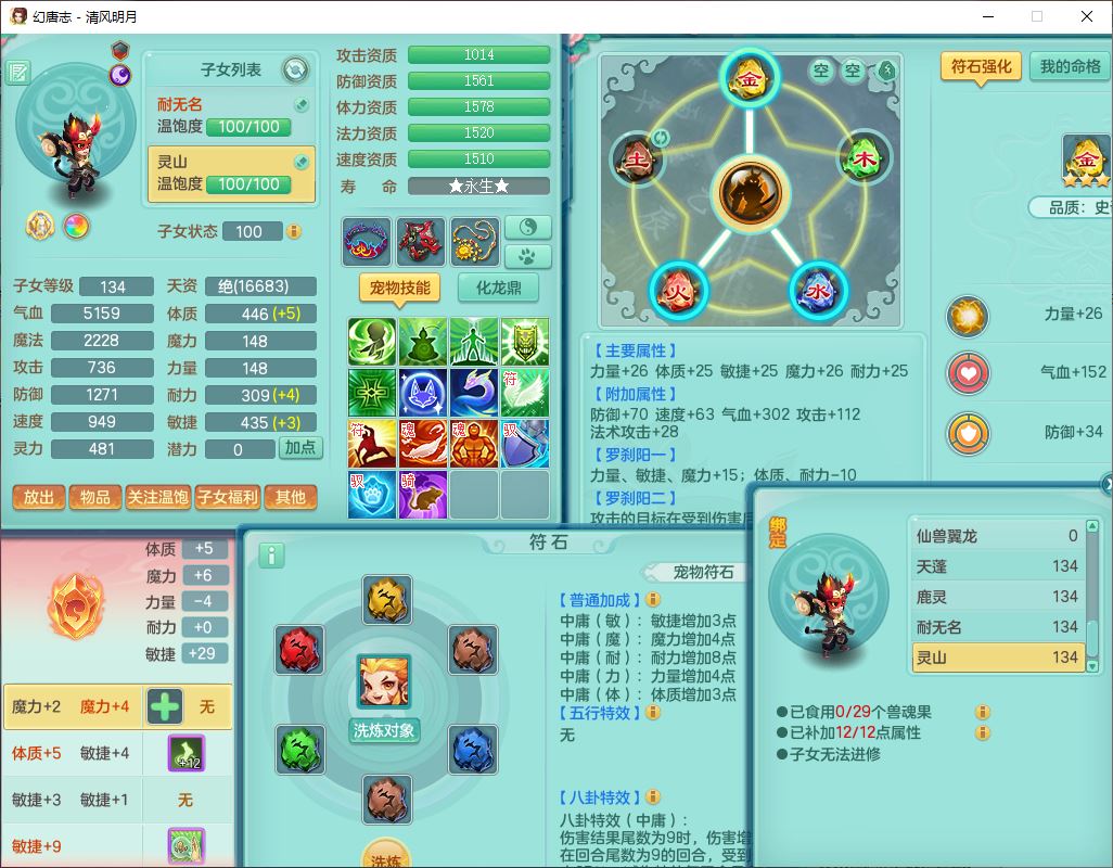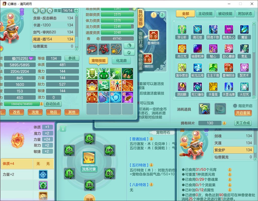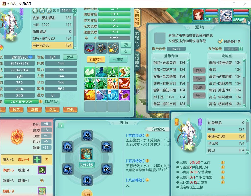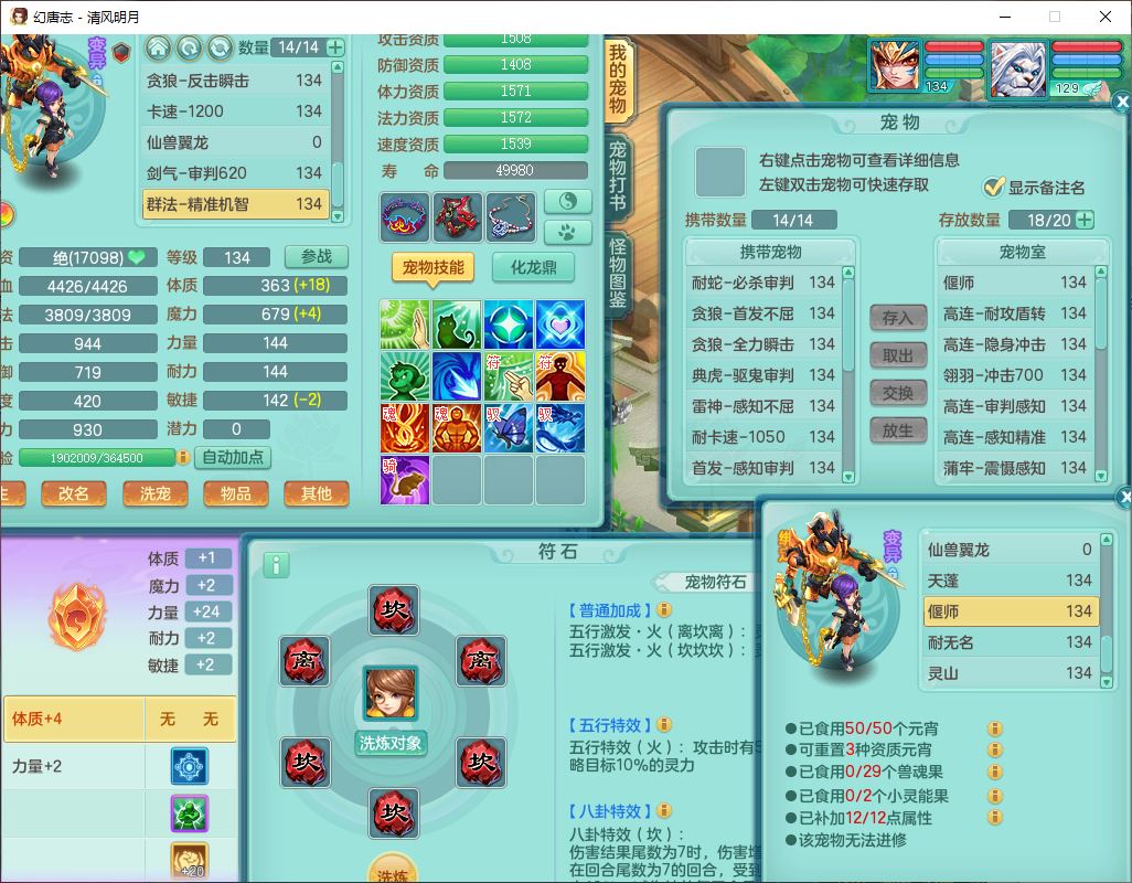 24297清风明月129男万兽【准潜龙号,差1只宝宝3条主符石1条附加】精灵歌,1龙(换、无内)1内丹青蛇3贪狼1神石1金炉,6觉醒7六字1五字13四字13只满果子,8红装备,必杀激励武器,崩山衣服,神佑项链,Y慈航腰带,仓库多双红,可搭星辰只有法系装,法爆回天武器,幸运法缭笑里衣服,鼎4.5+56+224,23个内丹碎片,1双人飞行坐骑