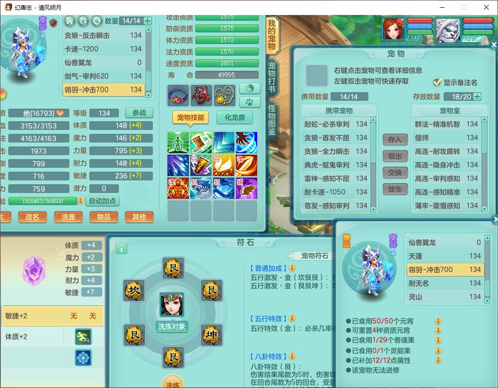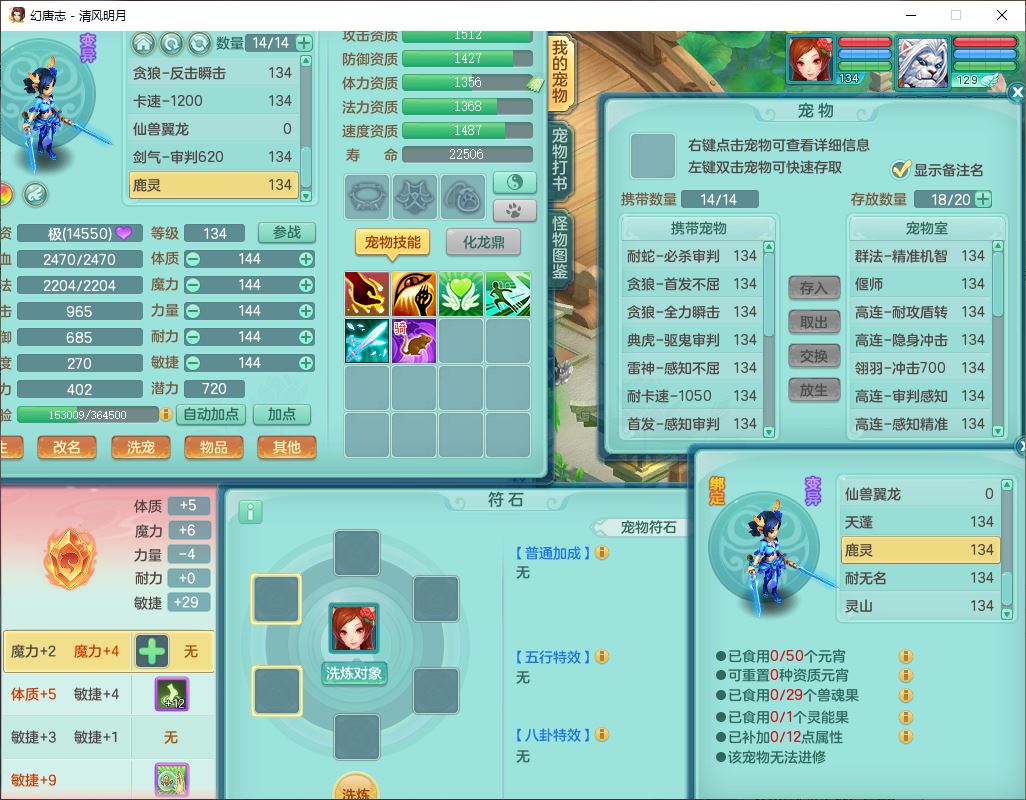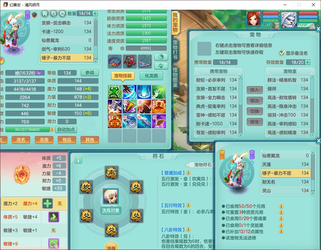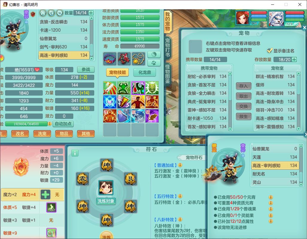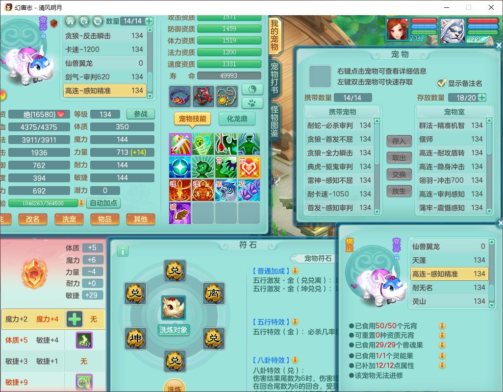 24297清风明月129男万兽【准潜龙号,差1只宝宝3条主符石1条附加】精灵歌,1龙(换、无内)1内丹青蛇3贪狼1神石1金炉,6觉醒7六字1五字13四字13只满果子,8红装备,必杀激励武器,崩山衣服,神佑项链,Y慈航腰带,仓库多双红,可搭星辰只有法系装,法爆回天武器,幸运法缭笑里衣服,鼎4.5+56+224,23个内丹碎片,1双人飞行坐骑