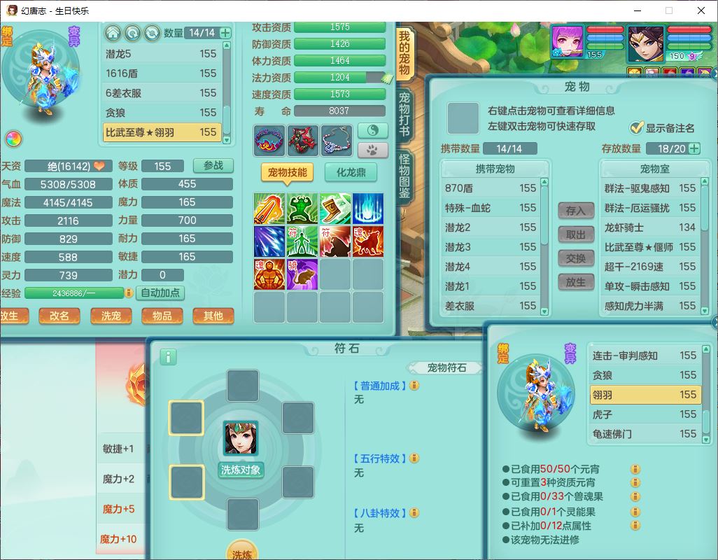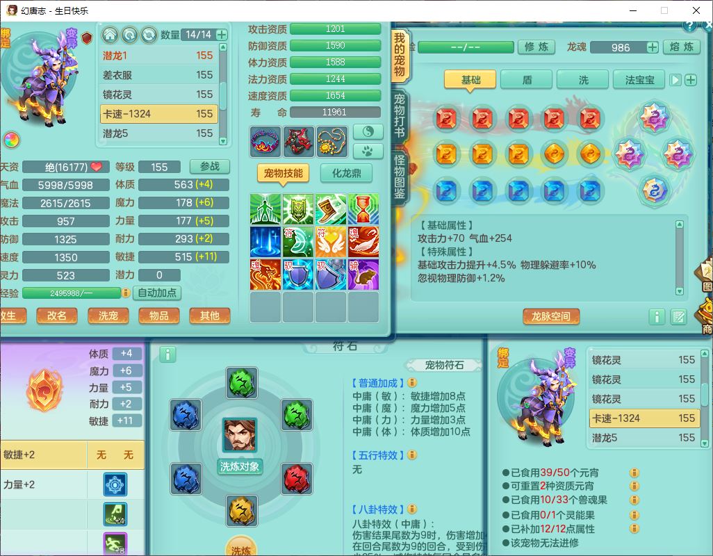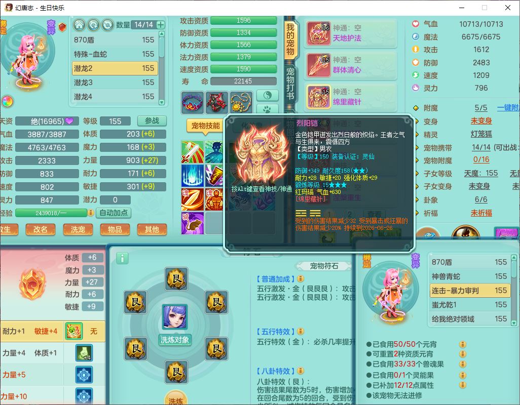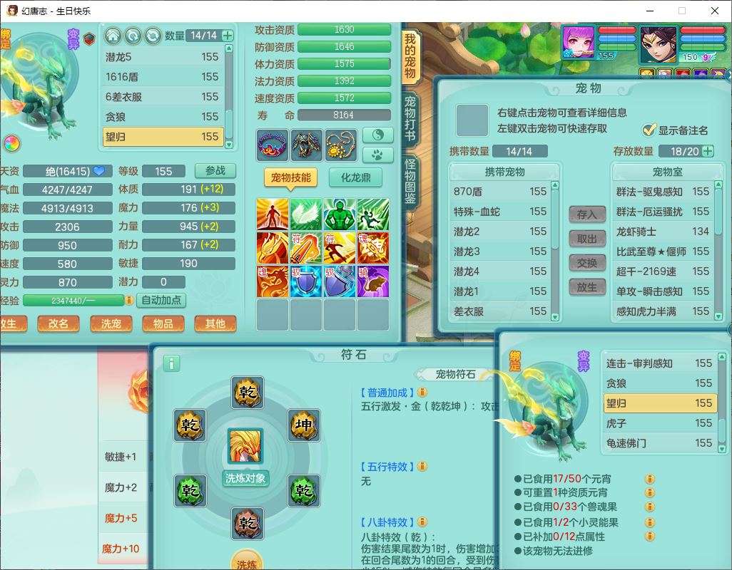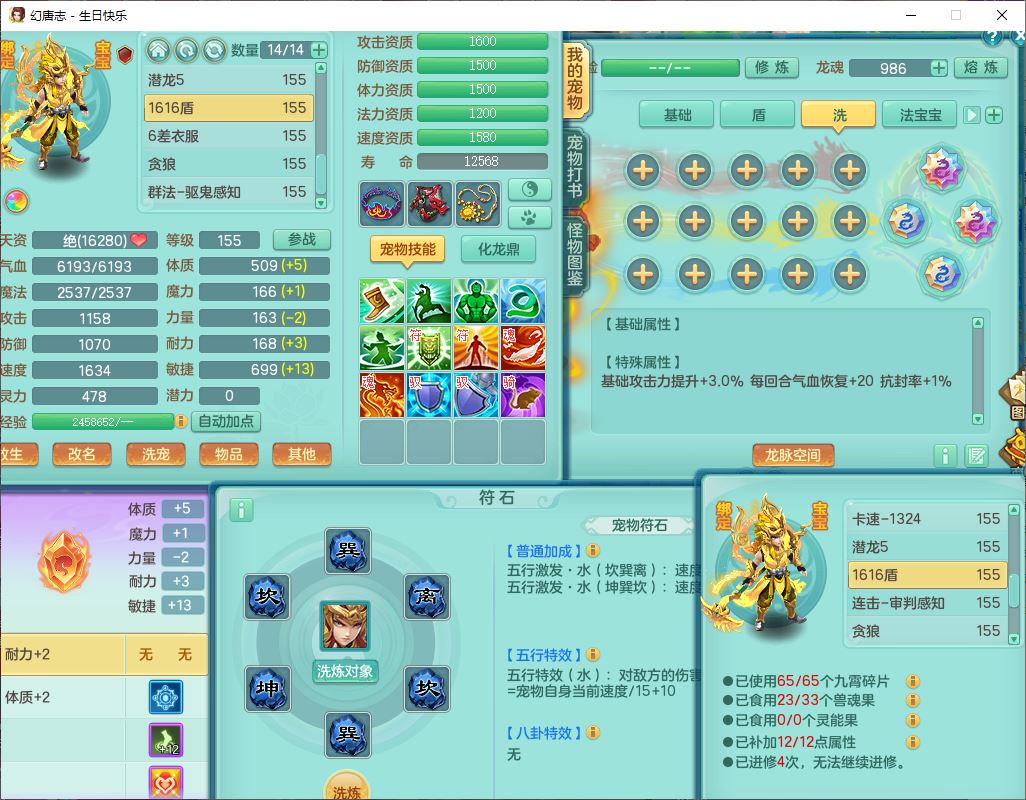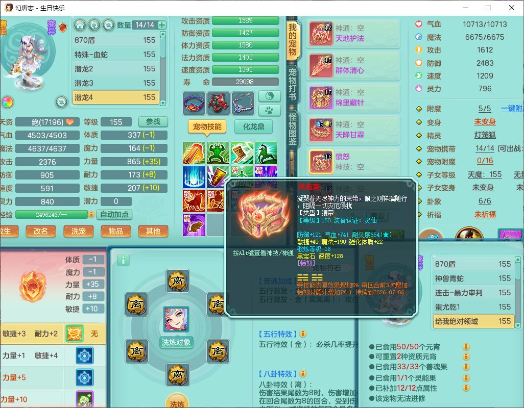 62433生日快乐159男普陀【准潜龙号,差2只宝宝2颗厚土】精灵舞,1龙(换、无内)1内丹青蛇3镜花1望归,9觉醒1宠皮8六字1五字5四字综合14只满果子,愤怒五特装备,有物理装,Y帽子,神佑项链,鼎4.5+70,法爆8.7,150天月卡,永久外观,14个内丹碎片,1双人飞行坐骑