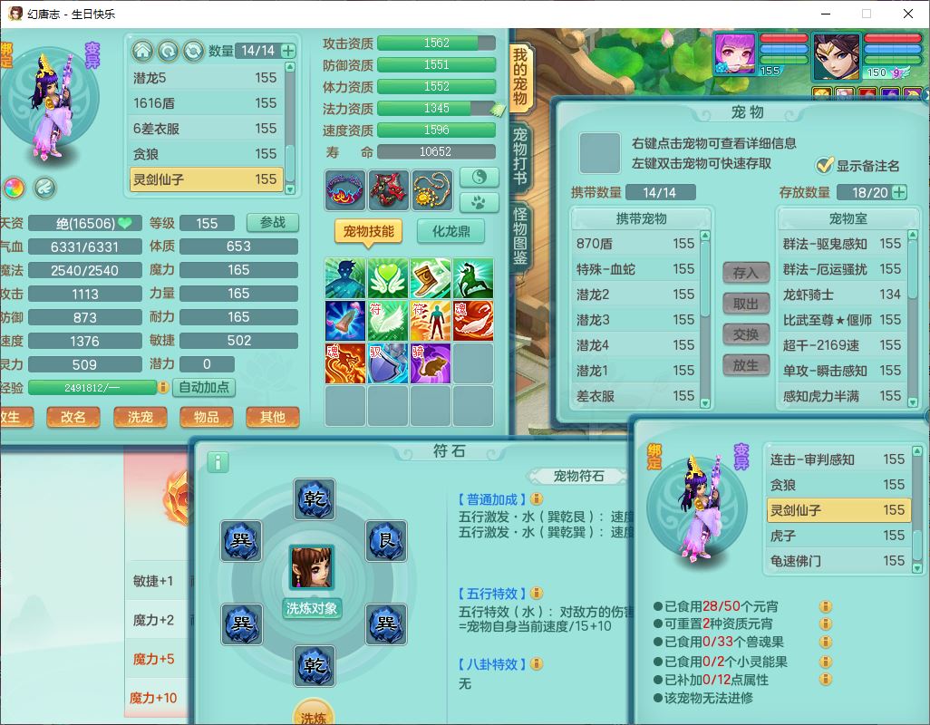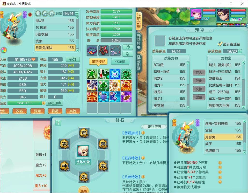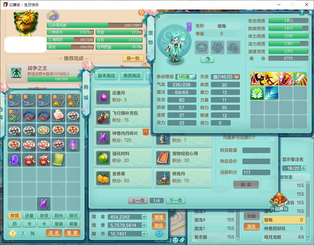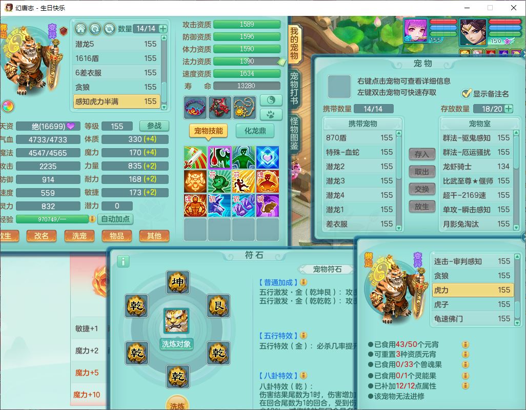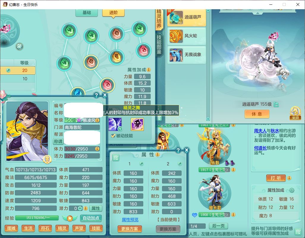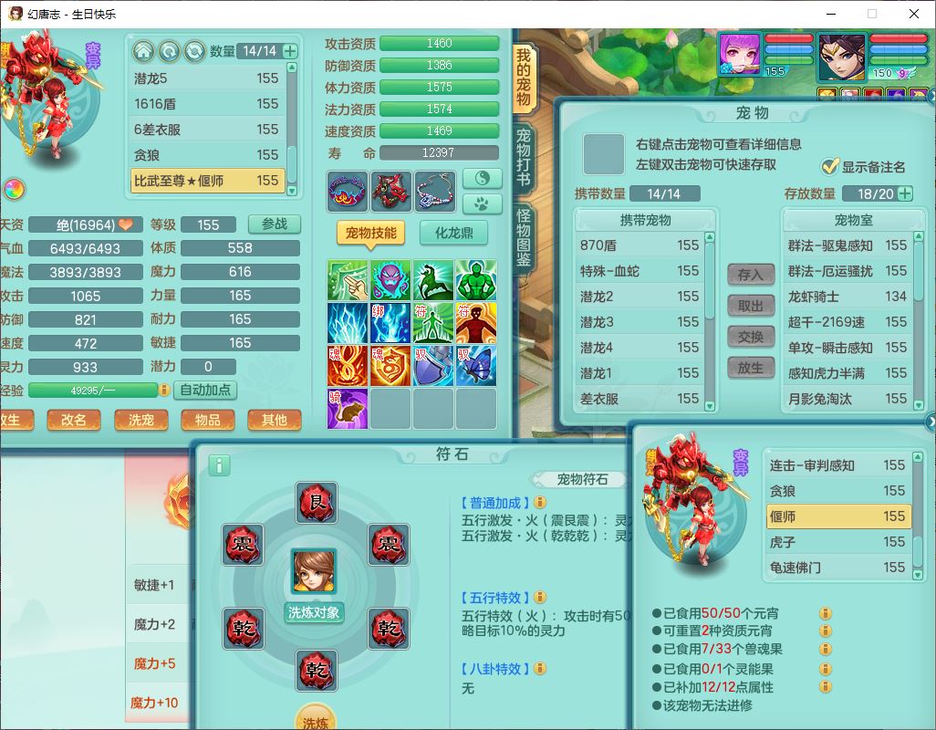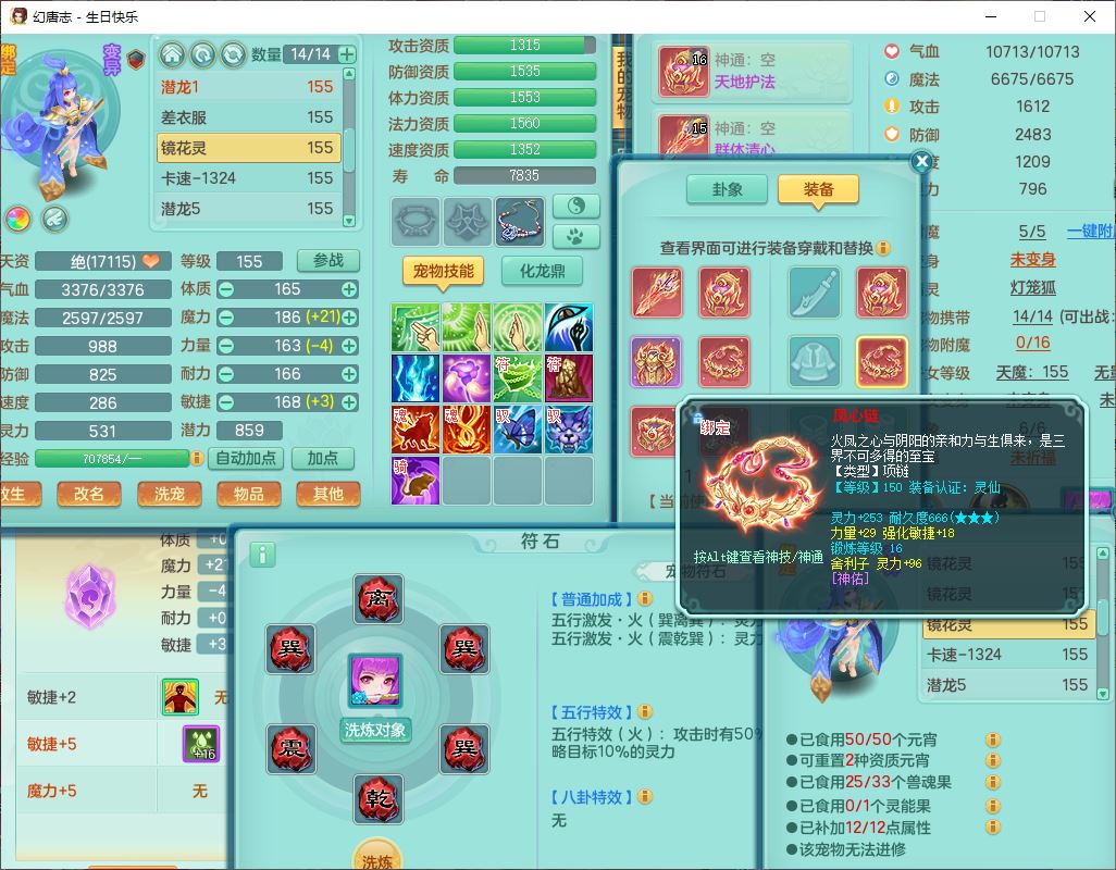 62433生日快乐159男普陀【准潜龙号,差2只宝宝2颗厚土】精灵舞,1龙(换、无内)1内丹青蛇3镜花1望归,9觉醒1宠皮8六字1五字5四字综合14只满果子,愤怒五特装备,有物理装,Y帽子,神佑项链,鼎4.5+70,法爆8.7,150天月卡,永久外观,14个内丹碎片,1双人飞行坐骑