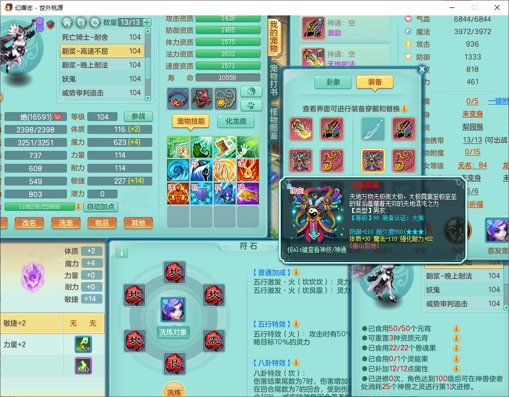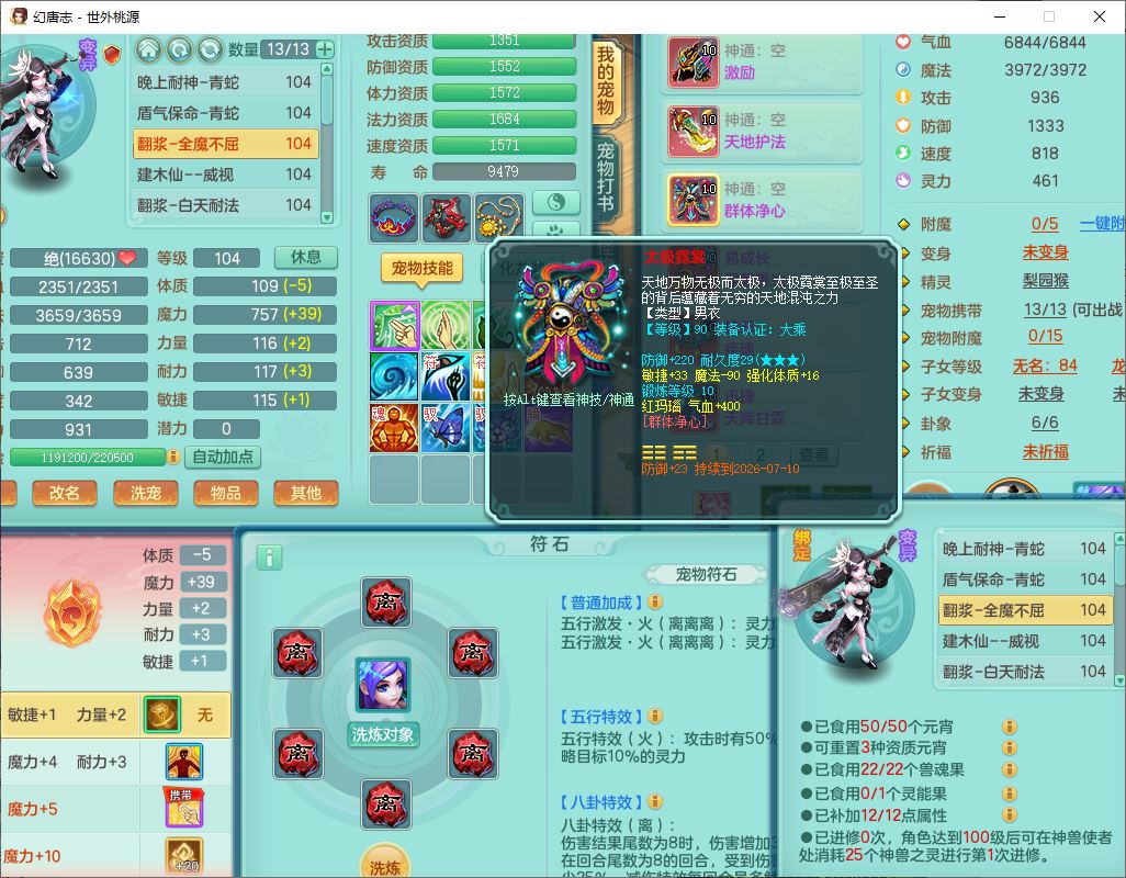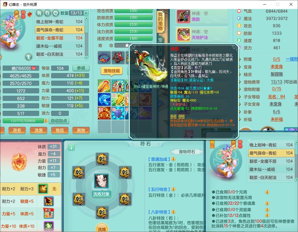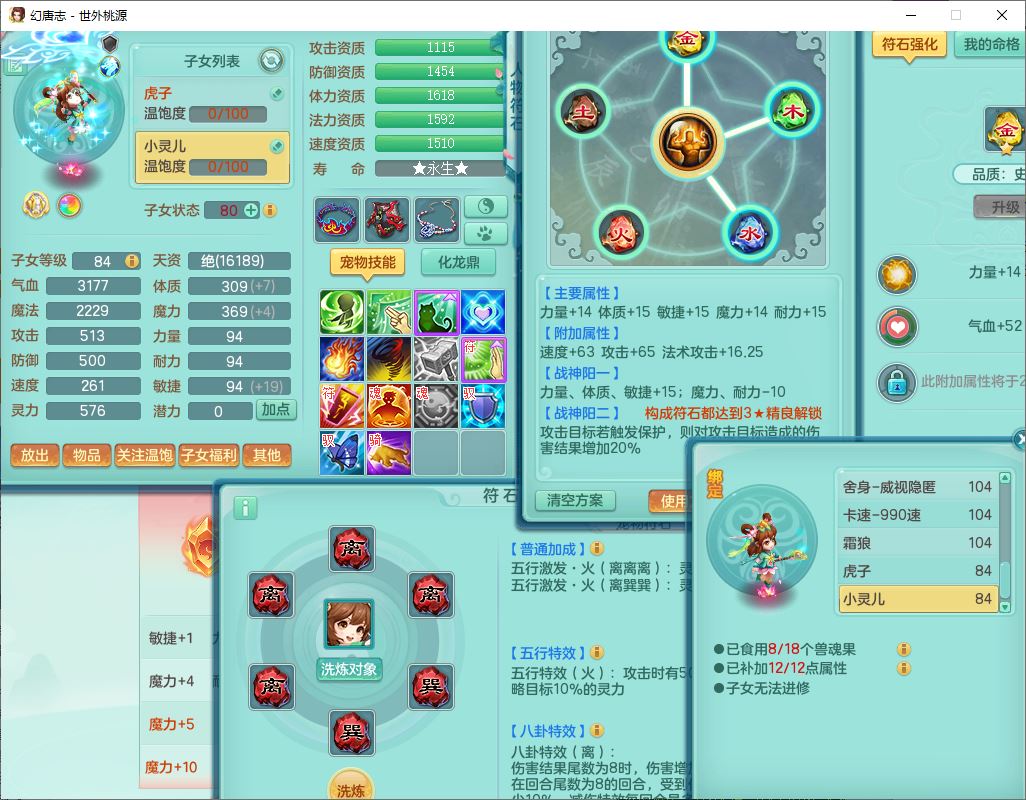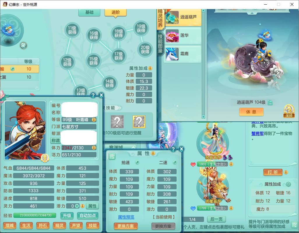 62431世外桃源99男方寸体敏、力体敏双精灵, 2内丹青蛇5翻江5舍身1七技能雷光妖鬼1金炉,4觉醒1宠皮5六字1五字11四字14只满果子,9红装备,Y慈航项链,愤怒疾速腰带,迅捷四海鞋子,有物理装备,崩山衣服,愤怒四海腰带,神佑四海项链,鼎2.5,2套符石,3坐骑(1双人飞行)