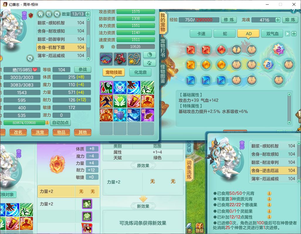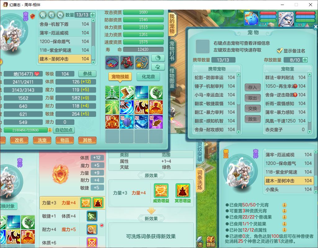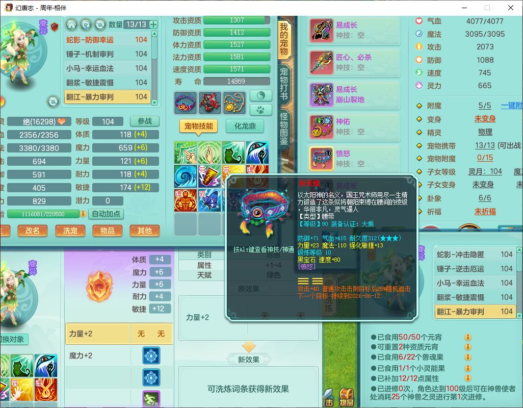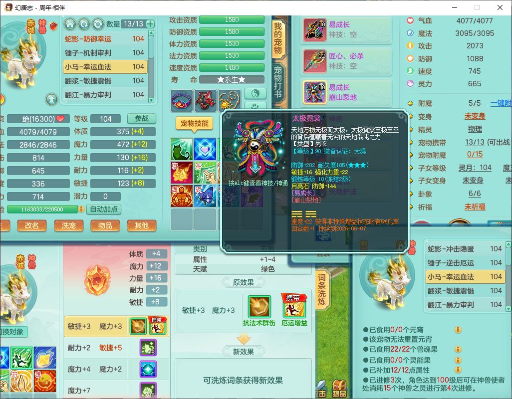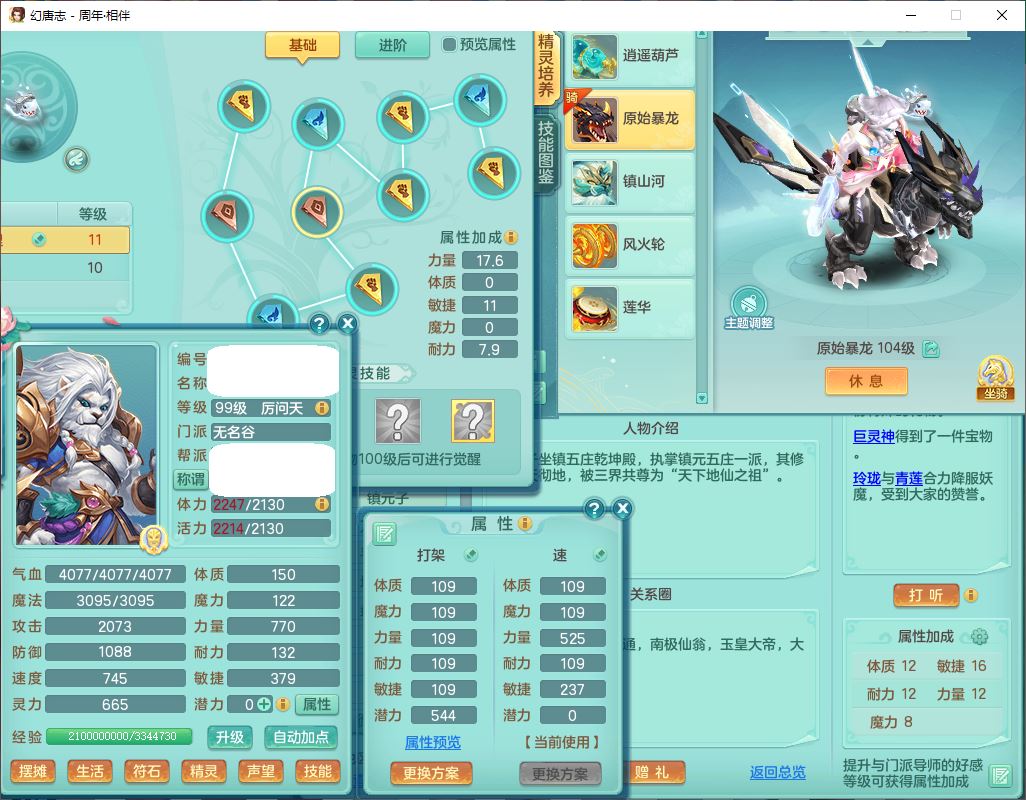 52683周年相伴99男无名【暴龙泰坦+西瓜冰】力敏耐精灵,3内(1龙马1蛇影)4翻江3舍身1建木1金炉,5觉醒10宠皮12只满果子,9红装备,匠心必杀武器,Y崩山衣服,神佑项链,Y罗汉鞋子,鼎2.5,永久外观、精灵皮肤,10个内丹碎片,4坐骑(1双人飞行)