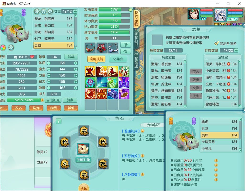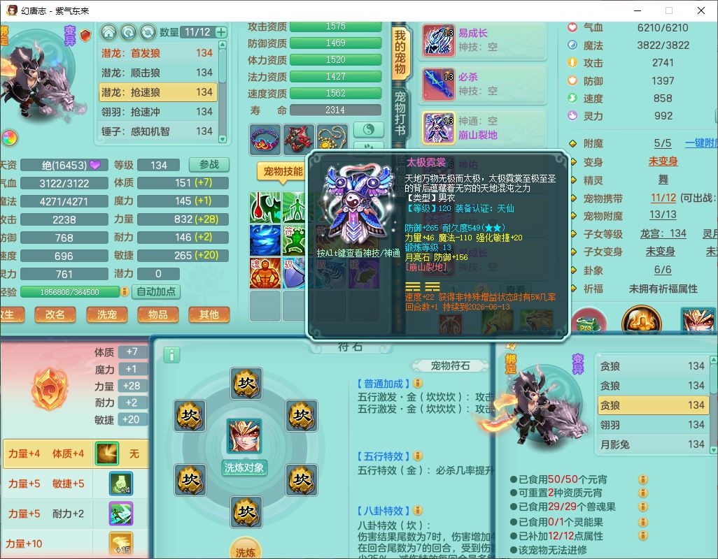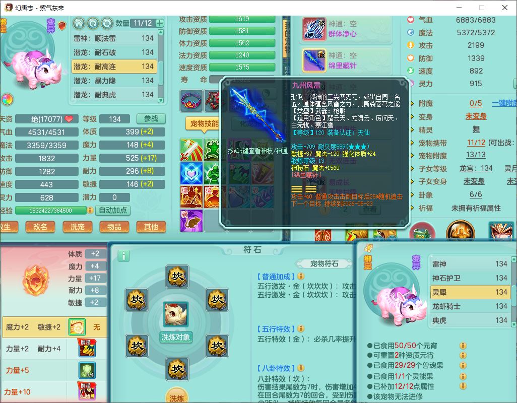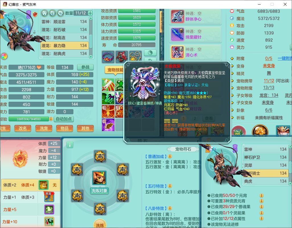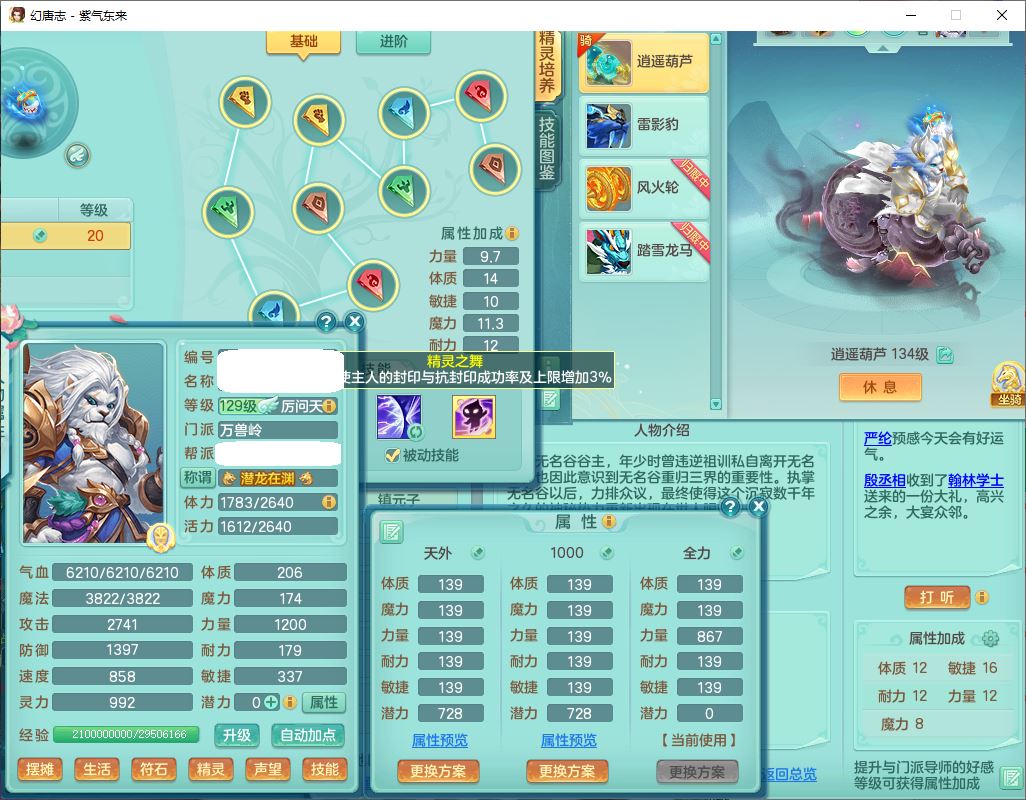 24285紫气东来129男万兽【潜龙号】精灵舞,3贪狼1神石1典虎,7觉醒9六字1五字4四字15只满果子,装备齐全,必杀武器,崩山衣服,神佑项链,一套辅助装备,Y四海鞋子,鼎4.0+56+224,永久外观、精灵皮肤,76个仙兽灵,25个内丹碎片,仓库多存货,2坐骑(1双人飞行),带150奶粉