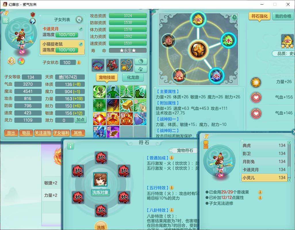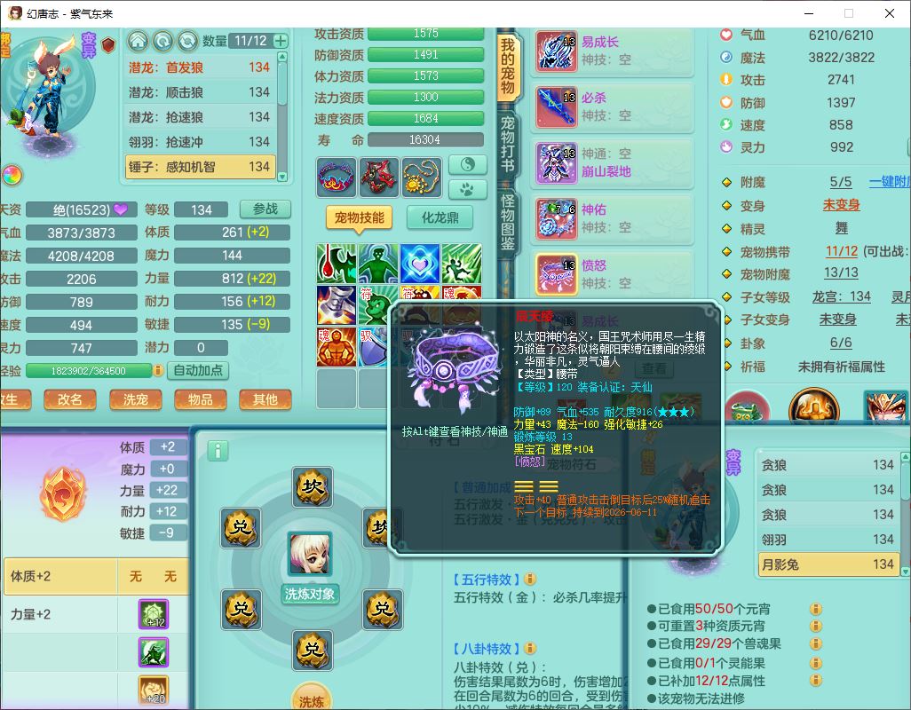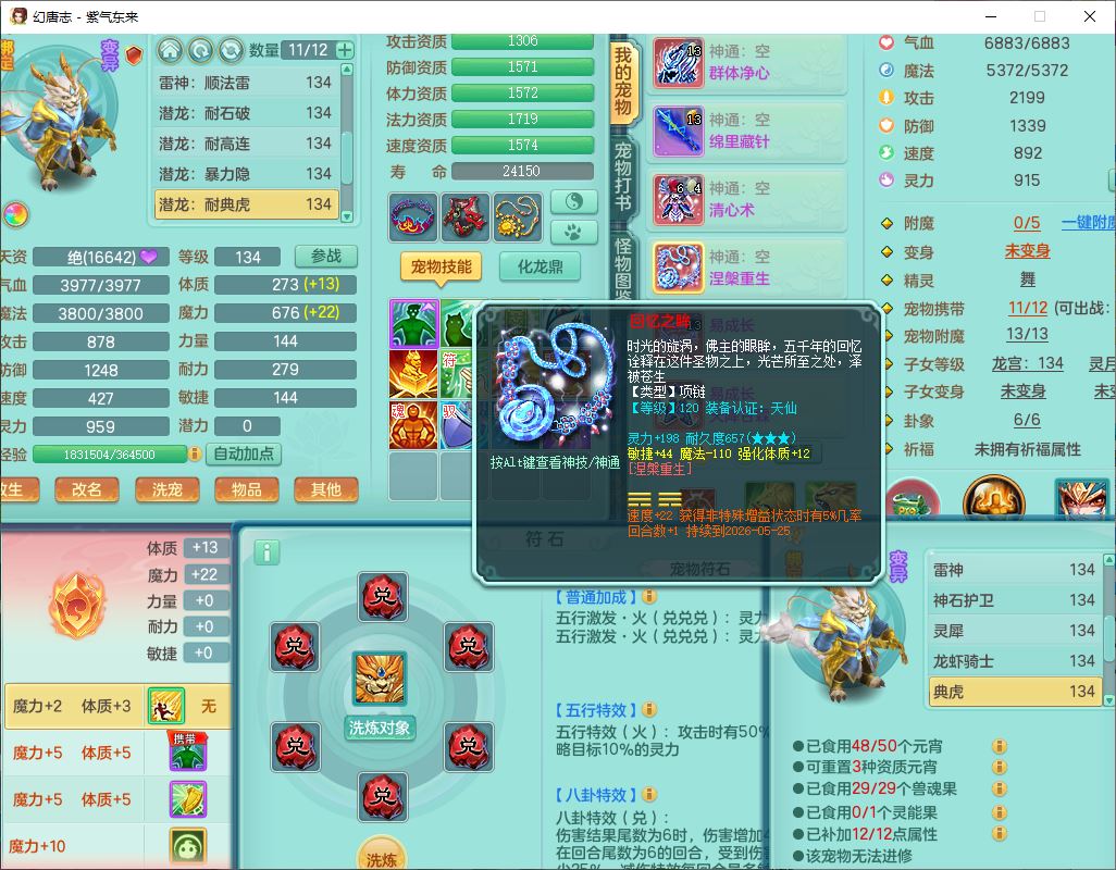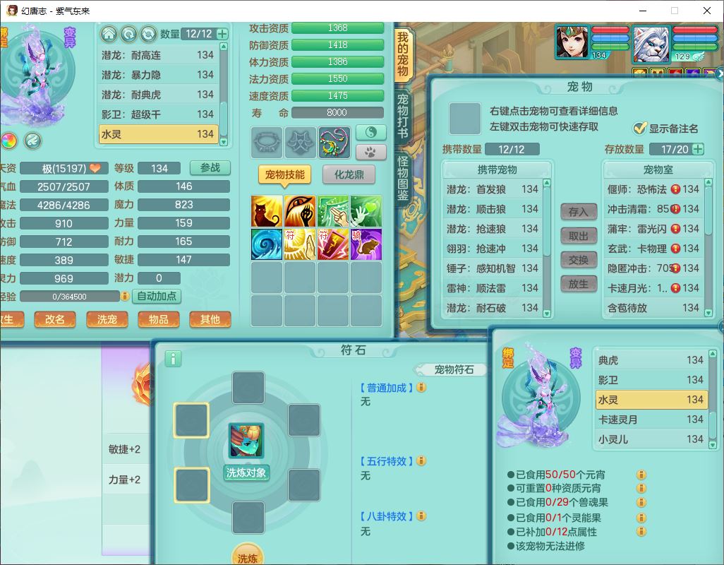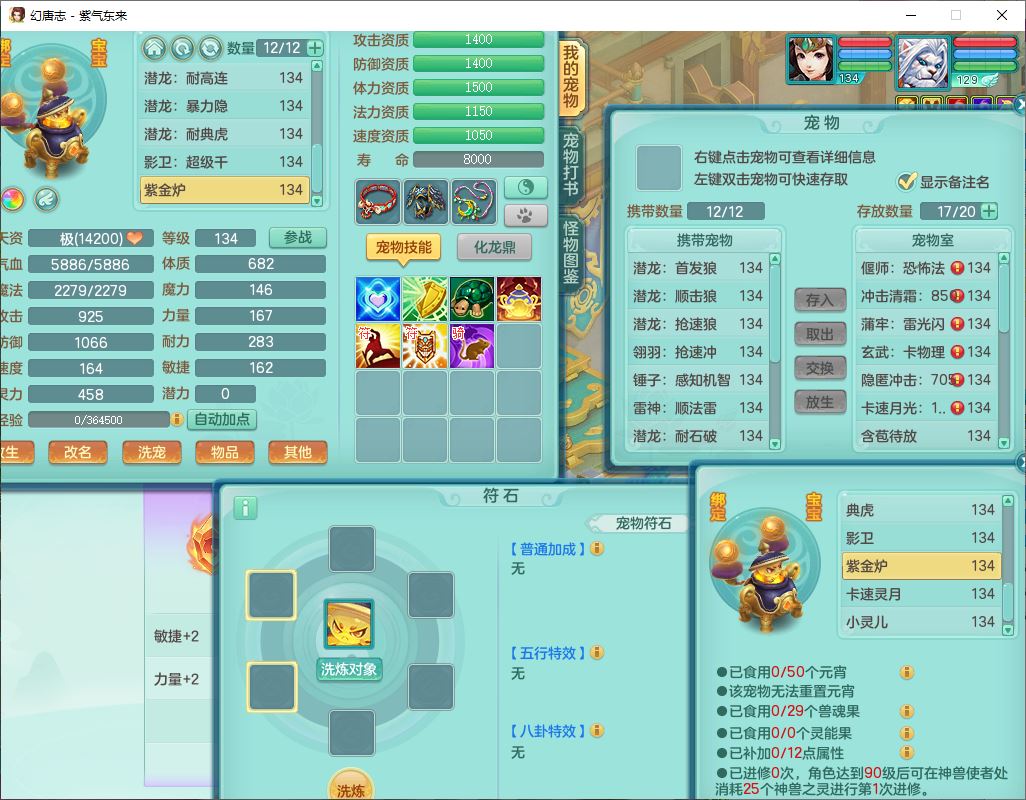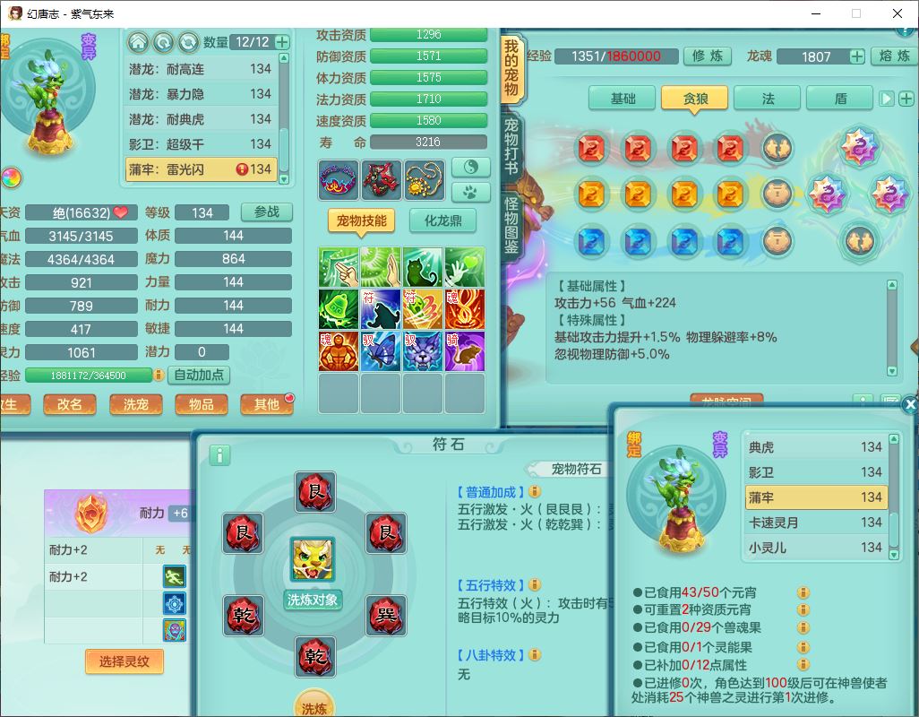 24285紫气东来129男万兽【潜龙号】精灵舞,3贪狼1神石1典虎,7觉醒9六字1五字4四字15只满果子,装备齐全,必杀武器,崩山衣服,神佑项链,一套辅助装备,Y四海鞋子,鼎4.0+56+224,永久外观、精灵皮肤,76个仙兽灵,25个内丹碎片,仓库多存货,2坐骑(1双人飞行),带150奶粉