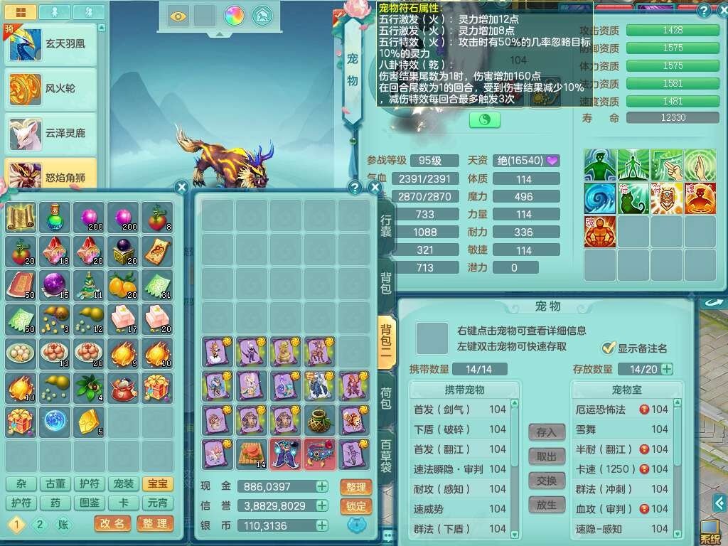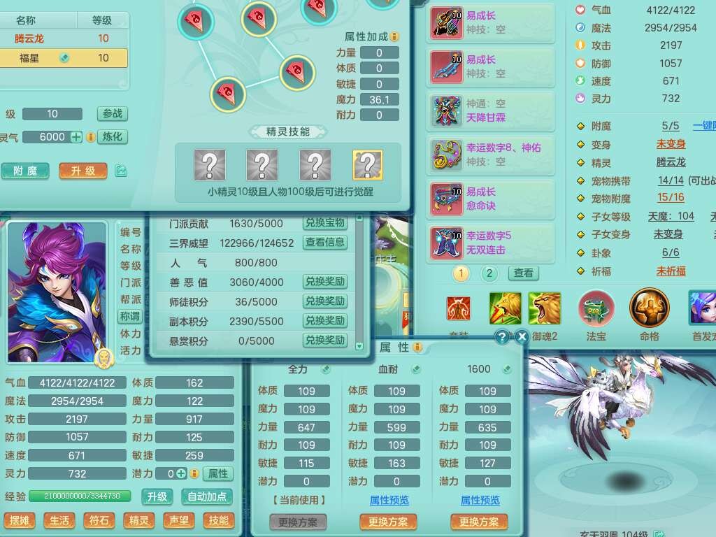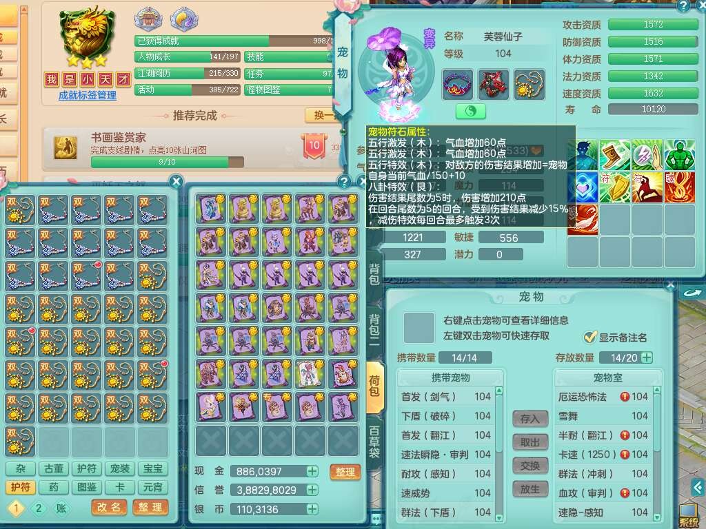 S22120扬名立万99男万兽,1龙1内胆神,10觉醒,1宠皮,易成长单加35头,553易成长单加武器,神佑幸运8项链,易成长愈命诀单加33腰带,幸运55破血单加32鞋子,有迅捷单加33鞋子,法爆单加35武器,2.5基础鼎+42攻,5个纯六字,2个五字,18只满果子,仓库还有28个果子,宠排在榜,3个孩子,双人坐骑,有55个仙兽蛋,36个神兽内丹碎片,2140金币,带29天月卡。➕156女普陀奶粉,1神兽,4.5基础鼎。