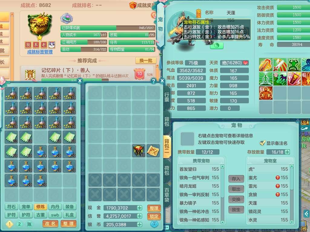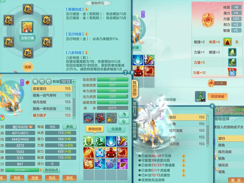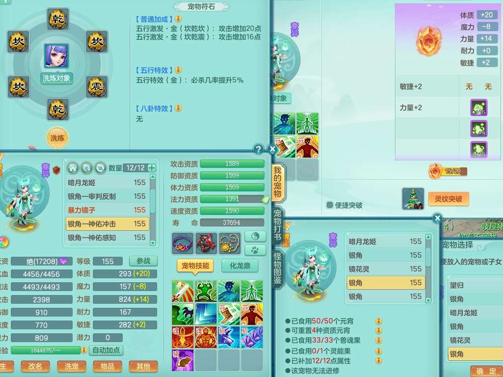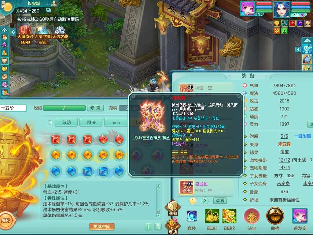 A22115风驰电掣159女龙宫,精灵歌,2只觉醒,2特殊(禁锢,舍身),1只6技能镜花灵,1只6技能龙姬,五雷头,921击退单加武器,4件易成长全高单加,4.5基础鼎,8只满果子,仓库39神兽内丹碎片,26仙兽蛋,带二百万银币,月卡还有30天。