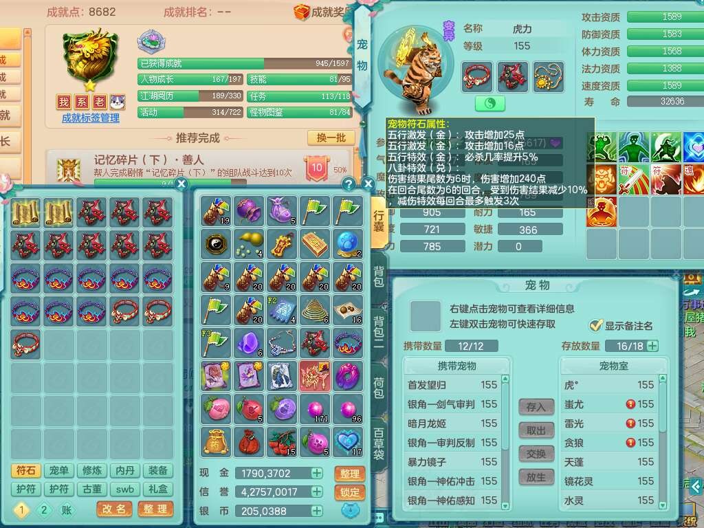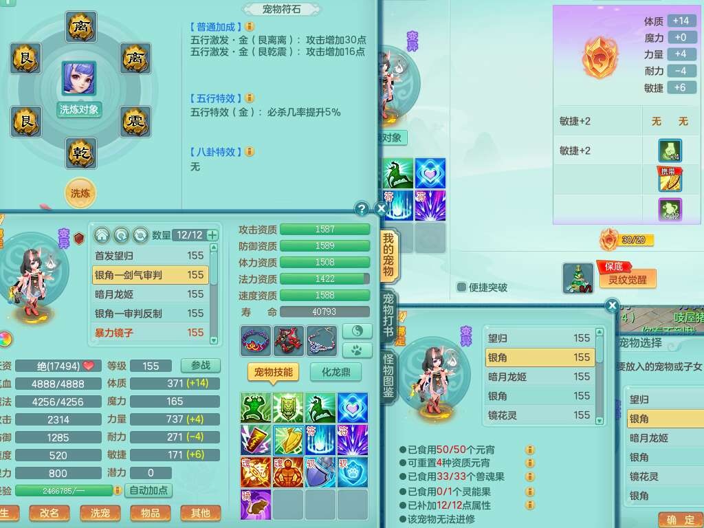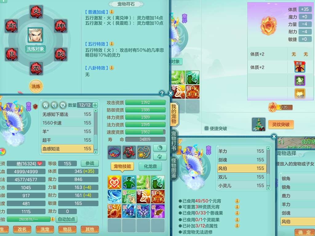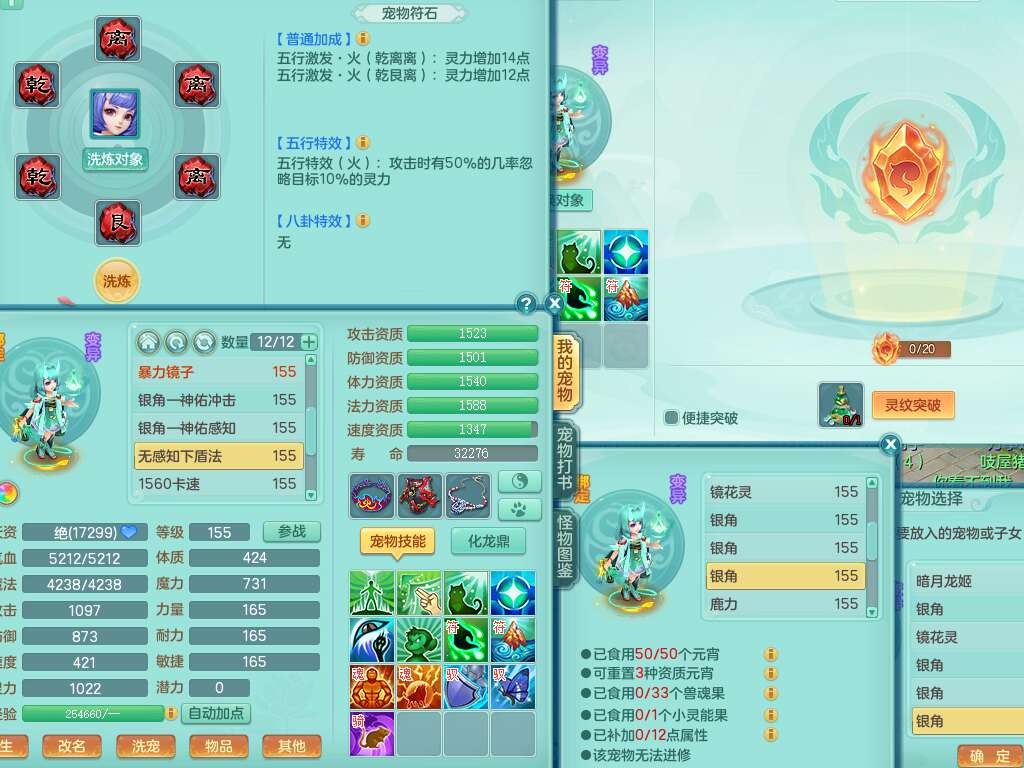 A22115风驰电掣159女龙宫,精灵歌,2只觉醒,2特殊(禁锢,舍身),1只6技能镜花灵,1只6技能龙姬,五雷头,921击退单加武器,4件易成长全高单加,4.5基础鼎,8只满果子,仓库39神兽内丹碎片,26仙兽蛋,带二百万银币,月卡还有30天。