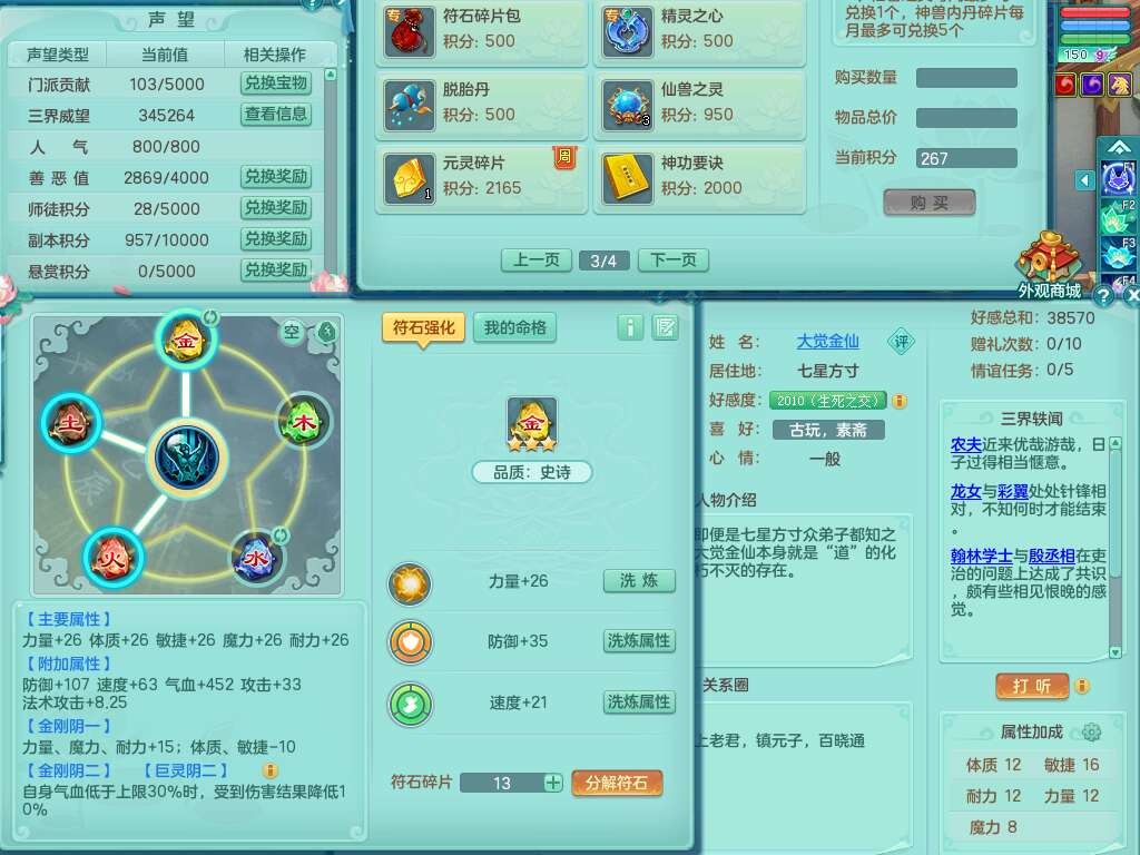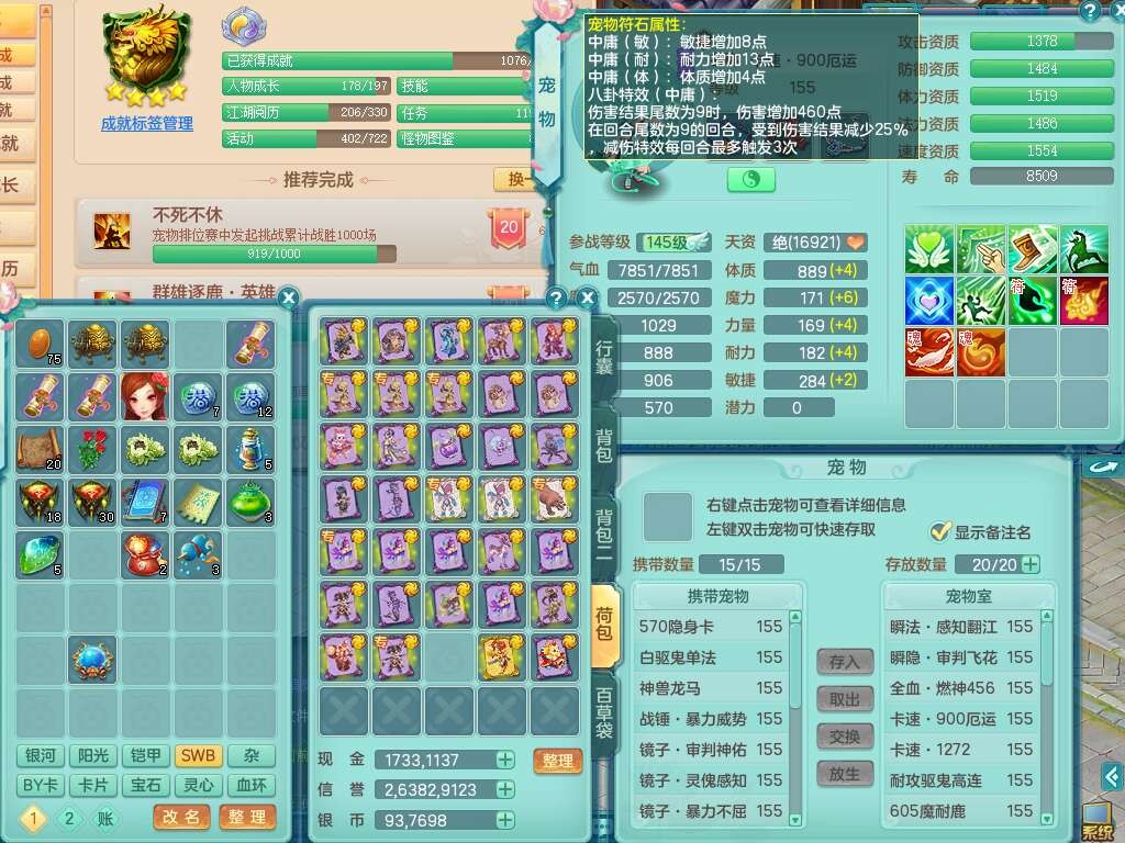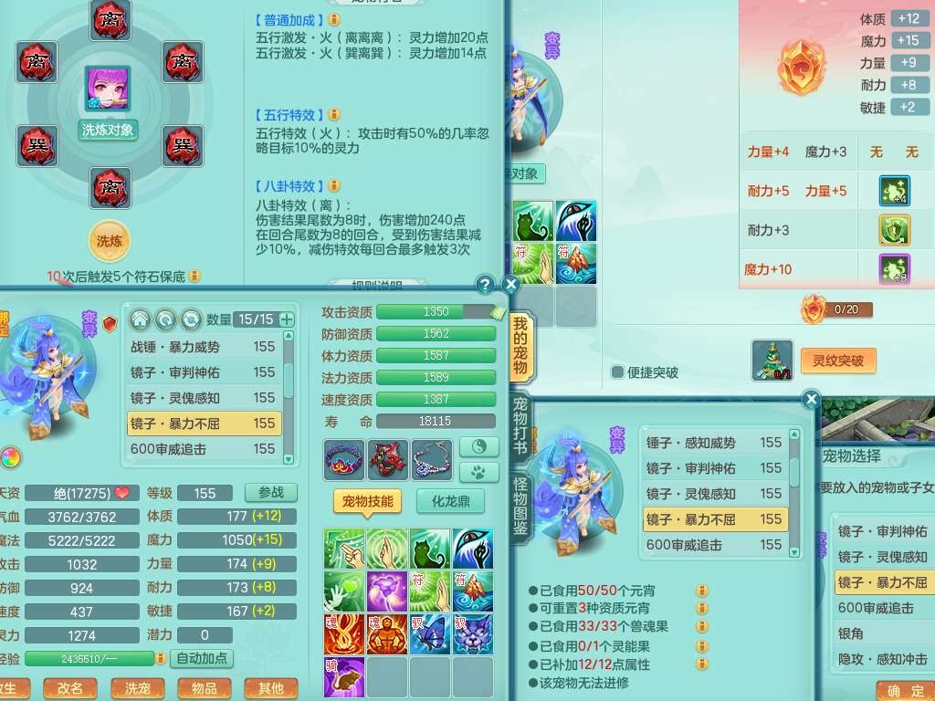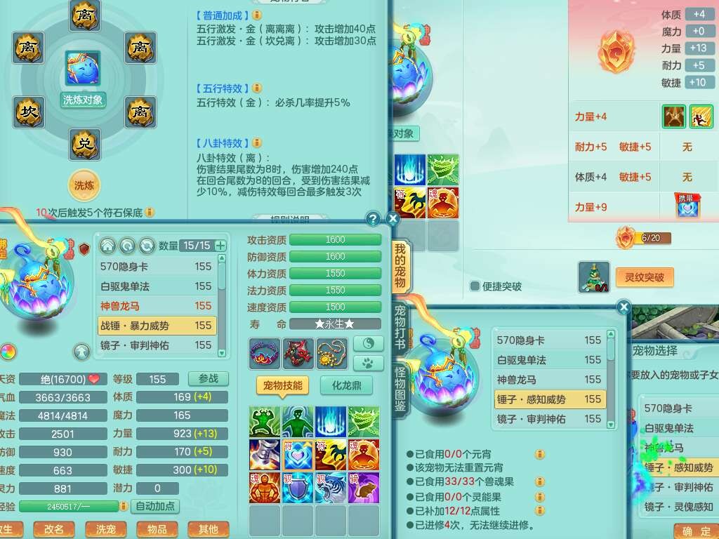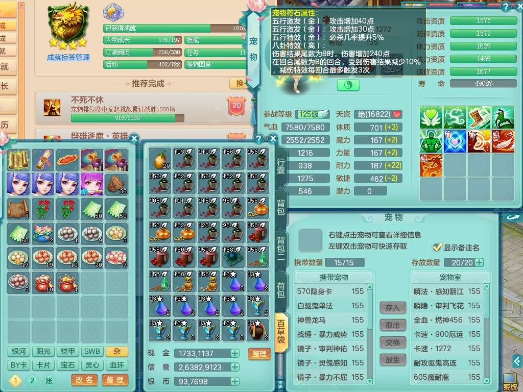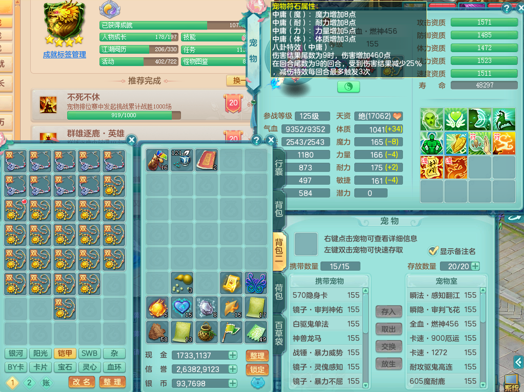 p22122江山如画159男灵月山,精灵舞,2龙2内胆神,11觉醒(潜龙过半,宝宝4只满足,符石只差2个附加,2个厚土龙纹),11宠皮,3特殊(灵傀,翻江,飞花),3只六技能镜花灵,2只六技能龙姬,易成长四海单加衣服,愤怒单加55腰带,五特,5.5基础鼎+70攻,差128积分换永久14个格子,6个纯六字,2个五字,19只满果子,宠排在榜,双人坐骑,西瓜冰武器。