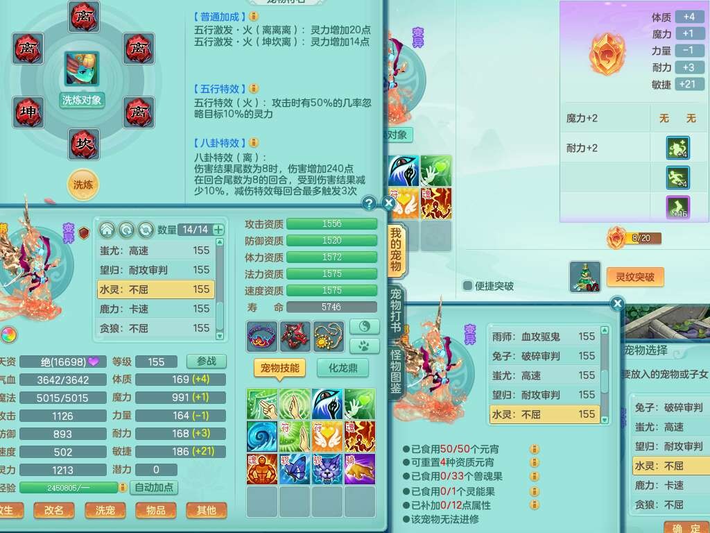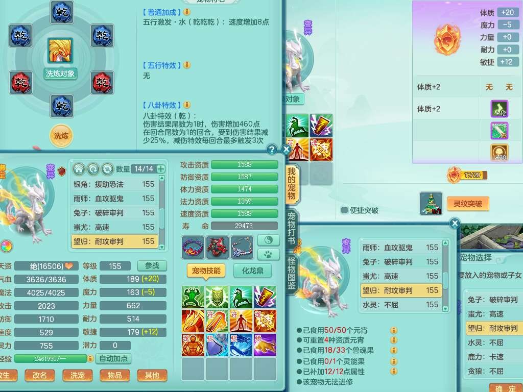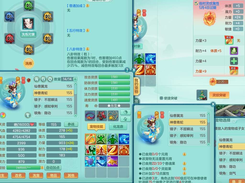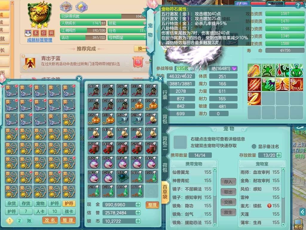 p22097今年勇159男龙宫,精灵歌,1龙,1觉醒,1宠皮,2只六技能镜花灵,法爆单加55武器,易成长单加衣服,272烽火单加56链子,有易成长单加57鞋子,2个五字,4只满果子,双人坐骑,68个仙兽蛋,34个神兽内丹碎片,冰晶庭院。➕159男万兽奶粉,1神兽,1觉醒,易成长笑里单加57头,930必杀武器,神佑链子,易成长单加57鞋,4.5基础鼎,双人坐骑。