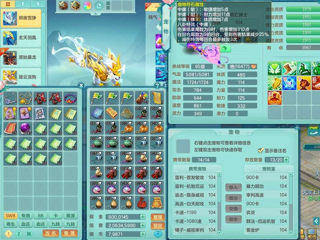 p22096花好月圆99女力天宫,6龙2内胆神,2破镜,【16只觉醒,已潜龙】,4位靓号不含4,5宠皮,554易成长蓄力一击单加33武器,崩山衣服,神佑破血链子,愤怒单加32腰带,迅捷单加35鞋子,有破甲单加32鞋子,2.5基础鼎+42攻+168血,10个纯六字,5个五字,23只满果子,仓库还有60个果子,宠排在榜,6只坐骑,暴龙泰坦+西瓜冰武器,冰晶庭院。