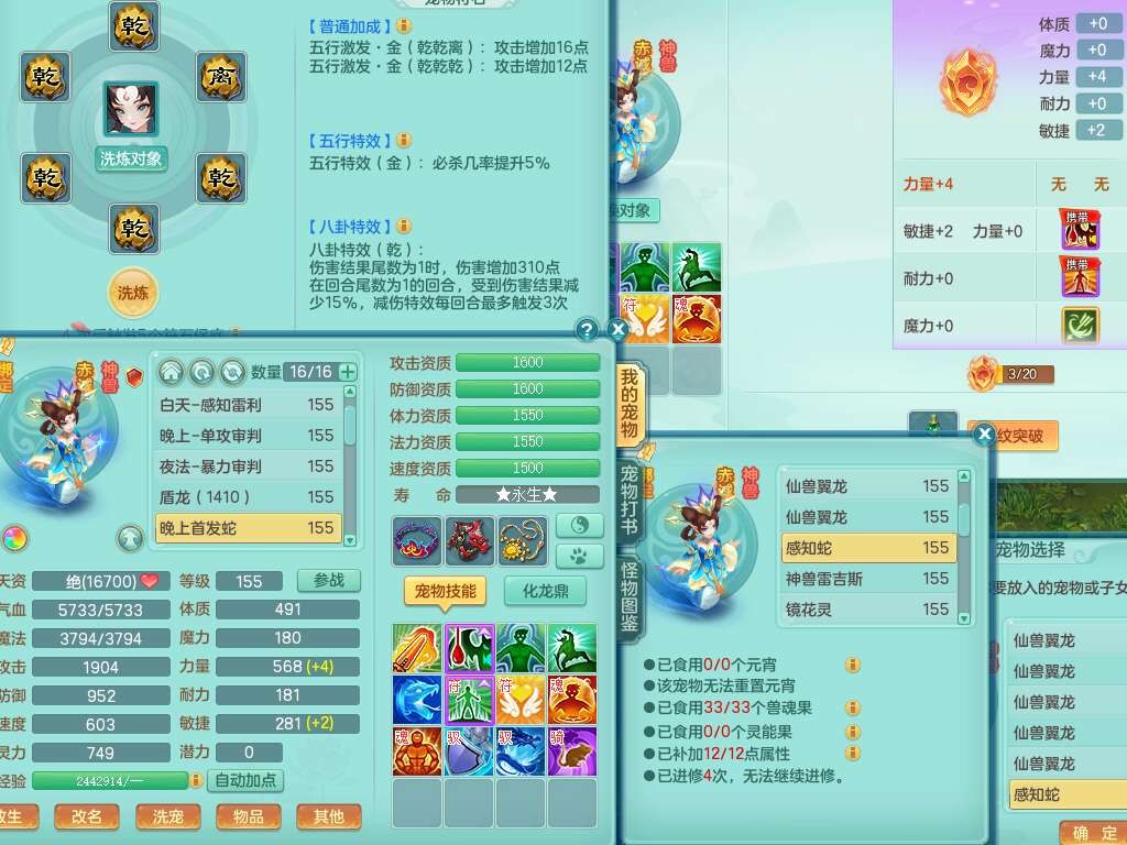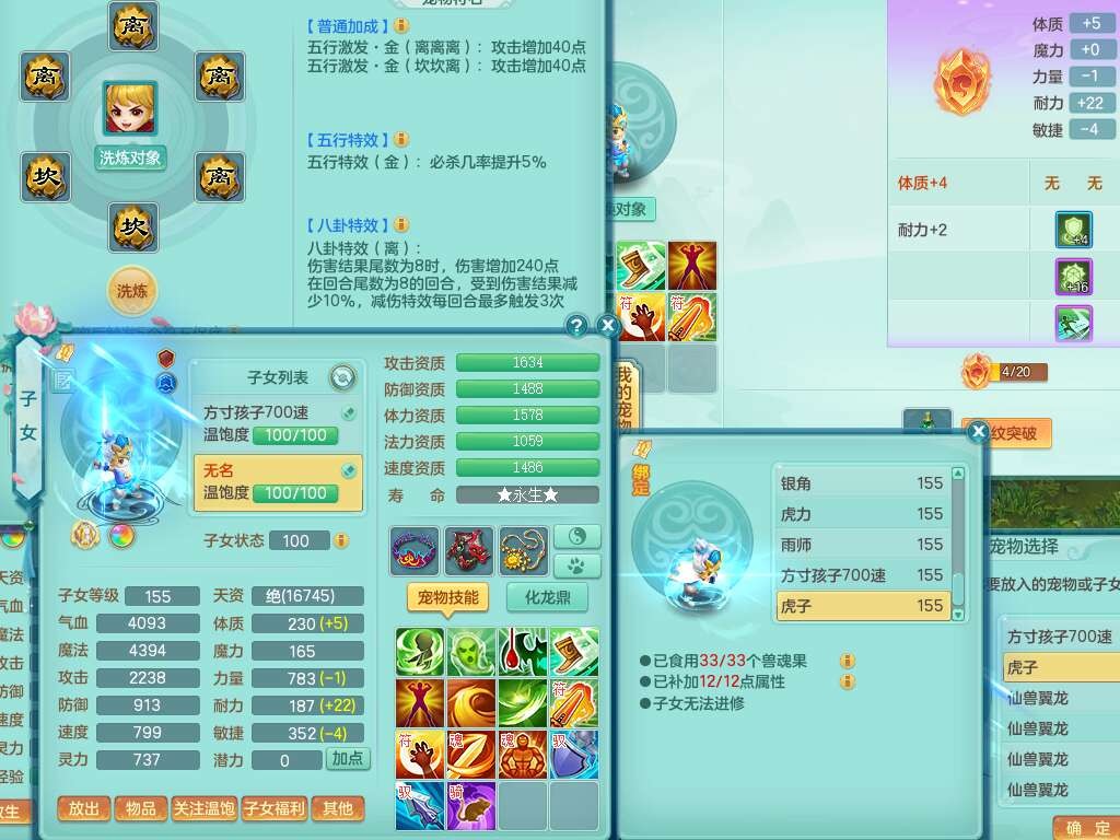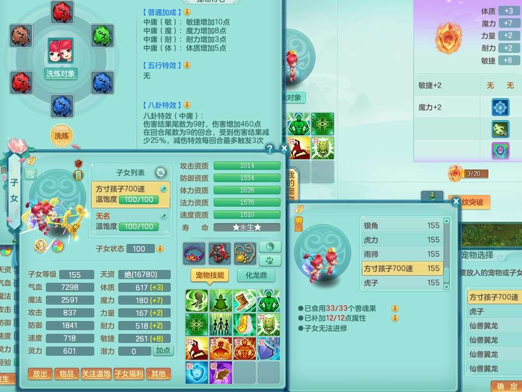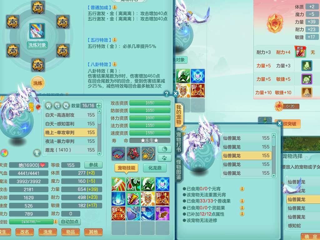 A22102龙腾九州159男方寸,精灵舞,5龙2内胆神,【10觉醒,已潜龙】,4位靓号不含4,2宠皮,4特殊(剑胆,藕断,上善,雷利),3只六技能镜花灵,1只六技能龙姬,愤怒易成长单加腰带,五特,5.5基础鼎+70攻+280血,14个永久格子,10个纯六字,1个五字,19只满果子,仓库还有35个果子,宠排在榜,经验在榜,永久称谓,2只双人坐骑,24天月卡。