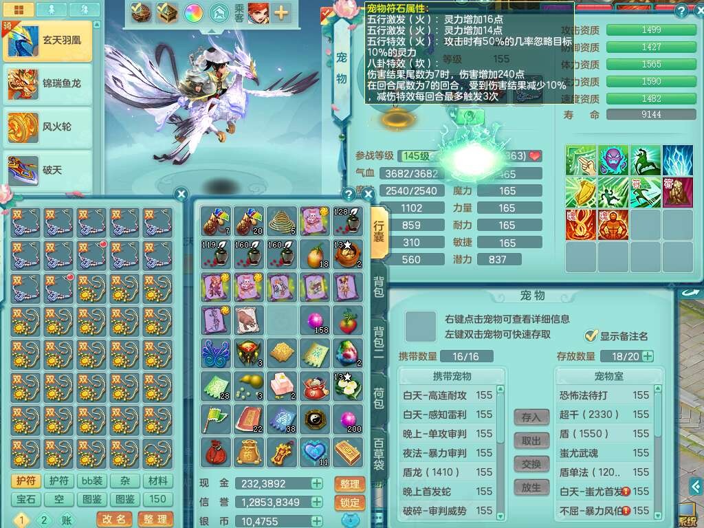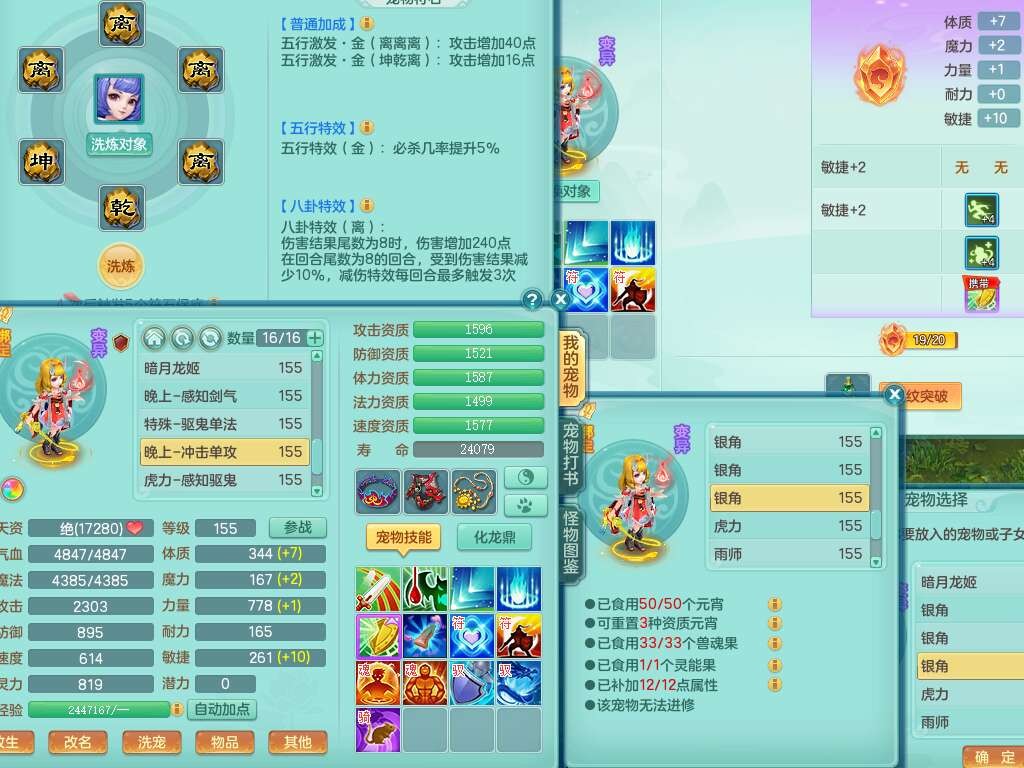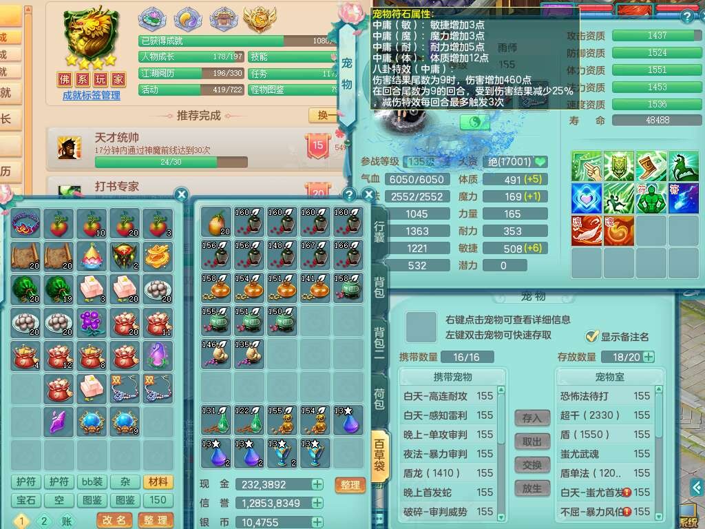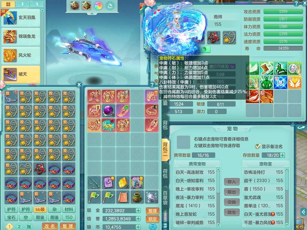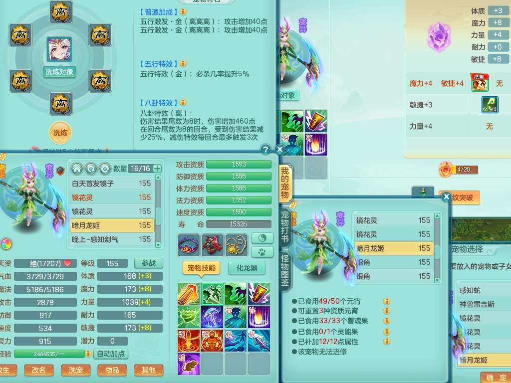 A22102龙腾九州159男方寸,精灵舞,5龙2内胆神,【10觉醒,已潜龙】,4位靓号不含4,2宠皮,4特殊(剑胆,藕断,上善,雷利),3只六技能镜花灵,1只六技能龙姬,愤怒易成长单加腰带,五特,5.5基础鼎+70攻+280血,14个永久格子,10个纯六字,1个五字,19只满果子,仓库还有35个果子,宠排在榜,经验在榜,永久称谓,2只双人坐骑,24天月卡。