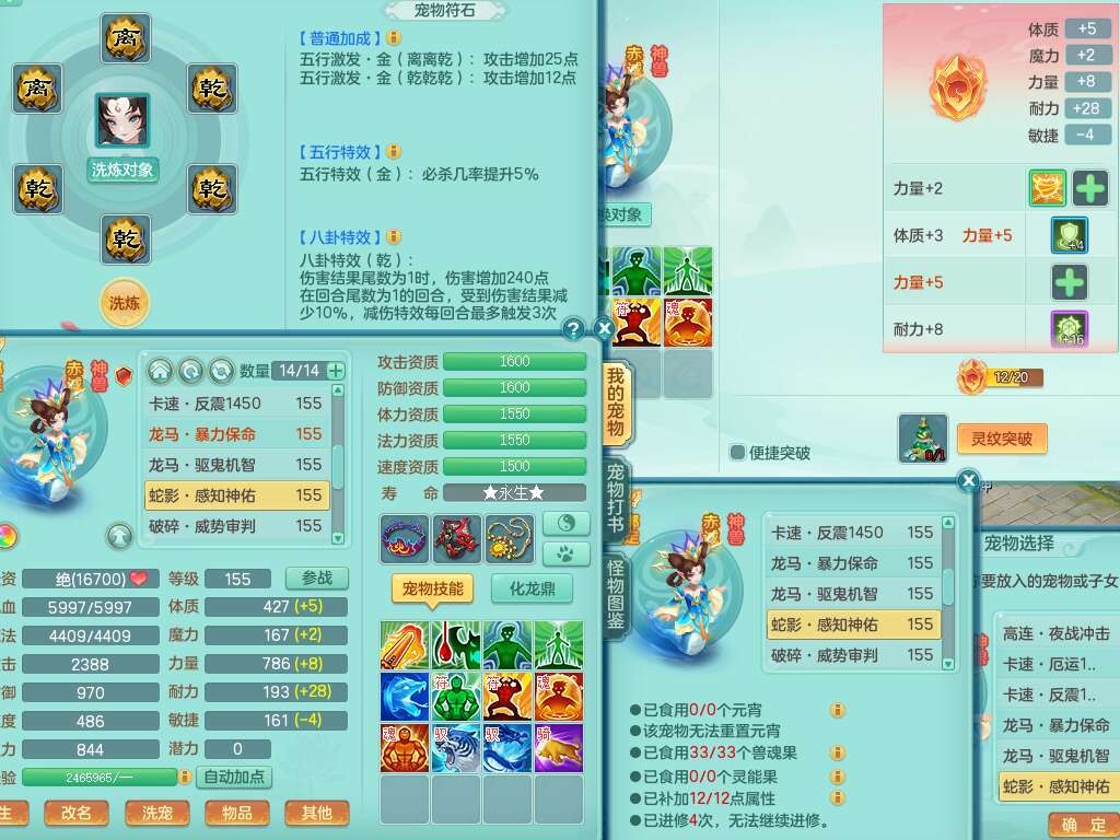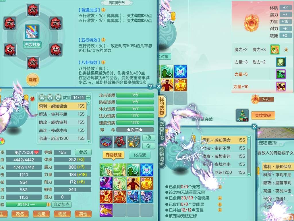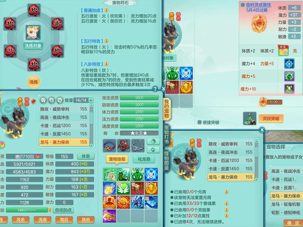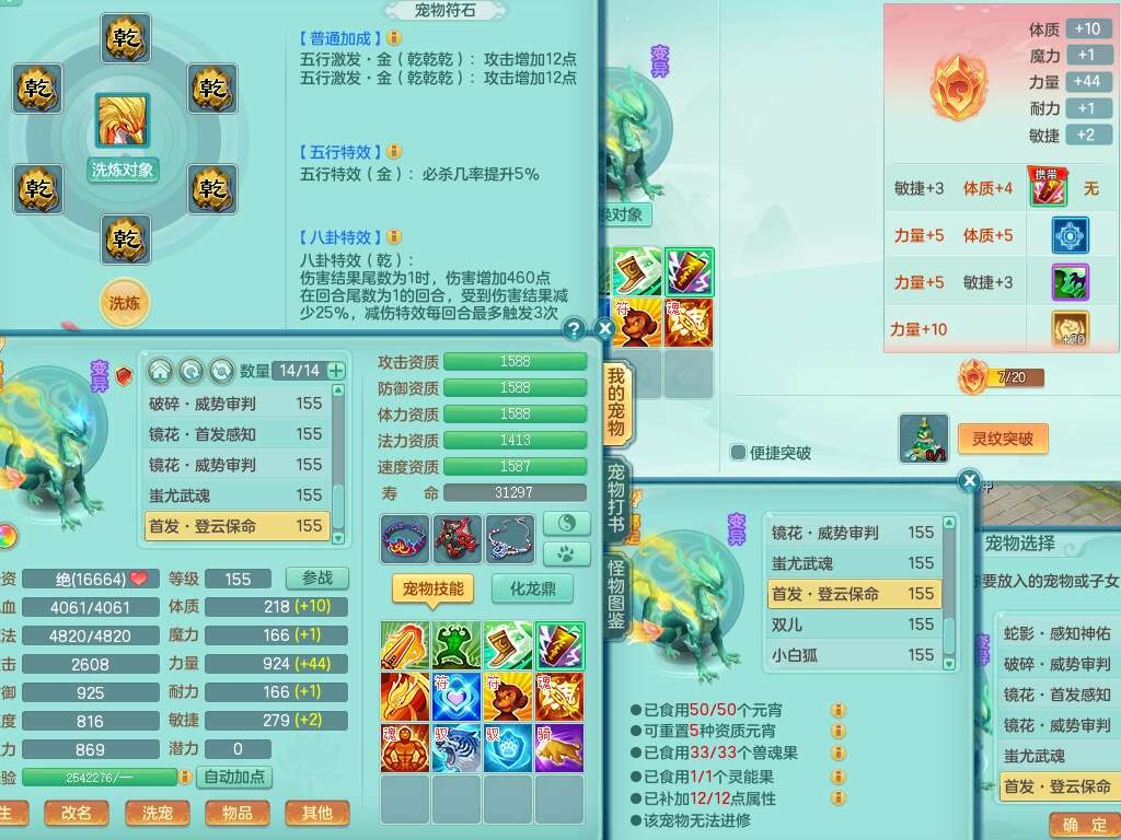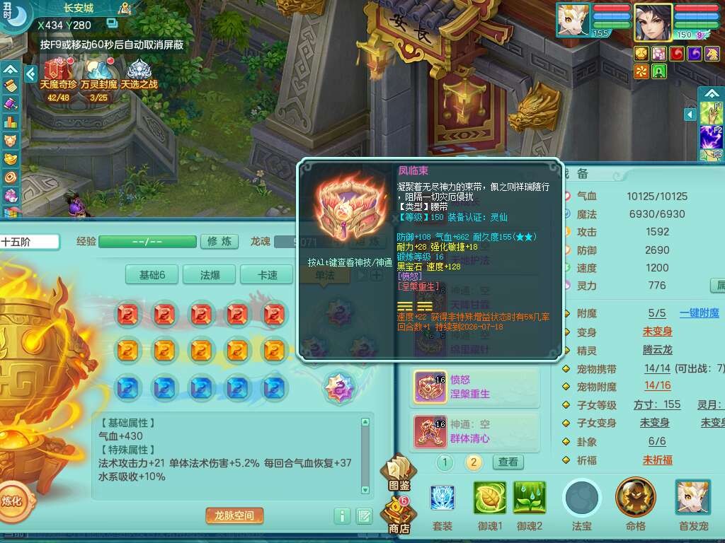 A22103彩云追月159男普陀,精灵舞,6龙4内胆神,3破镜,【12只觉醒,已潜龙】,2宠皮,1特殊(青霜),2只六技能龙姬,4只六技能镜花灵,愤怒六特,有把极品必杀五雷单加55武器,6.0基础鼎+70攻+280血,8.7法爆,2套符石,7个纯六字,4个五字,21只满果子,仓库还有157个果子,宠排在榜,7个坐骑,神驹心想事成+马上发财+火焰之力,月卡还有124天。
