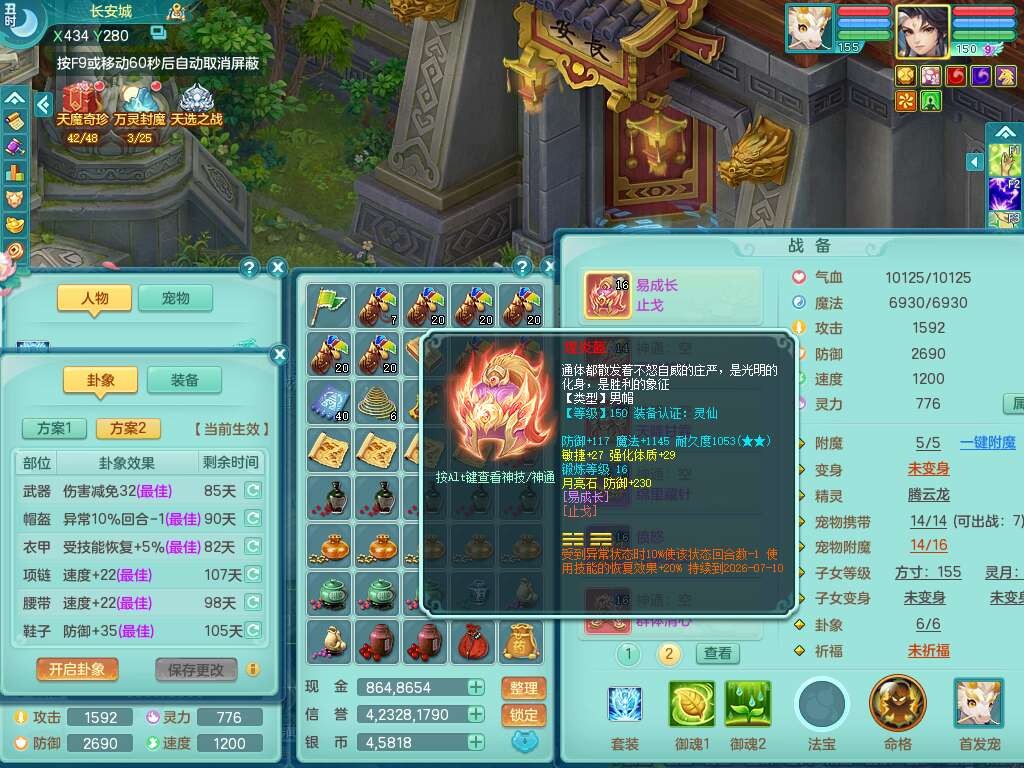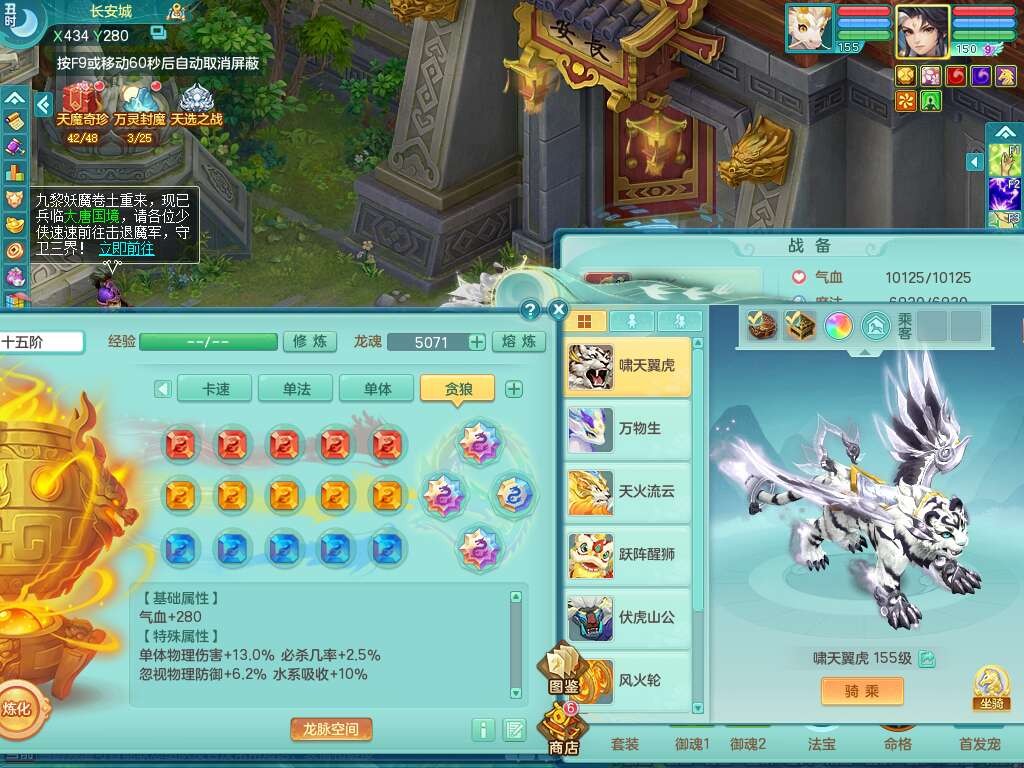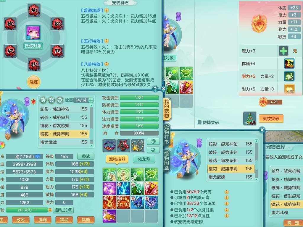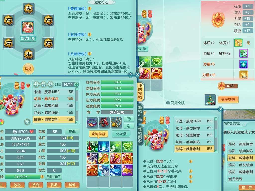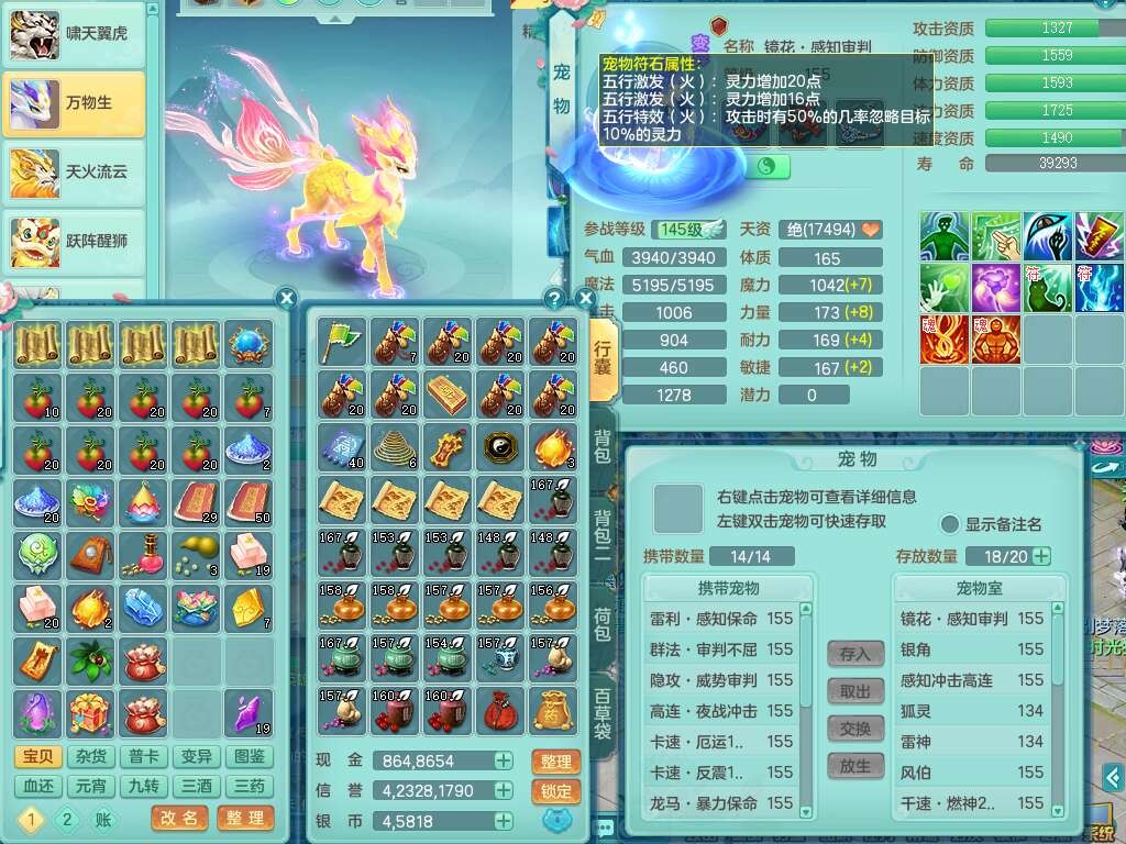 A22103彩云追月159男普陀,精灵舞,6龙4内胆神,3破镜,【12只觉醒,已潜龙】,2宠皮,1特殊(青霜),2只六技能龙姬,4只六技能镜花灵,愤怒六特,有把极品必杀五雷单加55武器,6.0基础鼎+70攻+280血,8.7法爆,2套符石,7个纯六字,4个五字,21只满果子,仓库还有157个果子,宠排在榜,7个坐骑,神驹心想事成+马上发财+火焰之力,月卡还有124天。