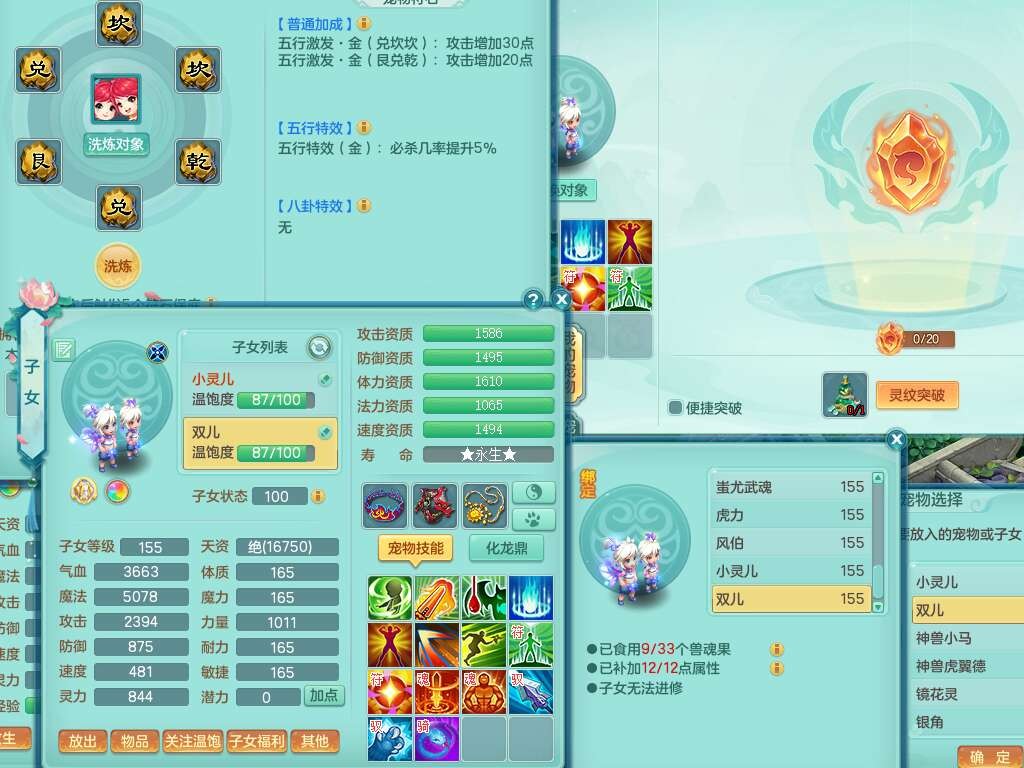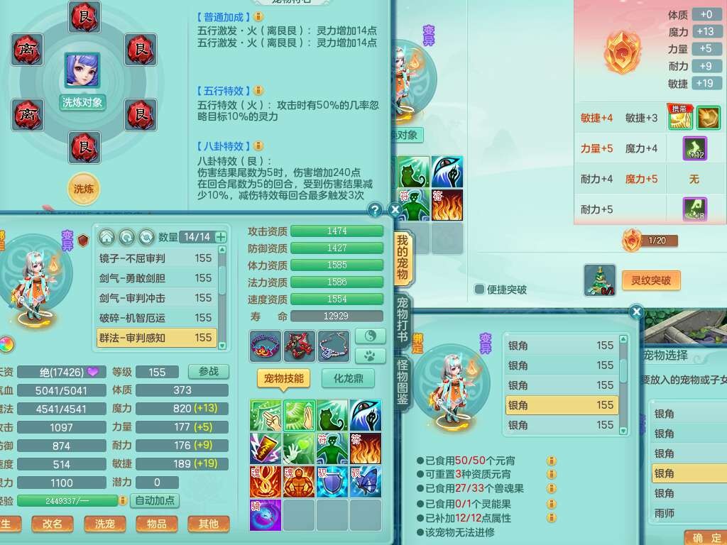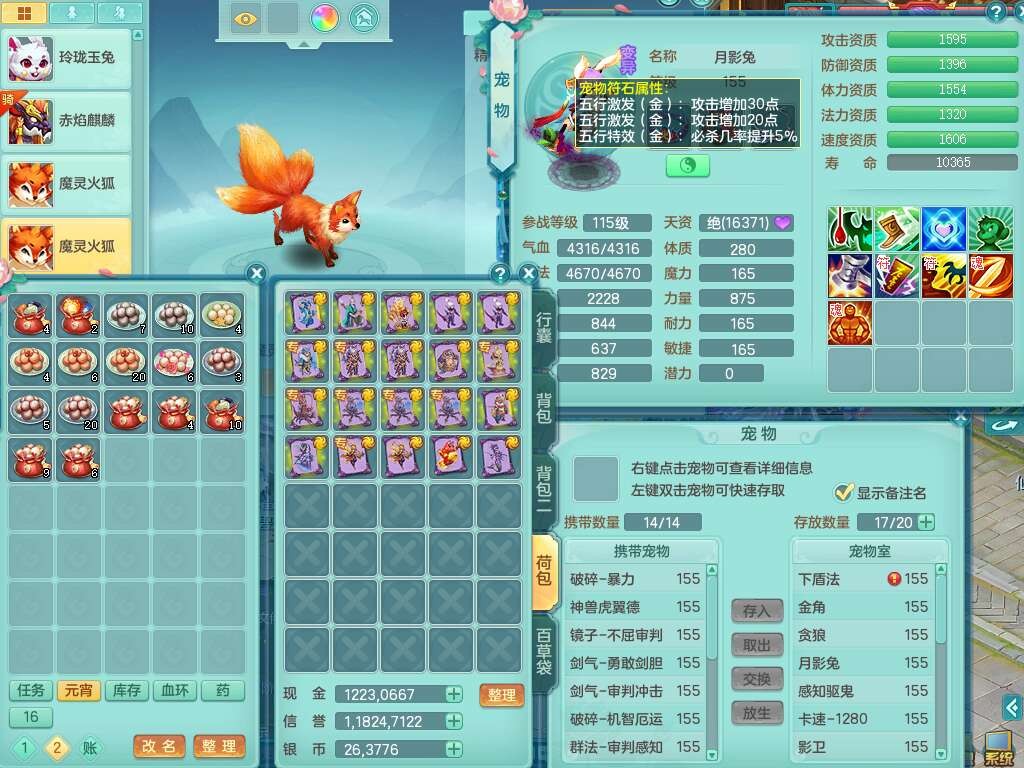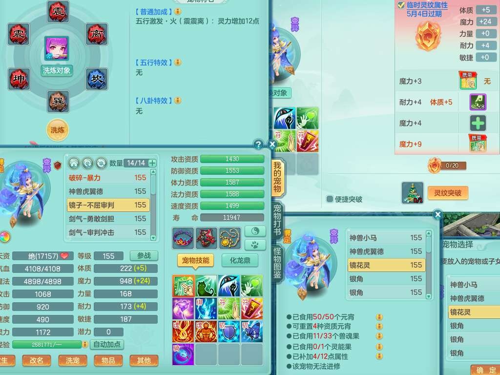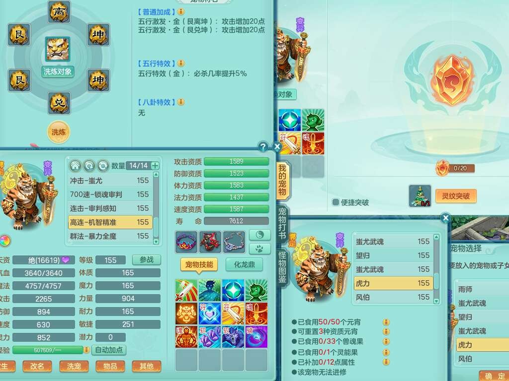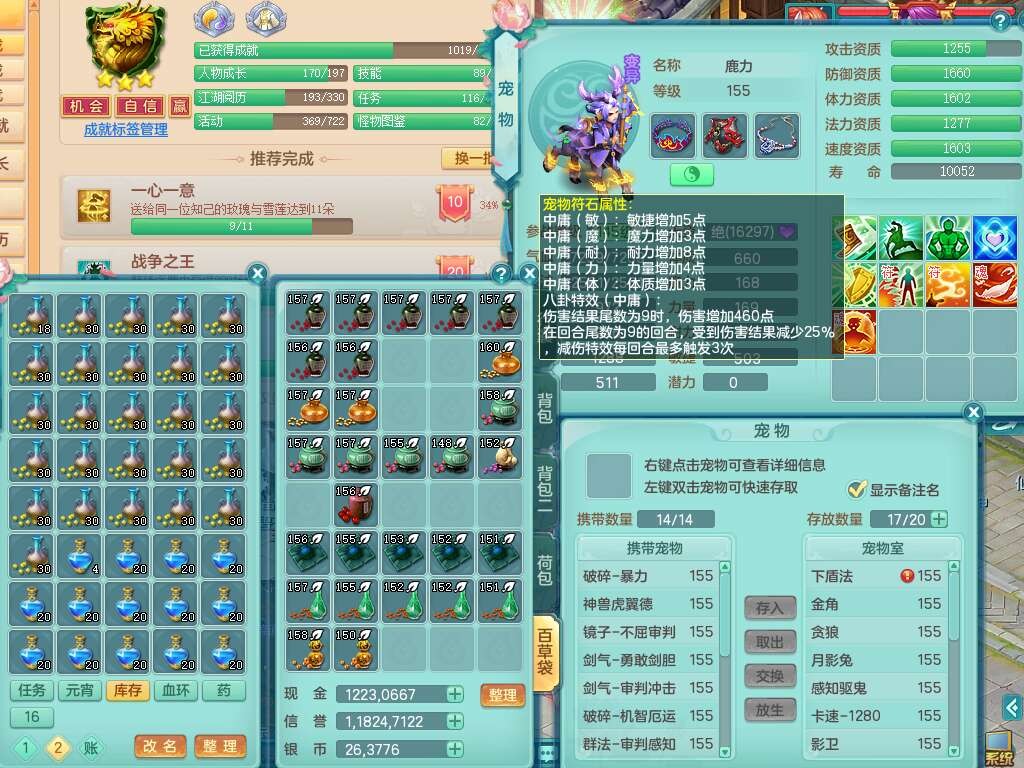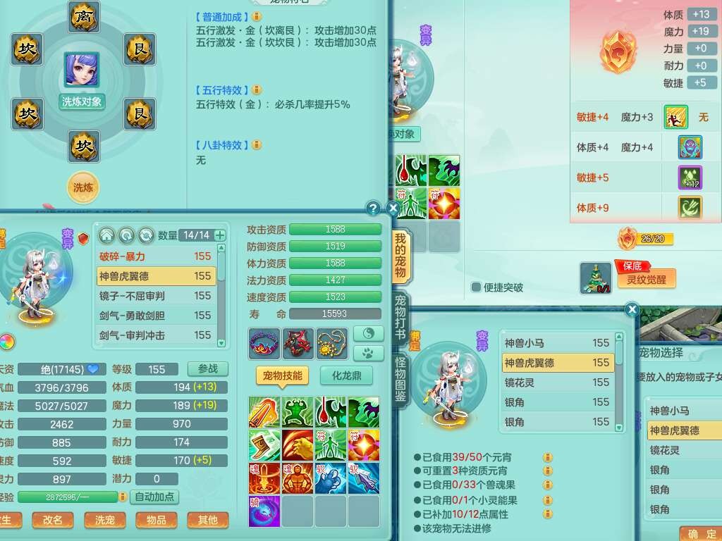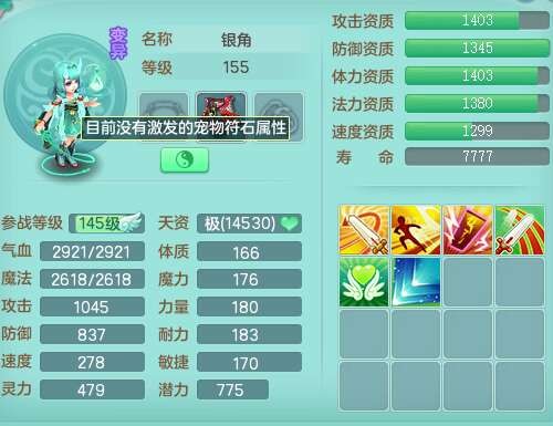 S22092扬名立万159男万兽,精灵歌,1内胆神,4觉醒,1宠皮,4特殊(剑胆,锤子,以战,虎虎),1只六技能镜花灵,易成长单加53头,904三红必杀易成长野兽武器,神佑单加50项链,易成长单加55腰带,有易成长单加55衣服,4.5基础鼎,13个永久格子,9只满果子,2只双人坐骑,22个仙兽蛋。